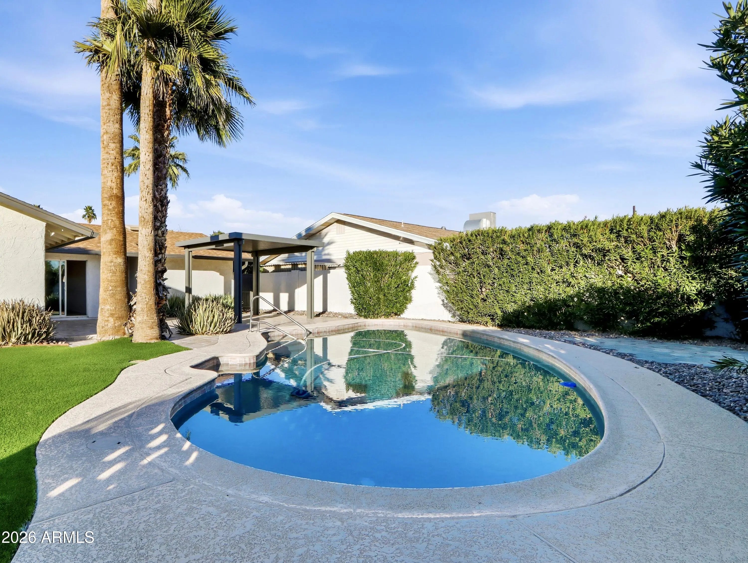 3 bed, 2 bath single-level home with 1,396 sq ft and a large pool on a 7,291 sq ft lot, built in 1971, located in the AirBnb capitol of the country, South Scottsdale. Near Old Town and Arcadia, this home has a functional floor plan with tile flooring and updated kitchen finishes. NO HOA. The backyard was recently improved with a larger metal pergola, travertine tile patio, turf, and putting green, offering a low-maintenance outdoor space for everyday use or entertaining. No HOA. Convenient access to dining, shopping, and major freeways. Suitable for primary residence, second home, or investment.