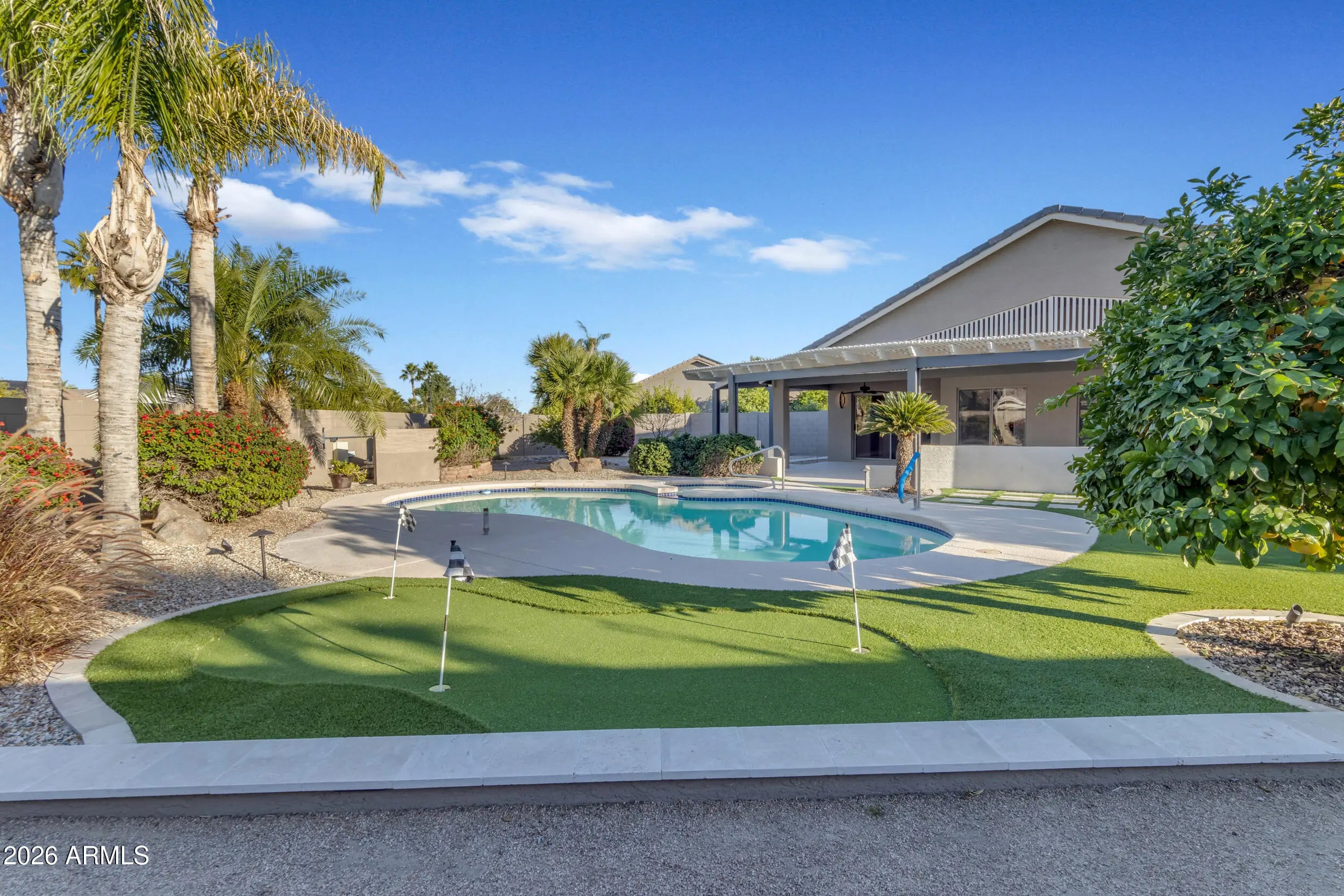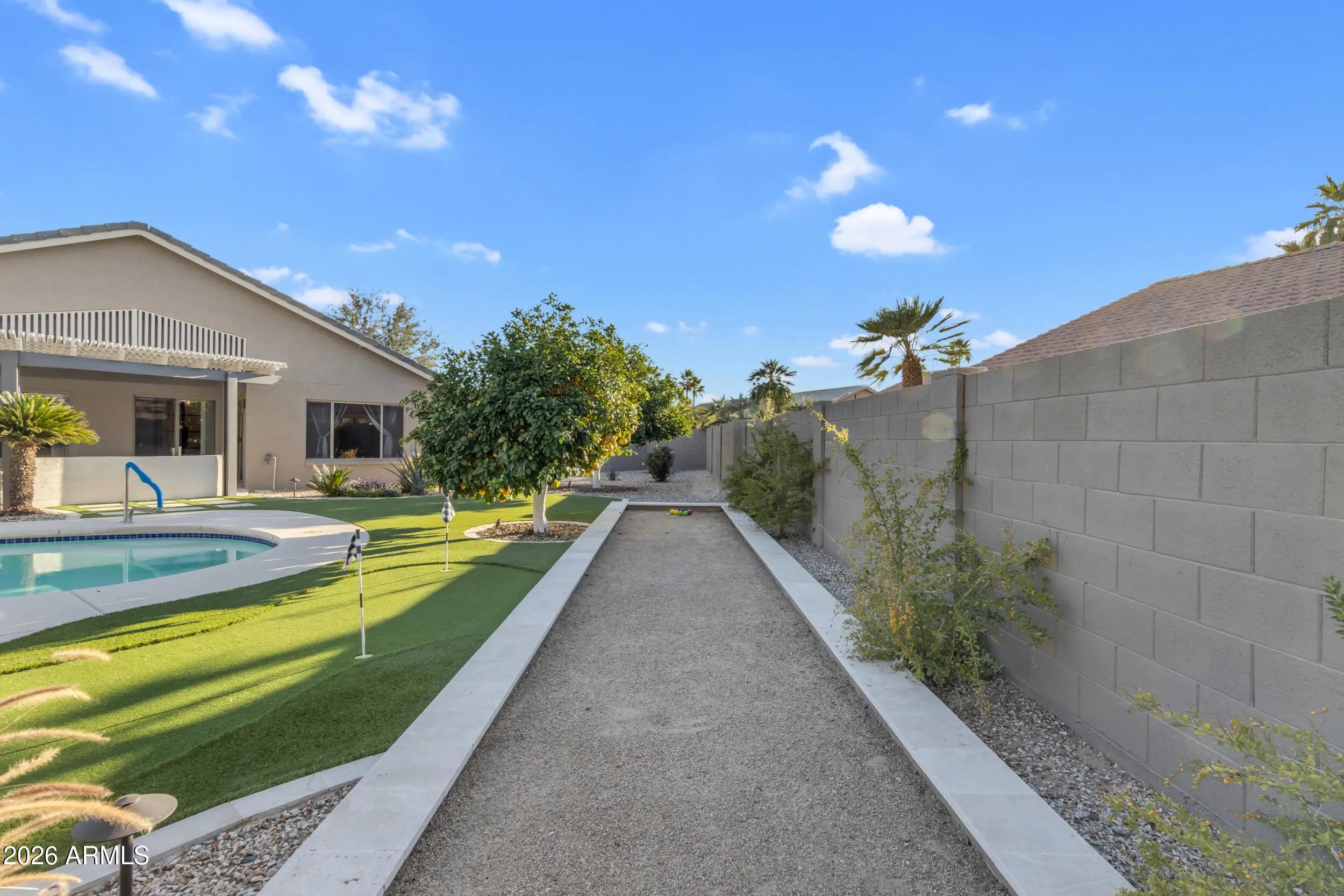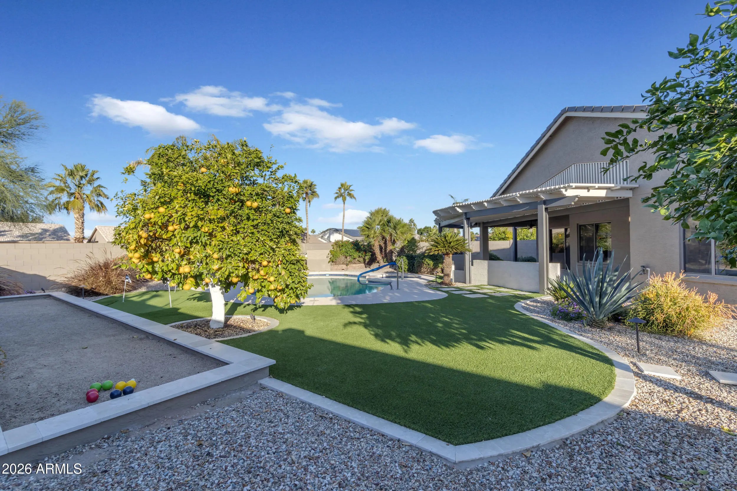 This beautiful home blends modern upgrades with resort-style outdoor living. NEW roof underlayment AND TILES, interior & exterior paint with exterior stone accents. Expansive backyard is an entertainer's dream, featuring a bocce court, putting green & artificial grass. Mature landscaping with tangelo, grapefruit, lemon, lime & fig trees, 5 rose bushes & 6 palm trees. NEW pool filter system & Wi-Fi pump. NEW Wi-Fi irrigation timer. NEW contemporary finishes throughout home - modern light fixtures & fans, tile flooring, baseboards & a striking iron arched office door. Upgraded kitchen boasts NEW professional-grade SS appliances, vented hood & wine refrigerator, perfect for entertaining. NEW tankless water heater & water softener. Golf Cart Garage. This exceptional property is a must see! This very Active Adult community includes 3-18 hole golf courses, 40+ pickleball & tennis courts, State of the Art Fitness Centers, Creative Arts Center, Multiple resort style pools and hot tubs, Theater with live performances, Casual dining, Billiards room, Bocce courts and more. Come take a look!