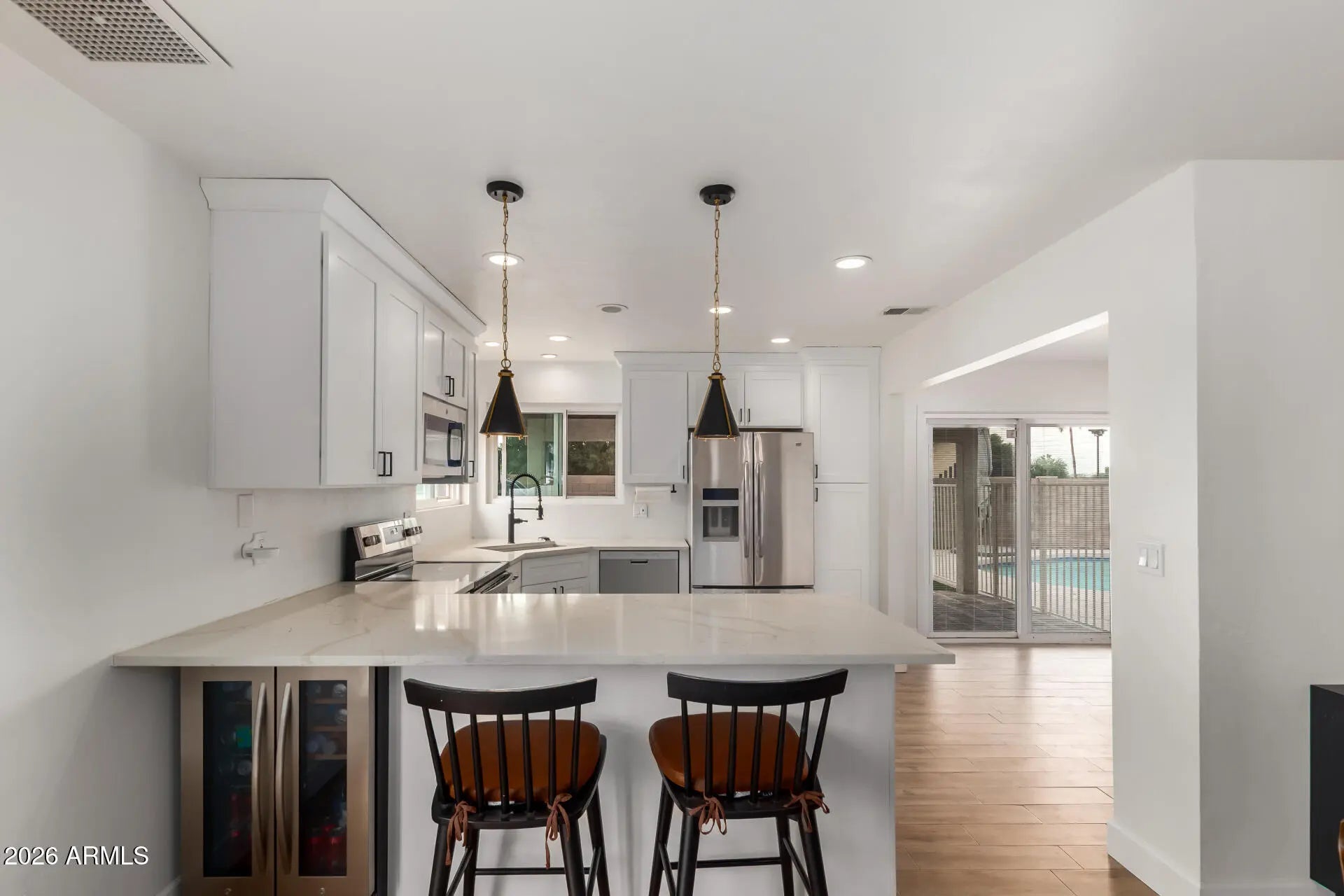 Beautifully renovated and move-in ready, this home features a refreshing Pebble Tec diving pool, creating the ultimate private backyard retreat with no neighbors behind. Offering 1,668 sq.ft. of thoughtfully designed living space, 3 bedrooms, 2 bathrooms, a spacious living room, and a formal dining area. Modern finishes shine throughout, including plank flooring, crisp interior paint, recessed ceiling lighting, and stylish light fixtures. The sleek, updated kitchen is a true highlight with quartz countertops, white cabinetry, stainless steel appliances, and a convenient breakfast bar. The inviting primary suite includes an en suite bathroom with dual vanities and a tub/shower combo. Step outside to a covered patio overlooking low-maintenance artificial artificial turf and the sparkling pool, perfect for entertaining, relaxing, or enjoying Arizona's sunny days! Ideally located just minutes from shopping, dining, schools, entertainment, recreation, and freeway access--this exceptional home is truly a must see!
