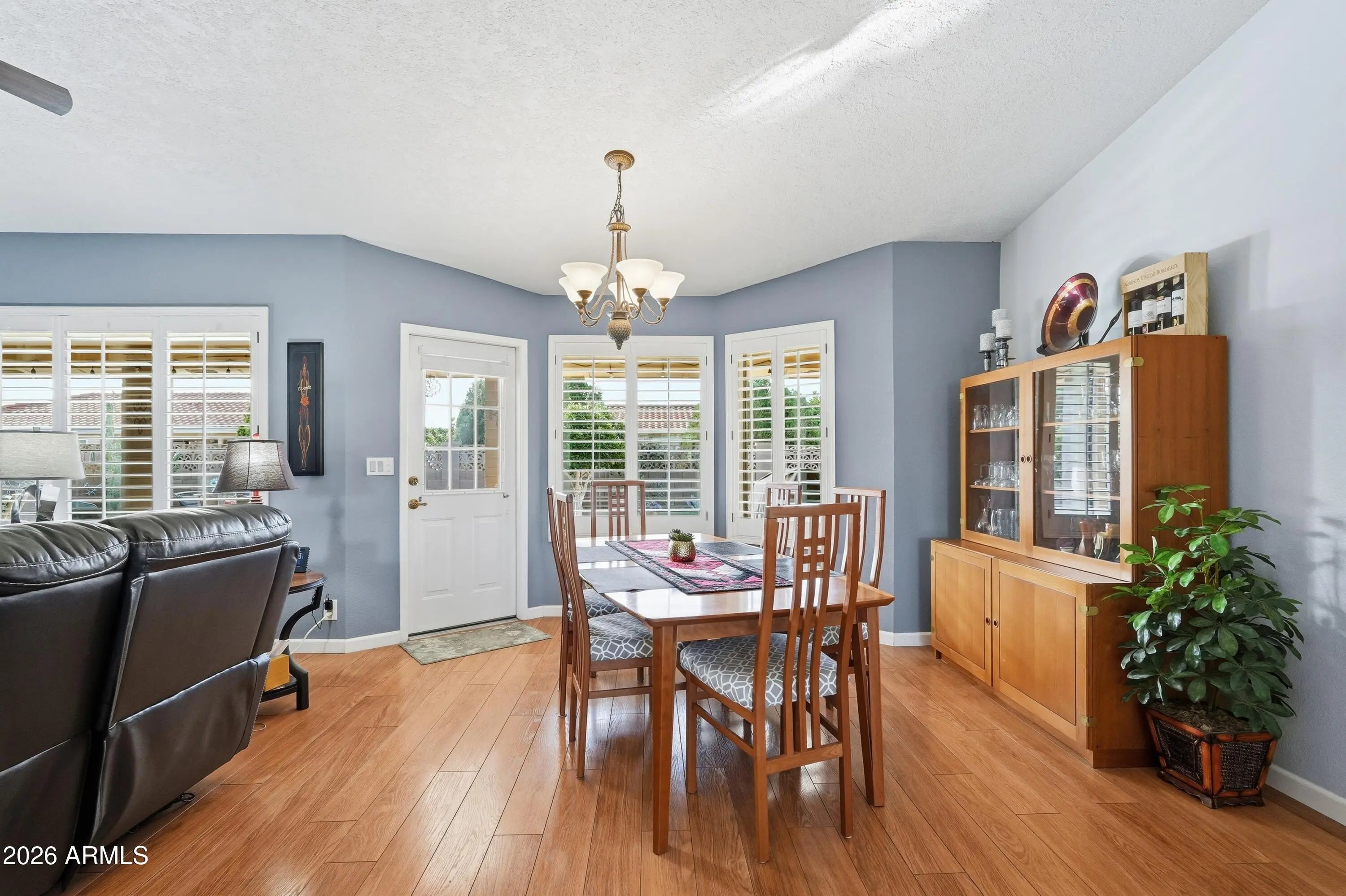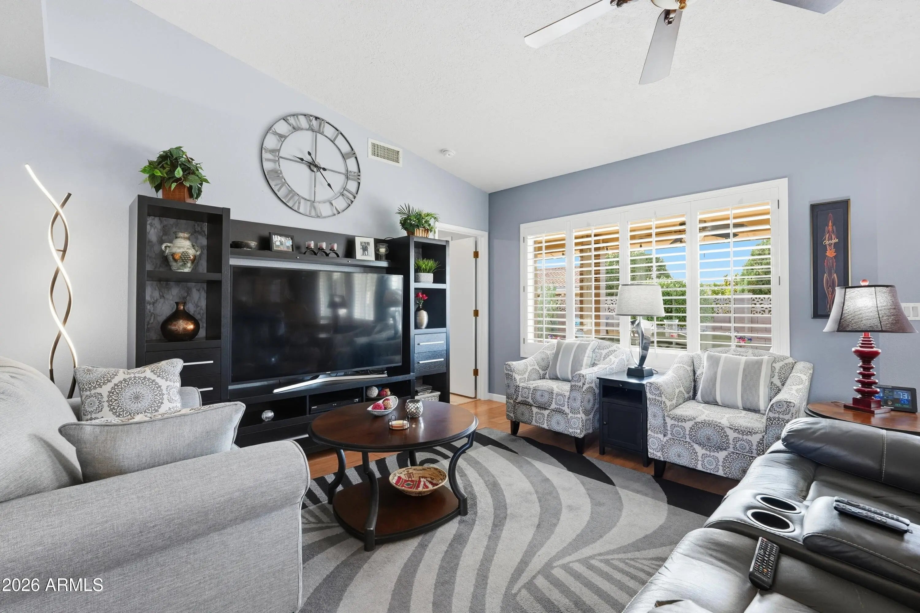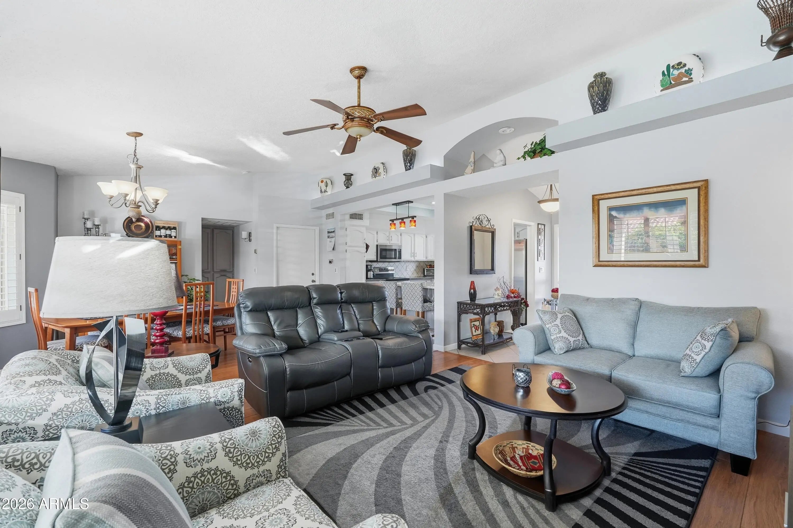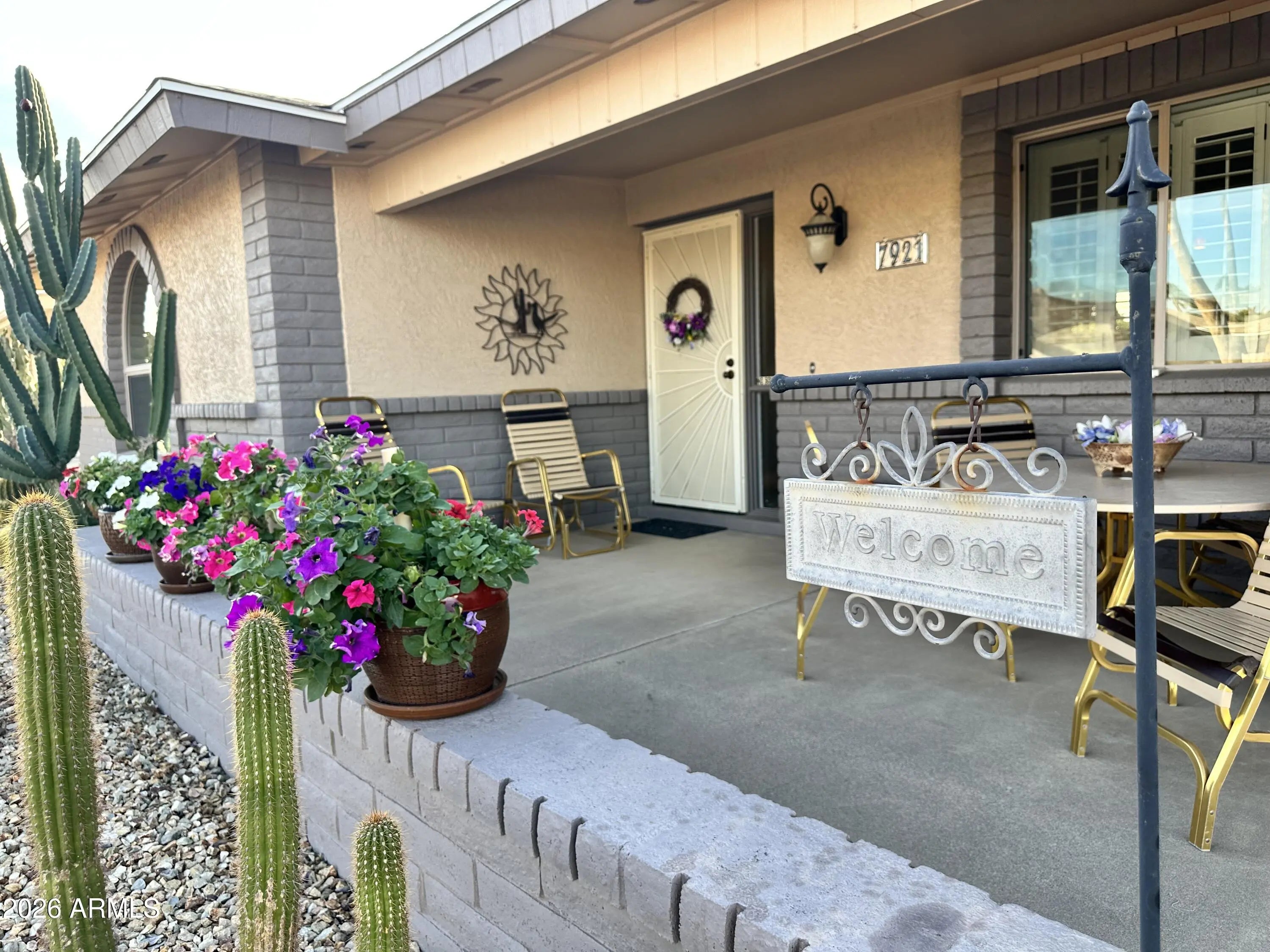 You'll love this beautifully updated, well-maintained, centrally located 2-bedroom, 2-bath home with office offering a modern color palette and one of SVE's most popular open floorplans. Offered fully furnished, this move-in-ready home lets you start enjoying the SVE lifestyle immediately. Enjoy mornings on the expanded north-facing front patio with sunshine and views of the Superstition Mountains. Inside, the open layout features updated finishes, vaulted ceilings, and abundant natural light. The open kitchen flows into the dining area and living room and includes painted cabinetry with new hardware, upgraded stainless steel appliances, and an island with eat-up seating. The bright living and dining areas are enhanced by dual-pane windows, plantation shutters, and lighted display shelving. The primary suite offers a walk-in closet, vanity area, private shower and toilet room, and direct access to the south-facing backyard. A spacious guest bedroom with walk-in closet is located next to the guest bath, creating a private guest suite. Just off the living room, a versatile office/den with a designer accent wall and south-facing window is ideal for a home office, hobbies, or third sleeping area. A large interior laundry room includes a utility sink, cabinetry, and workspace. The exceptionally landscaped south-facing backyard is designed for entertaining, featuring an expanded patio with multiple seating areas, BBQ, firepit table, campfire firepit, space heater, pull-down shade, and turf grass. An automatic three-zone irrigation system maintains the lush landscape and citrus trees. Additional highlights include an epoxy-floored double garage with built-in storage and workspace, 12-inch thick SVE walls for superior insulation, and numerous upgrades including dual-pane windows, interior and exterior paint, engineered hardwood flooring, added insulation, and a new roof in 2022.