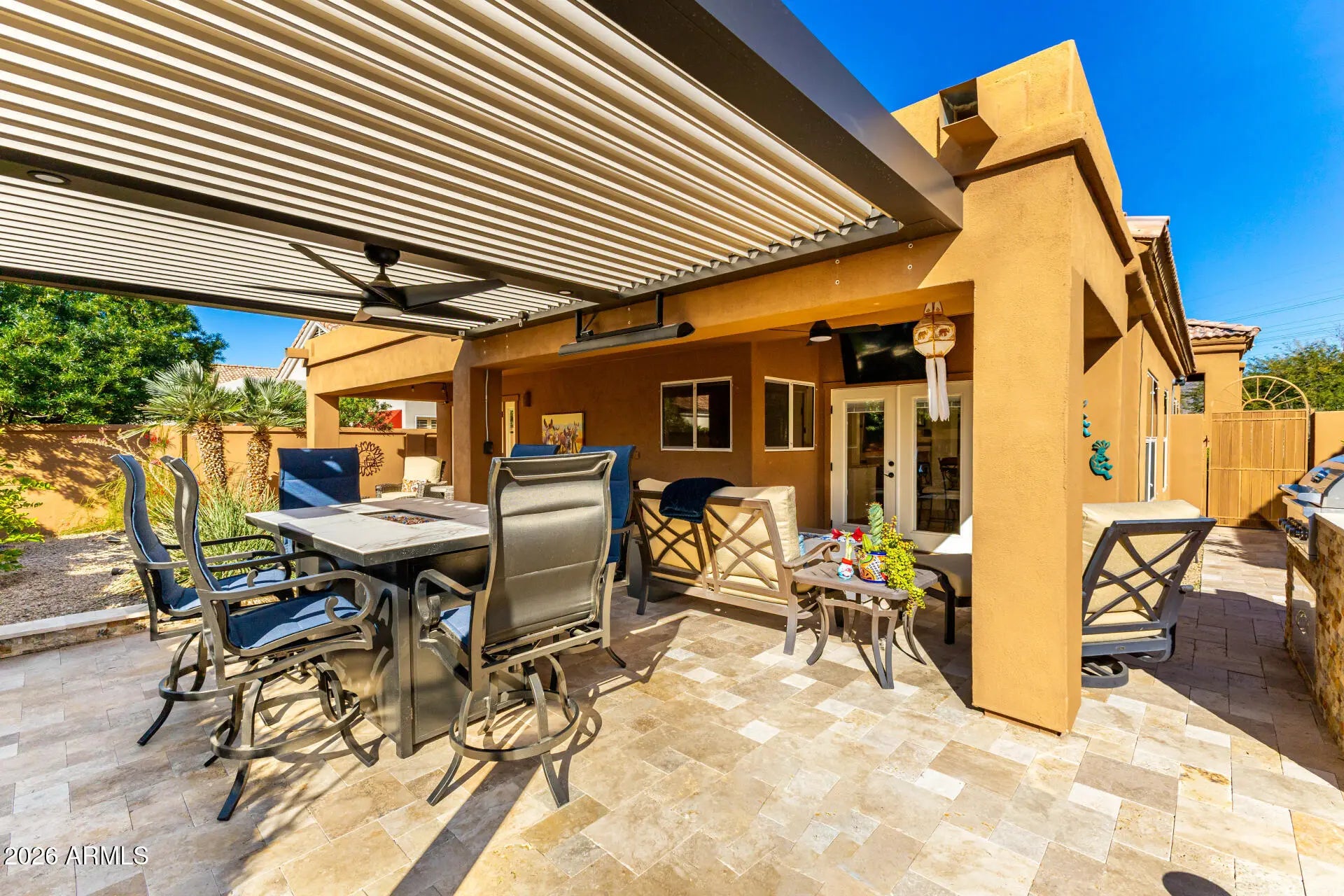 Rare opportunity to own at this price point in the 24 HR guard gated community of Stonegate. The community features a heated pool & spa, pickleball & tennis courts, children's playground, basketball court & community walking trails with close proximity to top retail, golf courses, freeway access and top Scottsdale school options. This home has been meticulously cared for and features a split floor plan with no interior steps with a newly improved backyard ideal for entertaining. See the 2nd photo for the floor plan layout. Home has many interior upgrades including updated custom cabinets, stainless steel appliances, travertine flooring, vaulted ceilings & has great natural light with a N/S exposure. Home has owned solar panels. An ideal lock & leave home with low maintenance costs.