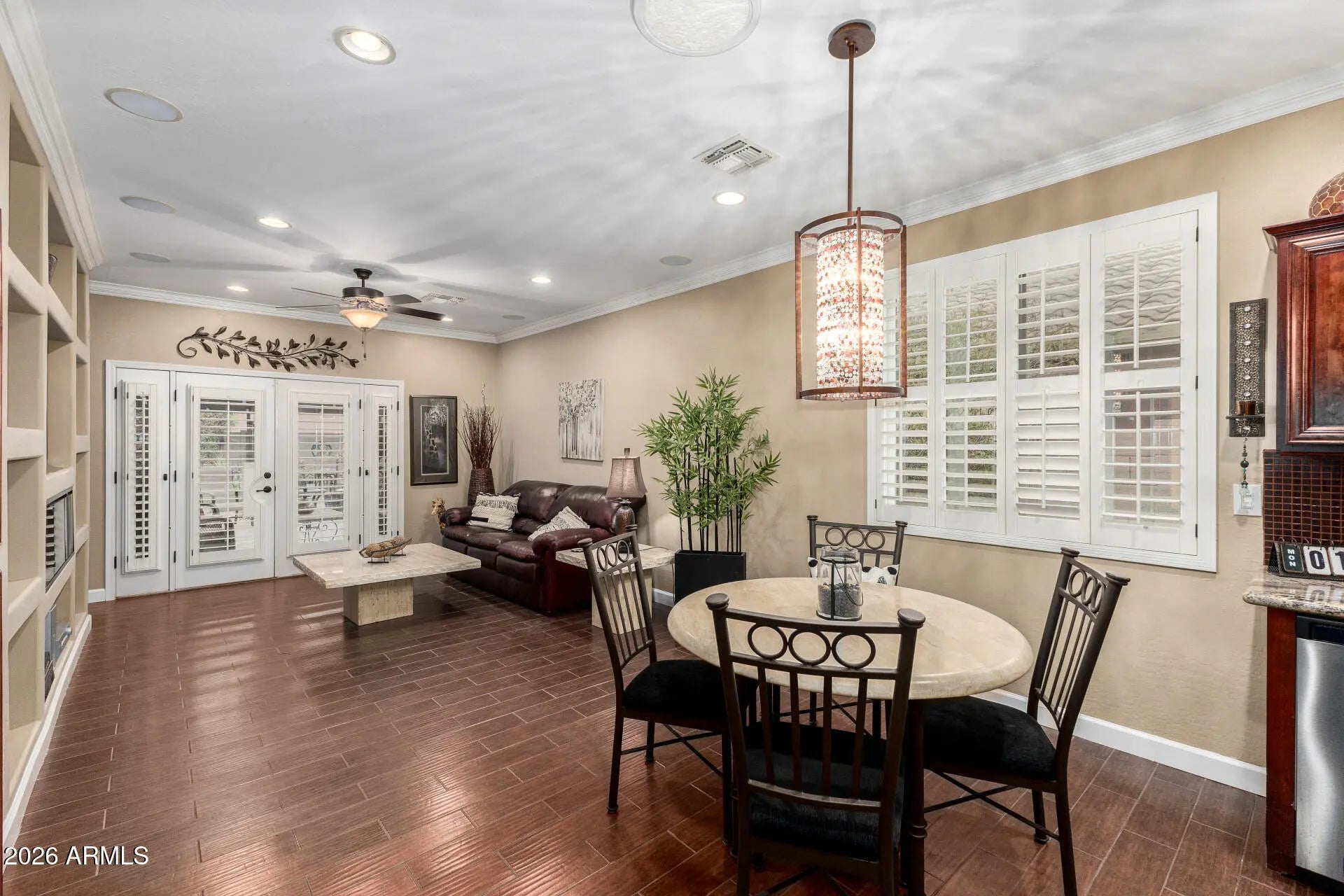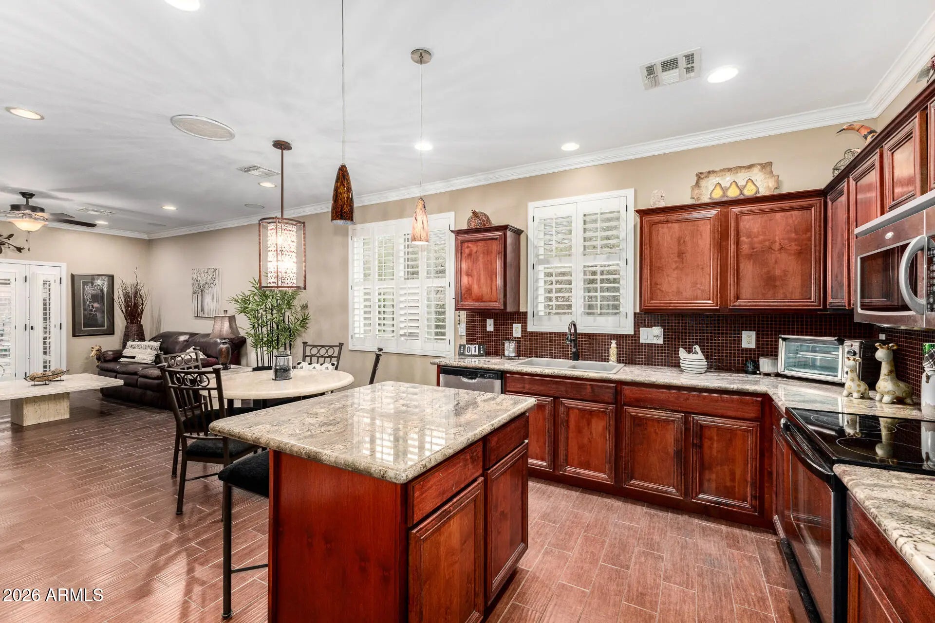 Beautifully maintained home featuring 9-foot ceilings and an open, light-filled layout. The interior showcases white shutters throughout and brand-new windows installed approximately 1.5 years ago, enhancing both energy efficiency and natural light. The spacious living area flows seamlessly into the kitchen and dining space, perfect for everyday living and entertaining. The kitchen offers warm cabinetry, ample counter space, and a functional layout overlooking the main living areas. Step outside to a private backyard oasis featuring low-maintenance turf, mature landscaping, and covered patio spaces ideal for relaxing or hosting guests. Thoughtfully designed outdoor living areas provide both shade and comfort year-round. This home blends comfort, style, and functionality.