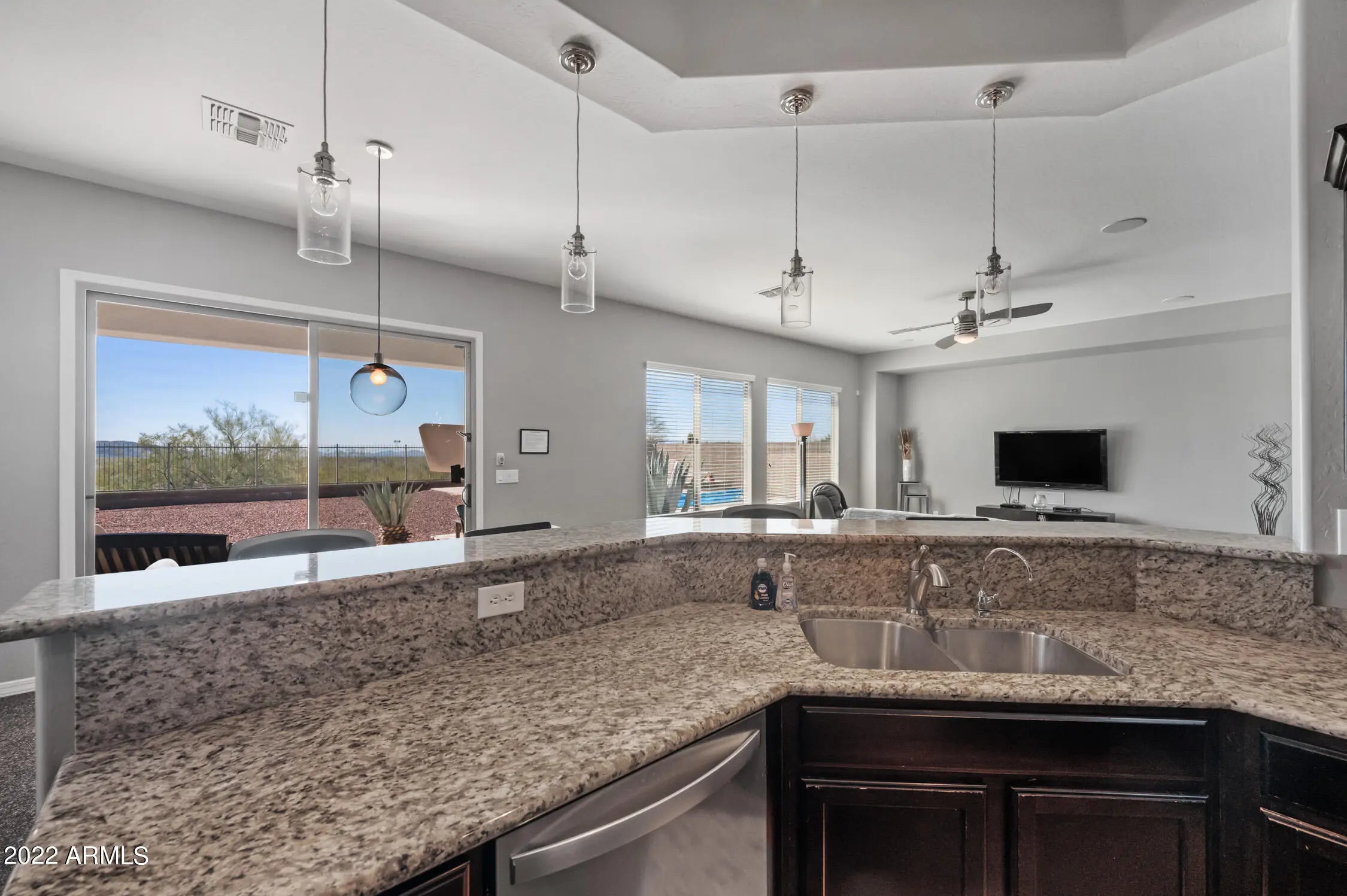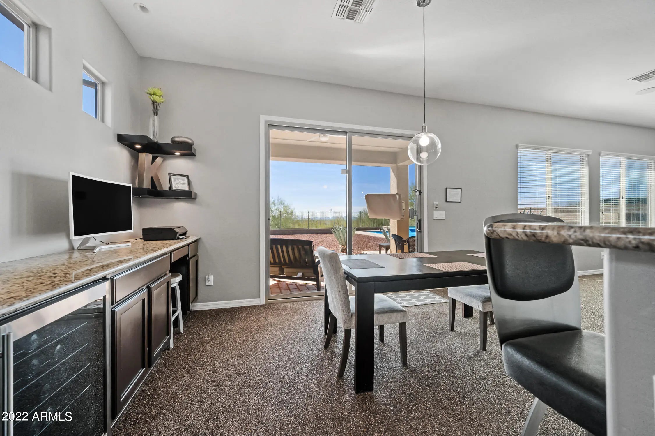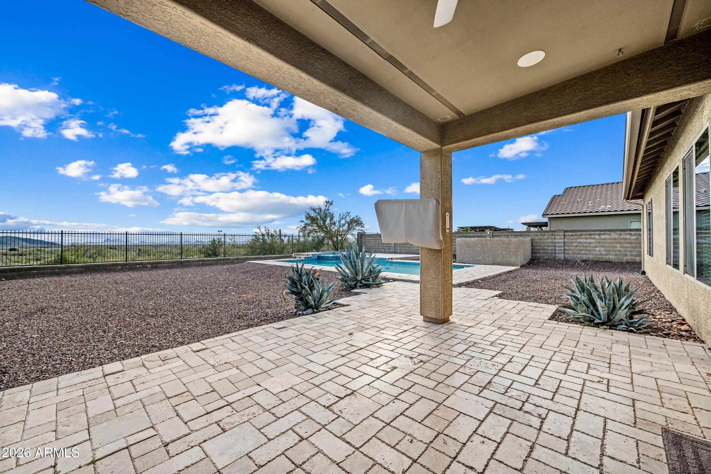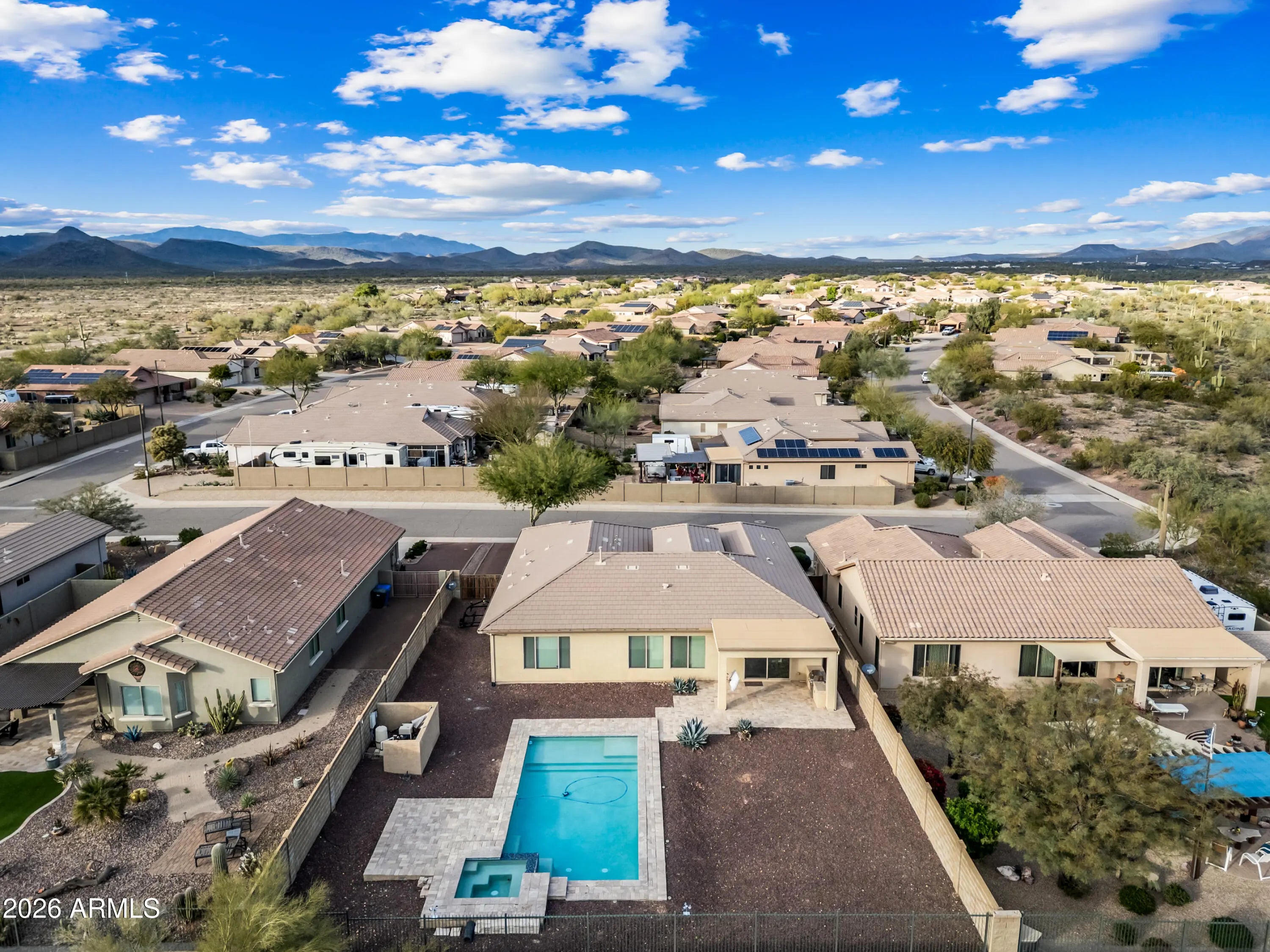 Unparalleled Sonoran Desert and mountain views from this stunning backyard retreat. Enter into an expansive great room with open living and entertaining space. Kitchen features granite countertops, upgraded cabinetry, and enhanced lighting. Natural slate and stone flooring throughout living areas, kitchen, bath, hallway, and laundry room. Built-in bar with wine refrigerator. Split primary bedroom and walk-in closet with oak hardwood flooring. Ceiling fans and south-facing backyard support energy efficiency. Surround sound in great room and covered patio. Laundry room includes utility sink. Backyard showcases exceptional southern views, PebbleTec pool and spa, travertine pavers, and gas BBQ—perfect for outdoor living. Located in Arroyo Grande. with an RV gate too. Enjoy all that Anthem offers: athletic fields, Big Splash Water Park, lap pool, large fitness center, tennis, pickleball and volleyball courts, skate park, and 16-acre catch-and-release lake. Close to TSMC and Lake Pleasant Recreation Area.