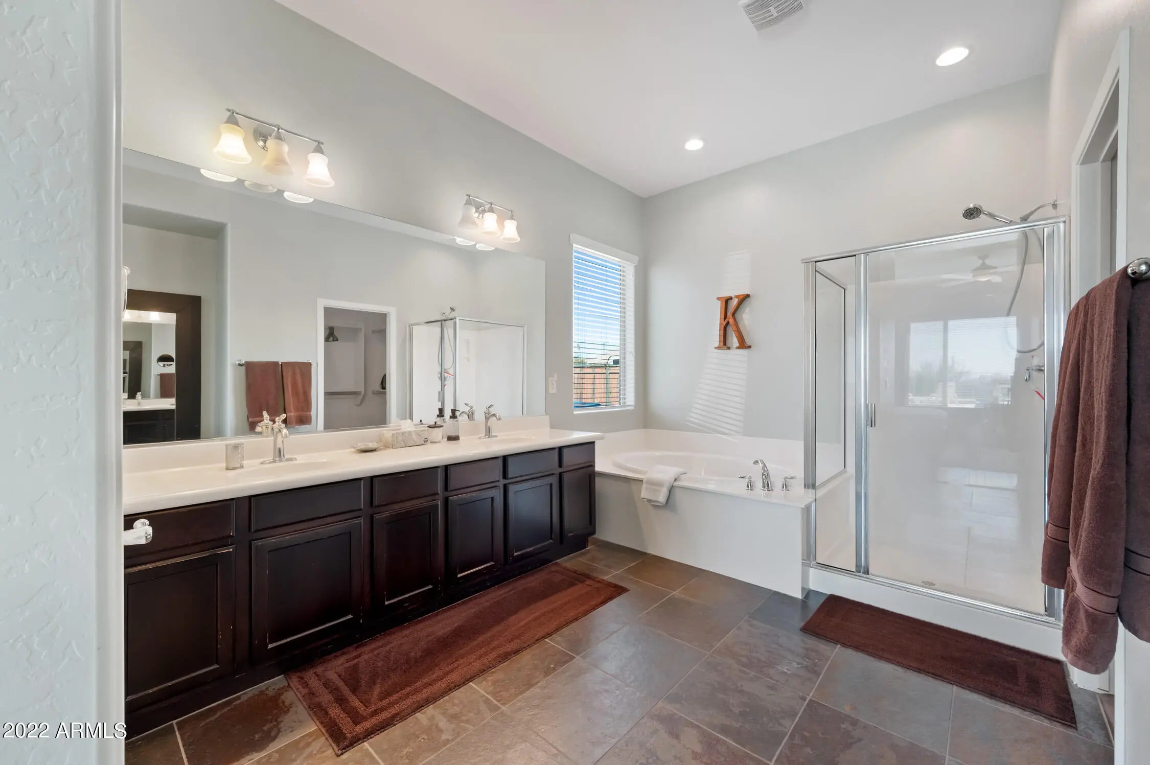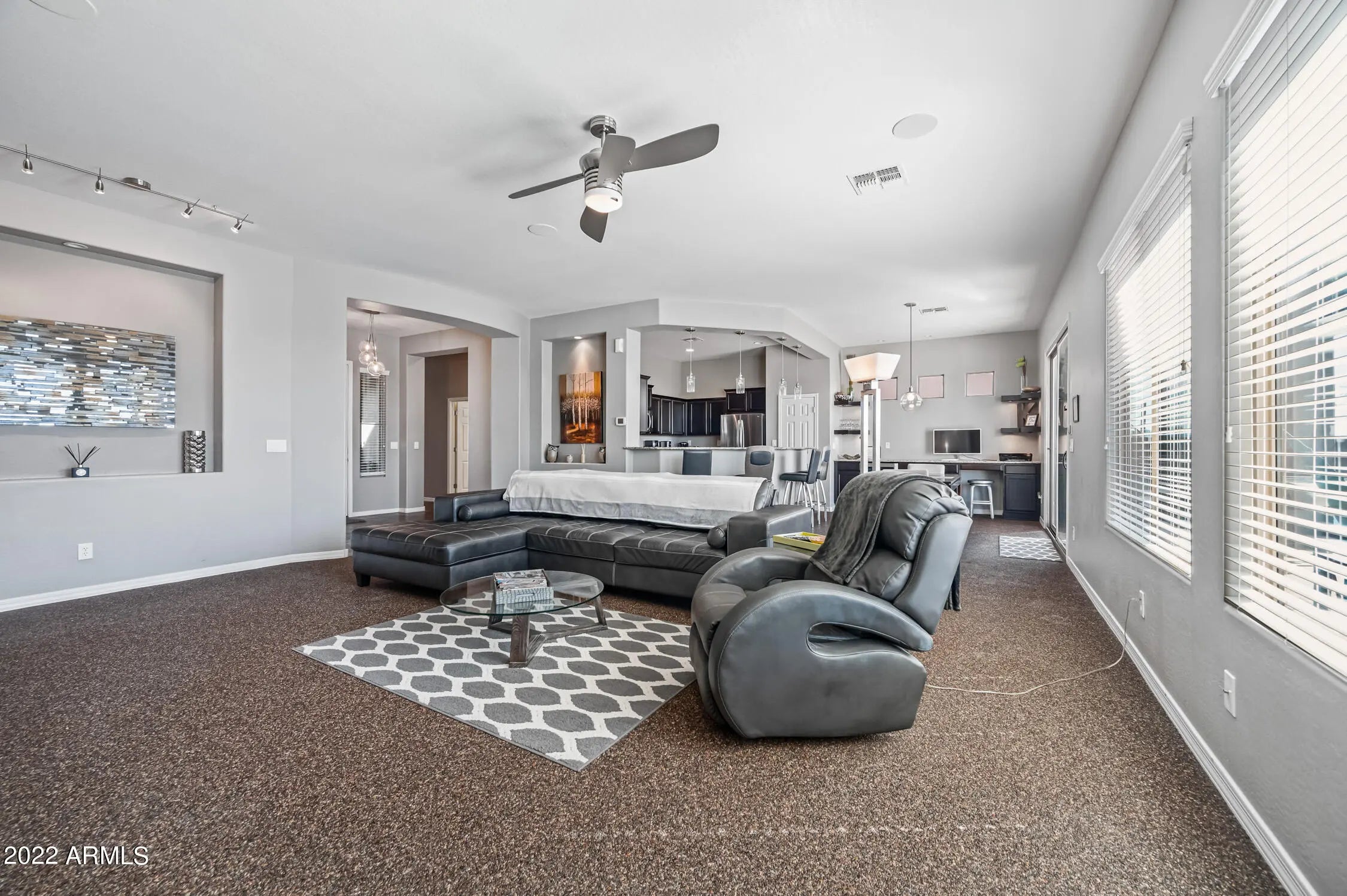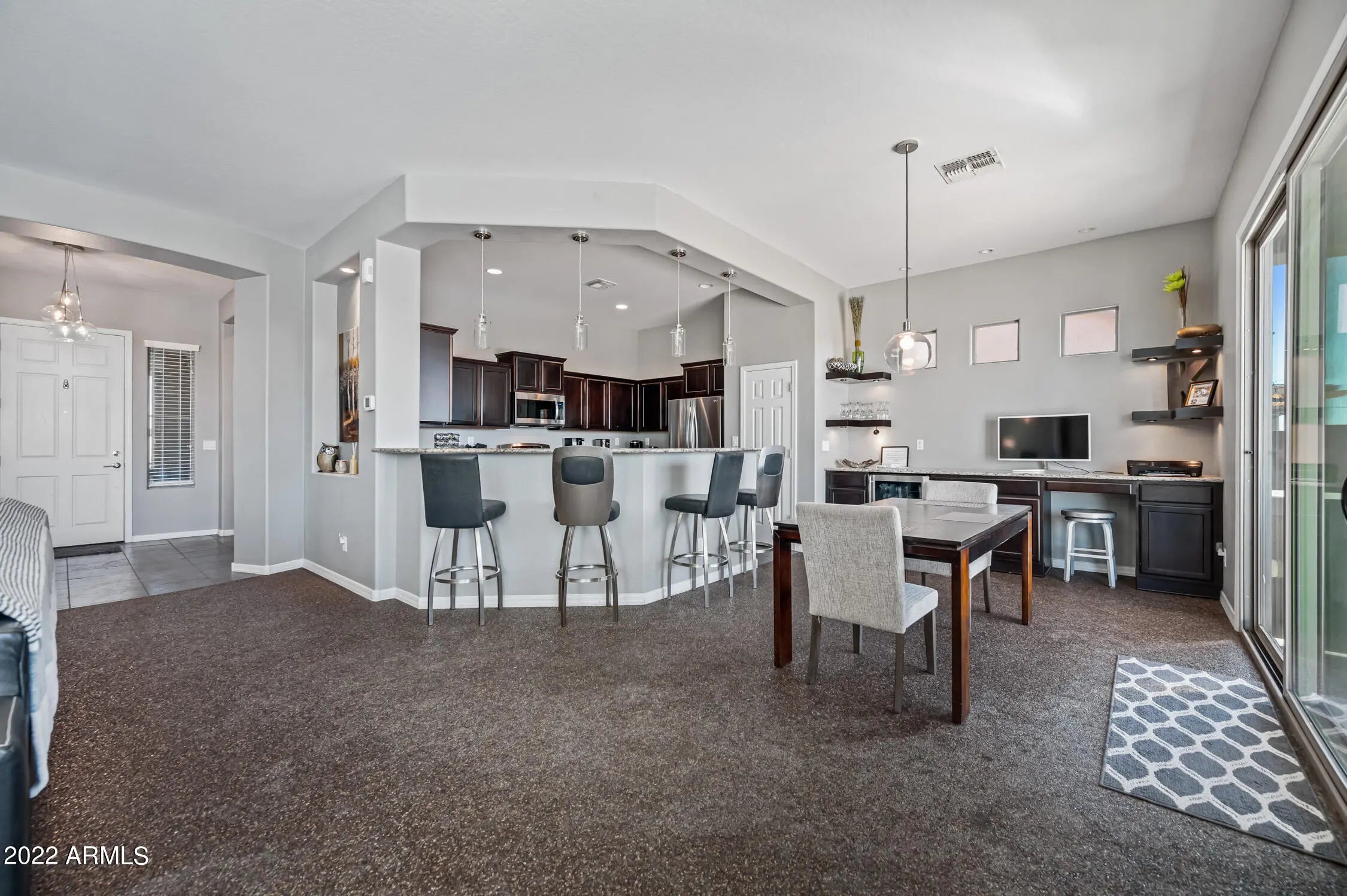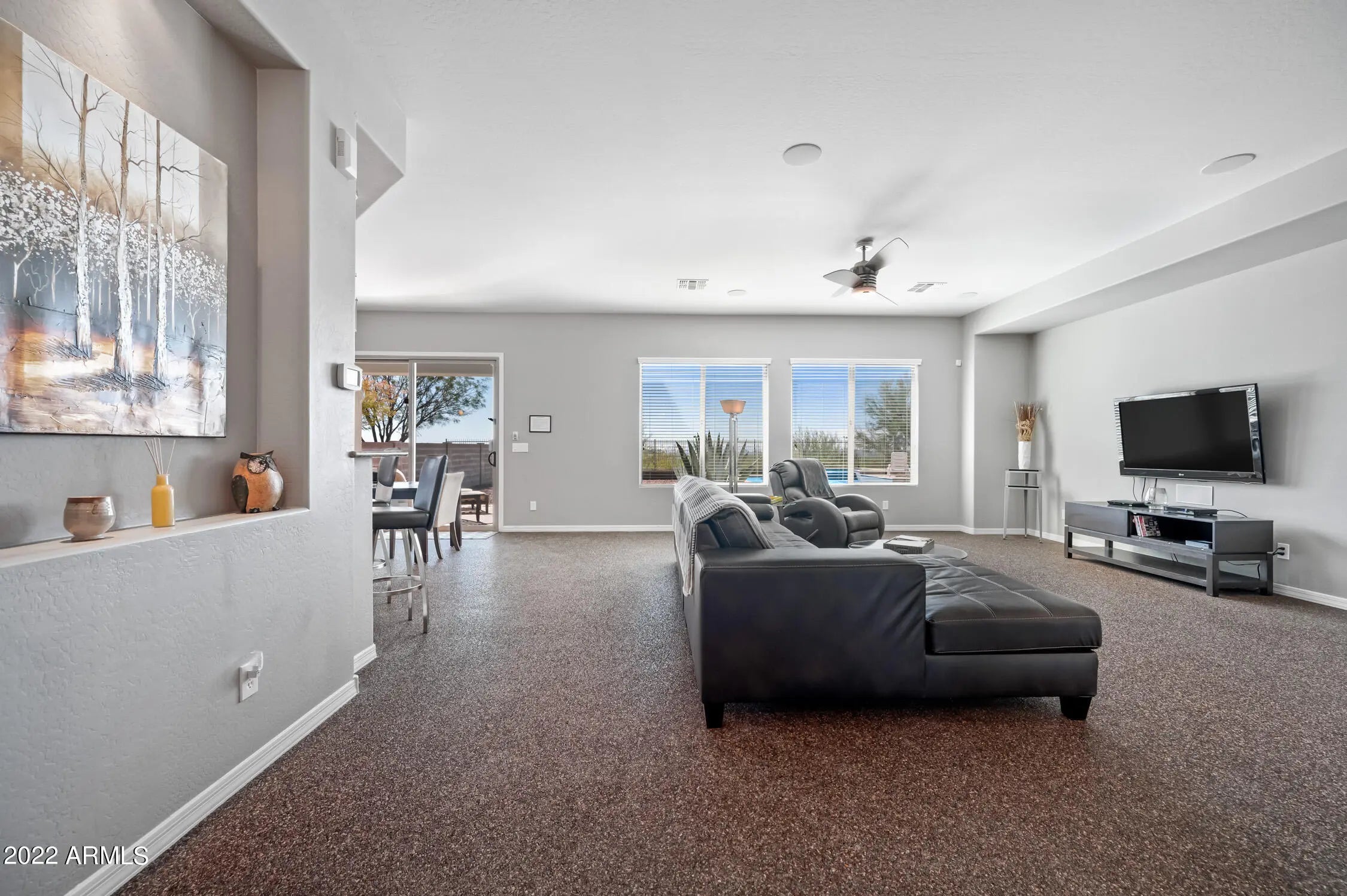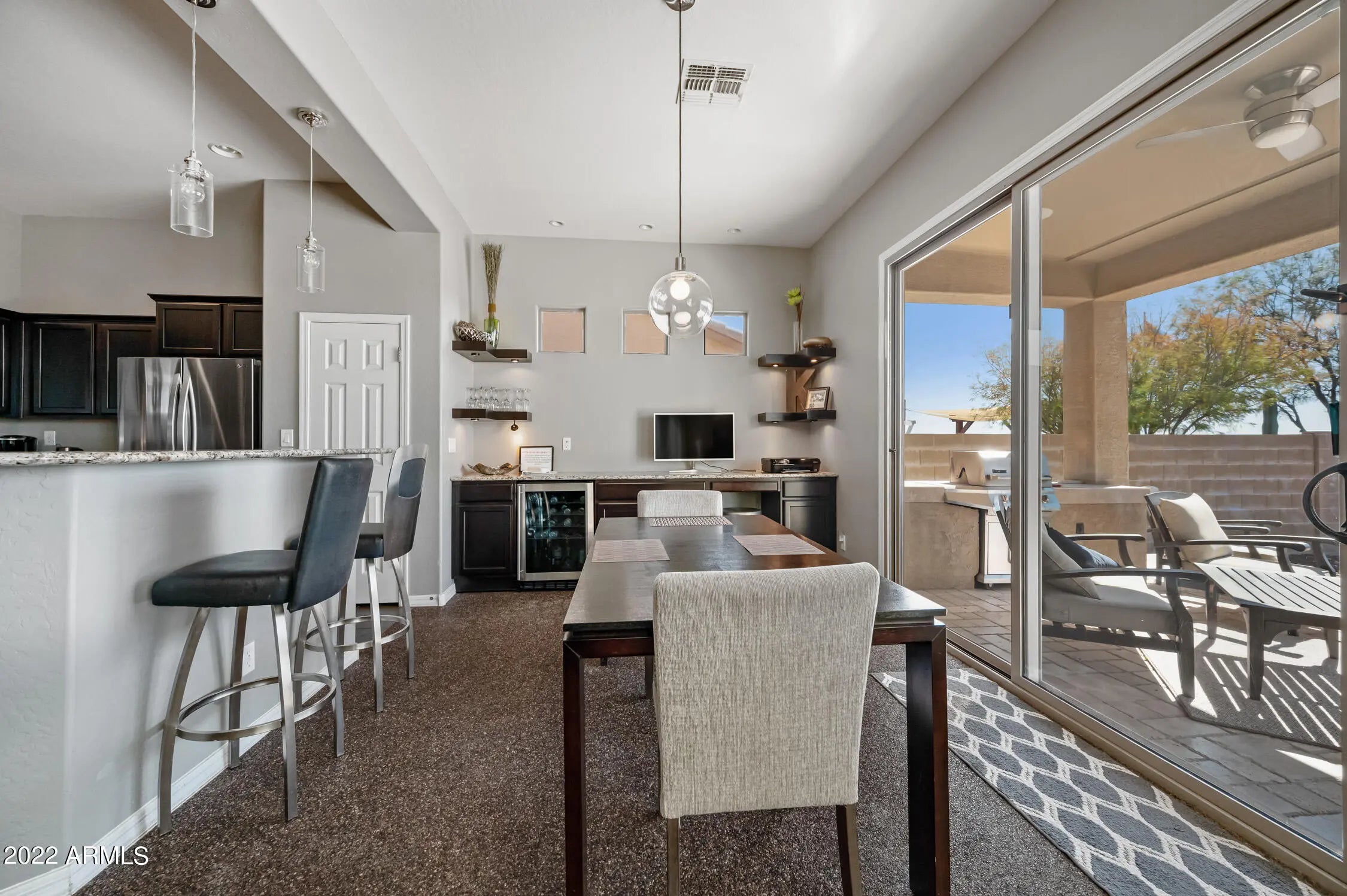 Unparalleled Sonoran Desert and mountain views from this stunning backyard retreat. Enter into an expansive great room with open living and entertaining space. Kitchen features granite countertops, upgraded cabinetry, and enhanced lighting. Natural slate and stone flooring throughout living areas, kitchen, bath, hallway, and laundry room. Built-in bar with wine refrigerator. Split primary bedroom and walk-in closet with oak hardwood flooring. Ceiling fans and south-facing backyard support energy efficiency. Surround sound in great room and covered patio. Laundry room includes utility sink. Backyard showcases exceptional southern views, PebbleTec pool and spa, travertine pavers, and gas BBQ—perfect for outdoor living. Located in Arroyo Grande. with an RV gate too. Enjoy all that Anthem offers: athletic fields, Big Splash Water Park, lap pool, large fitness center, tennis, pickleball and volleyball courts, skate park, and 16-acre catch-and-release lake. Close to TSMC and Lake Pleasant Recreation Area.