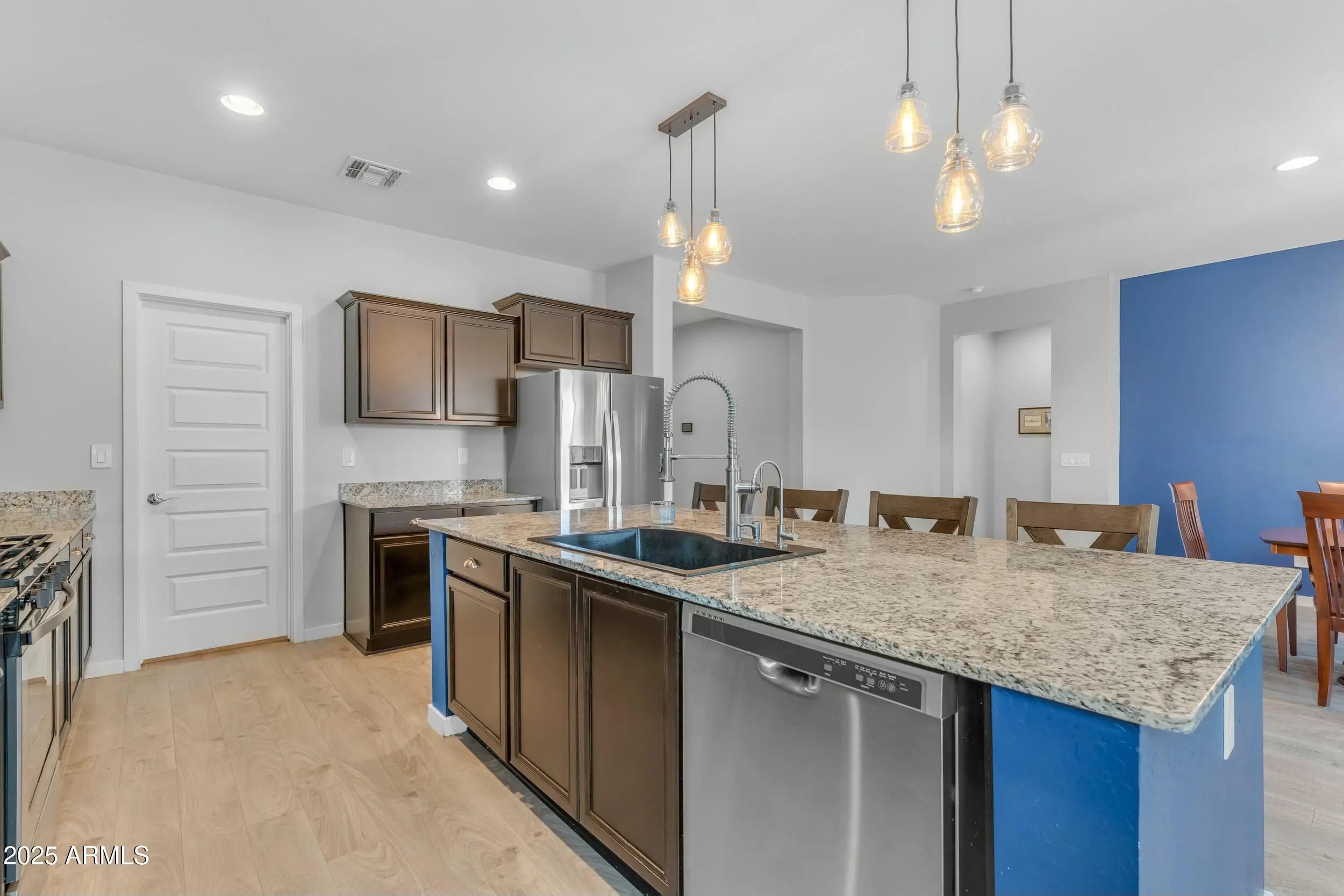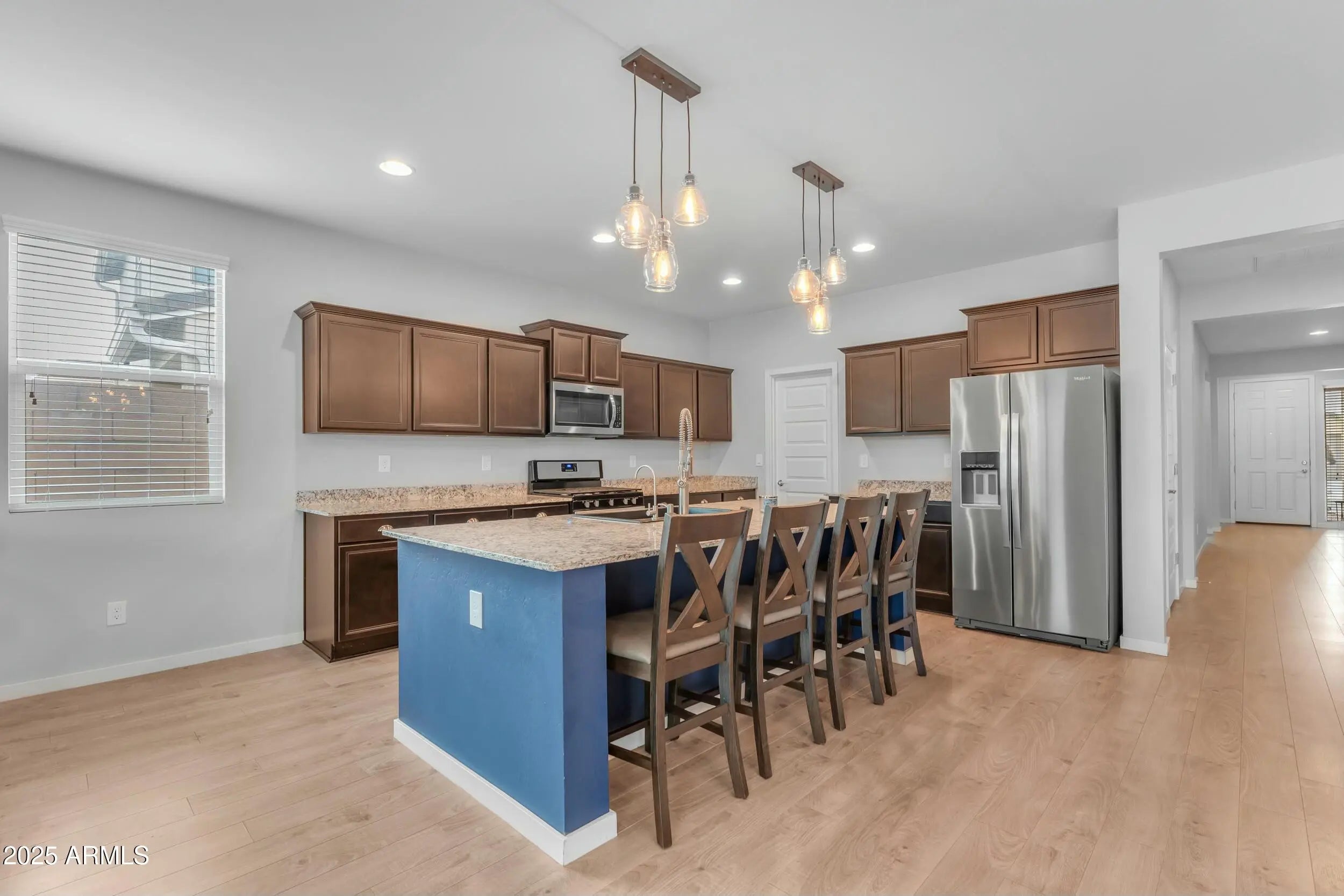 Stop scrolling, this home has it all, pool included! Welcome to this beautifully designed 4-bedroom, 3-bathroom home in the highly desirable Parks neighborhood. With 2,315 square feet of thoughtfully planned living space, this home perfectly balances comfort, style, and functionality. The open concept layout is ideal for both everyday living and entertaining, with a spacious living room that flows effortlessly into the formal dining area and gourmet kitchen. The kitchen features granite countertops, a gas cooktop, a large center island with pendant lighting, and a walk-in pantry. All appliances convey with the home. The primary suite is privately split from the secondary bedrooms, creating a peaceful retreat complete with a walk-in shower, dual vanities, and a generous walk-in closet. Two additional bedrooms each include walk-in closets and share a well appointed bathroom with dual vanities and a shower/tub combo. Tucked away for added privacy, the fourth bedroom is located near its own full bathroom with a walk-in shower, making it ideal for a home office, guest suite, or den. Recessed lighting throughout enhances the home's modern and welcoming feel. Step outside to the backyard oasis featuring a sparkling pool with a water feature, low-maintenance artificial turf, and a covered patio perfect for relaxing or entertaining year-round. The garage includes overhead storage, providing added organization and convenience. Located in the Parks neighborhood and just minutes from shopping, dining, and local favorites, this move in ready home offers an exceptional layout, a prime location, and a lifestyle designed for easy living. This home is a must see!