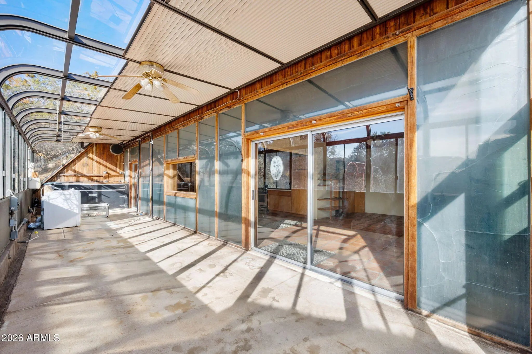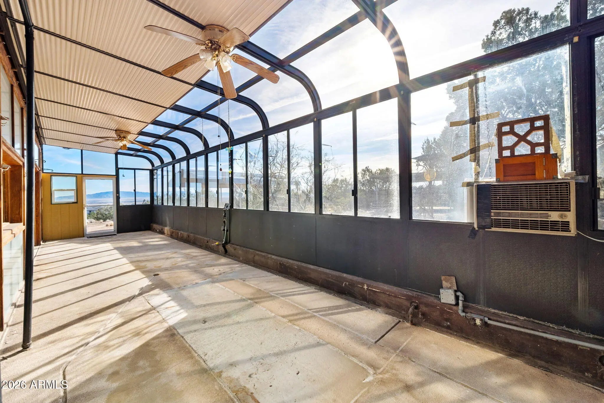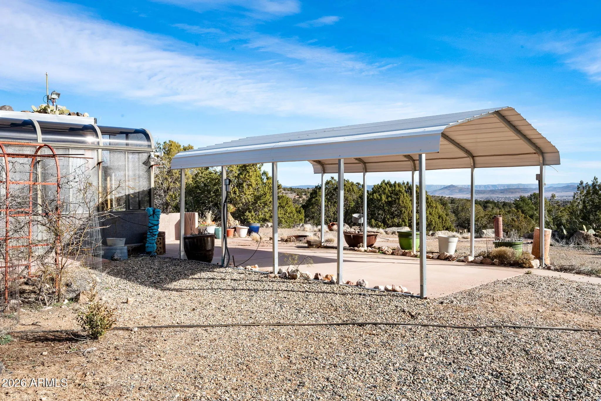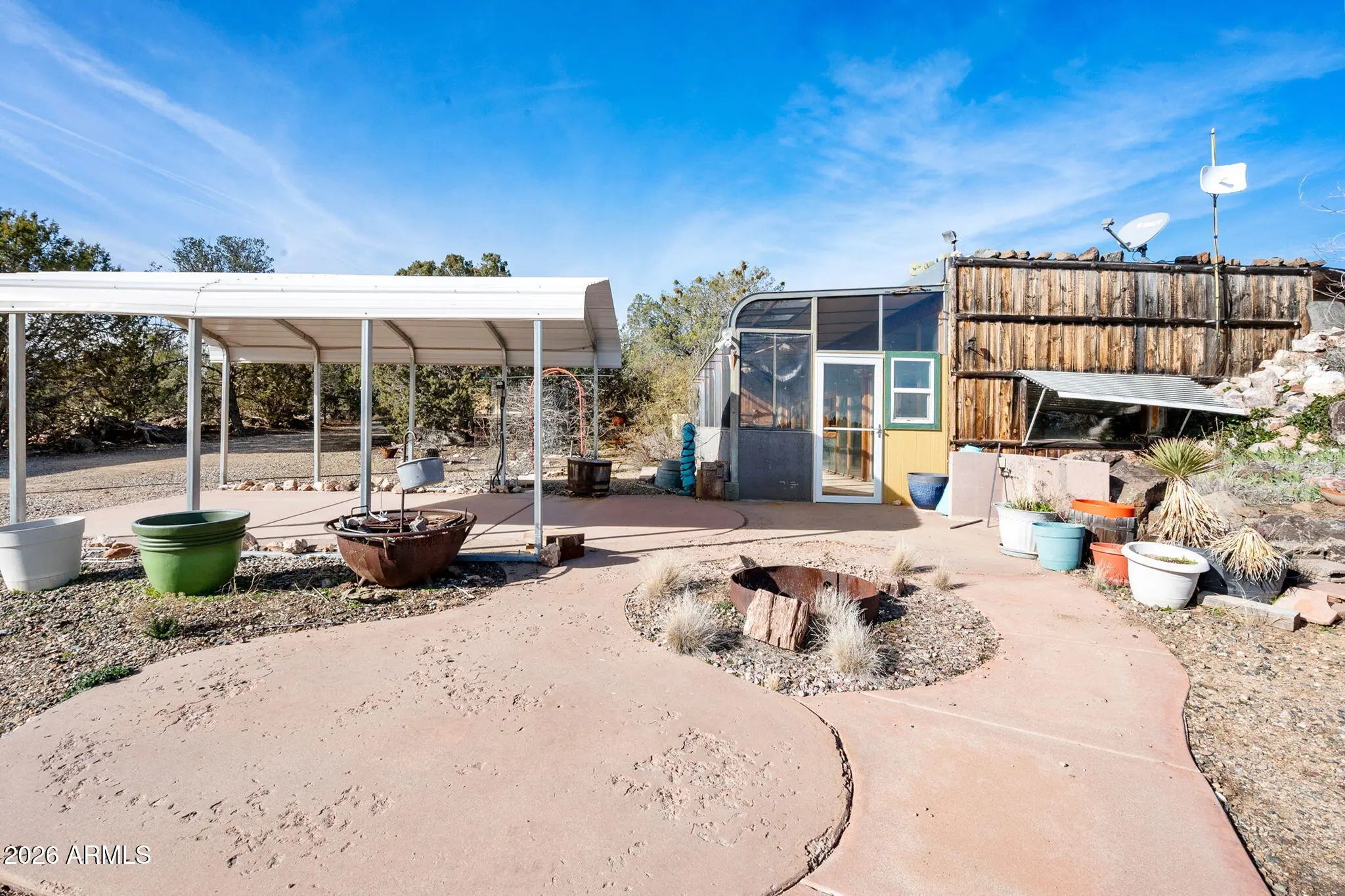 Calling all unique home seekers! This truly one-of-a-kind property is a must-see. This 760 sq ft earth-berm home offers exceptional durability and efficiency, featuring one bedroom and one bathroom, encased in impressive 18-inch concrete walls and roof. Off the main home is an added sunroom with adjustable shades, allowing you to open it up to bring in natural warmth during the colder months and close it off to keep the interior cool during warmer seasons—truly making this home as energy efficient as it comes. The property also includes a detached 800 sq ft permitted garage, offering ample space for parking, storage, or car enthusiasts. Above the garage is a furnished studio-style area with beautiful views, a bedroom, bathroom, and living space. While the structure and electrical are permitted, the use as living space was not permitted and therefore this space is not included in the square footage. Situated on just under 2 acres, this distinctive property boasts two newer sheds, two carport areas with electricity already run, and stunning views from every corner of the land. If you're looking for privacy, character, and functionality wrapped into one exceptional property, this is it.