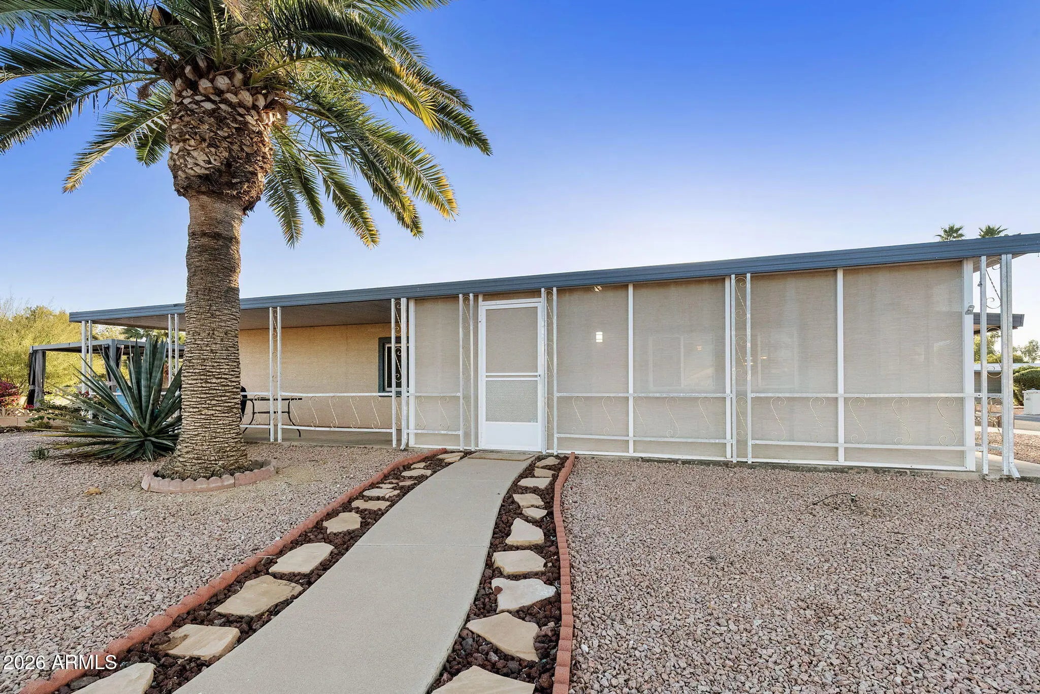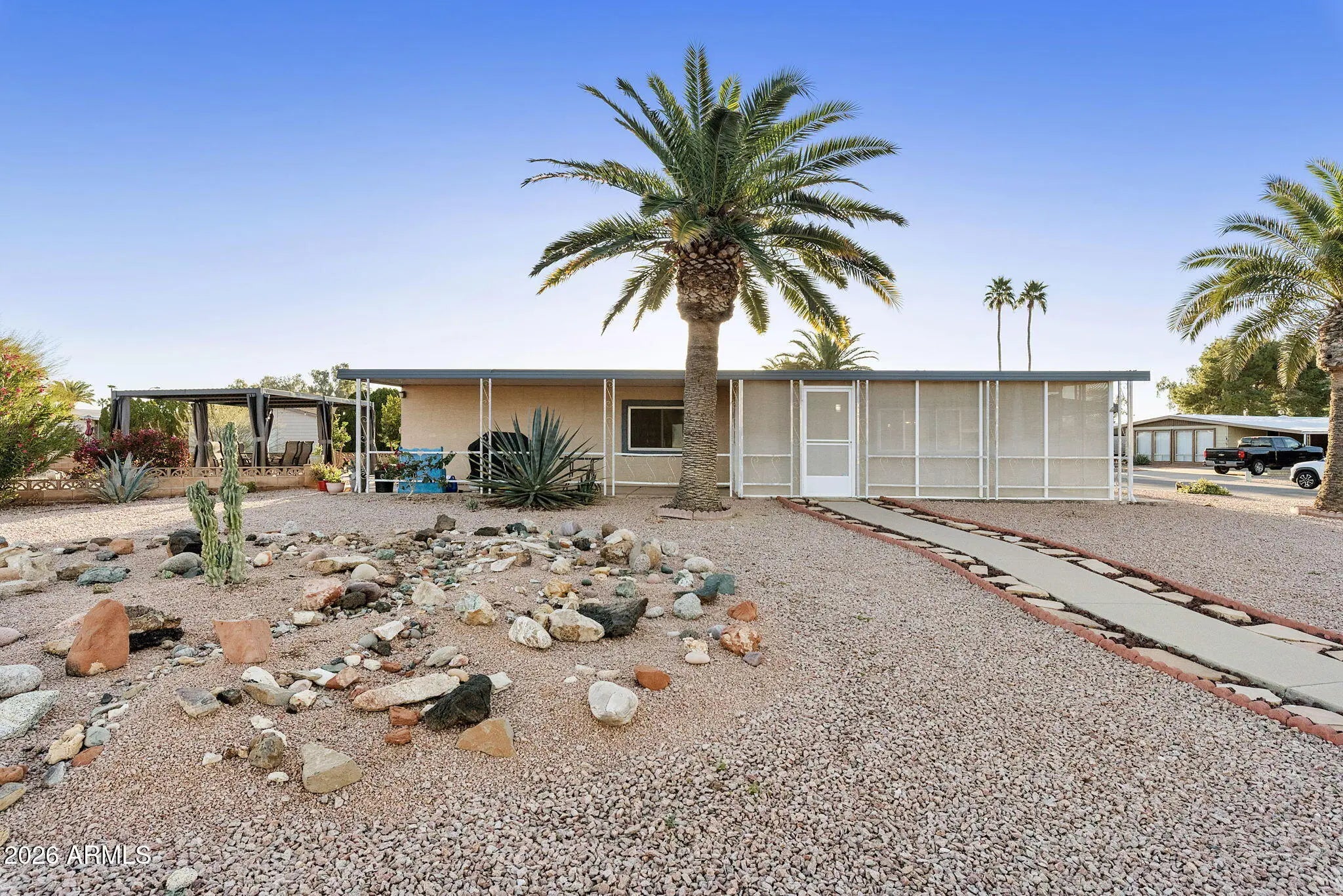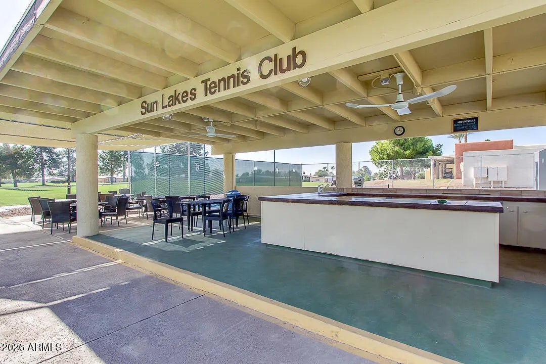 Beautifully updated 2BR, 2BA home on a rare large double corner lot in Sun Lakes! The stucco exterior complements the freshly painted interior and exterior. Enjoy outdoor living in the screened patio or relax under the stars on the new paver patio with pergola and mood lighting, surrounded by newly landscaped, low-maintenance grounds. Major updates include newer HVAC, water heater, roof, and flooring. The kitchen features granite countertops and freshly painted cabinets with stainless appliances. The hall bath boasts a new vanity, and both bathrooms offer updated tile showers. The full-length covered carport features a workshop with double-door golf cart access. Ideally located near the clubhouse, golf, community center, pool, tennis, pickleball, and endless activities