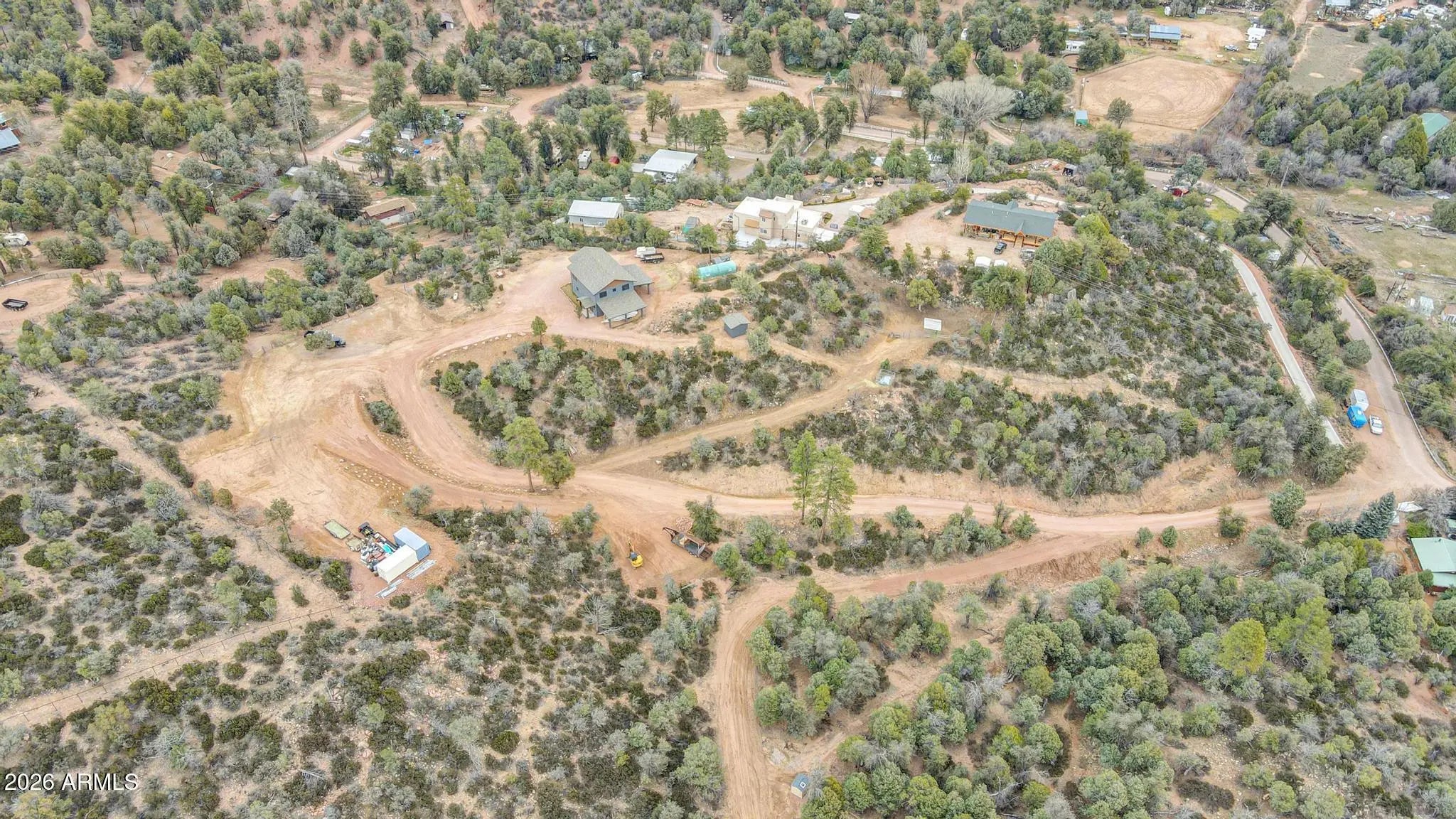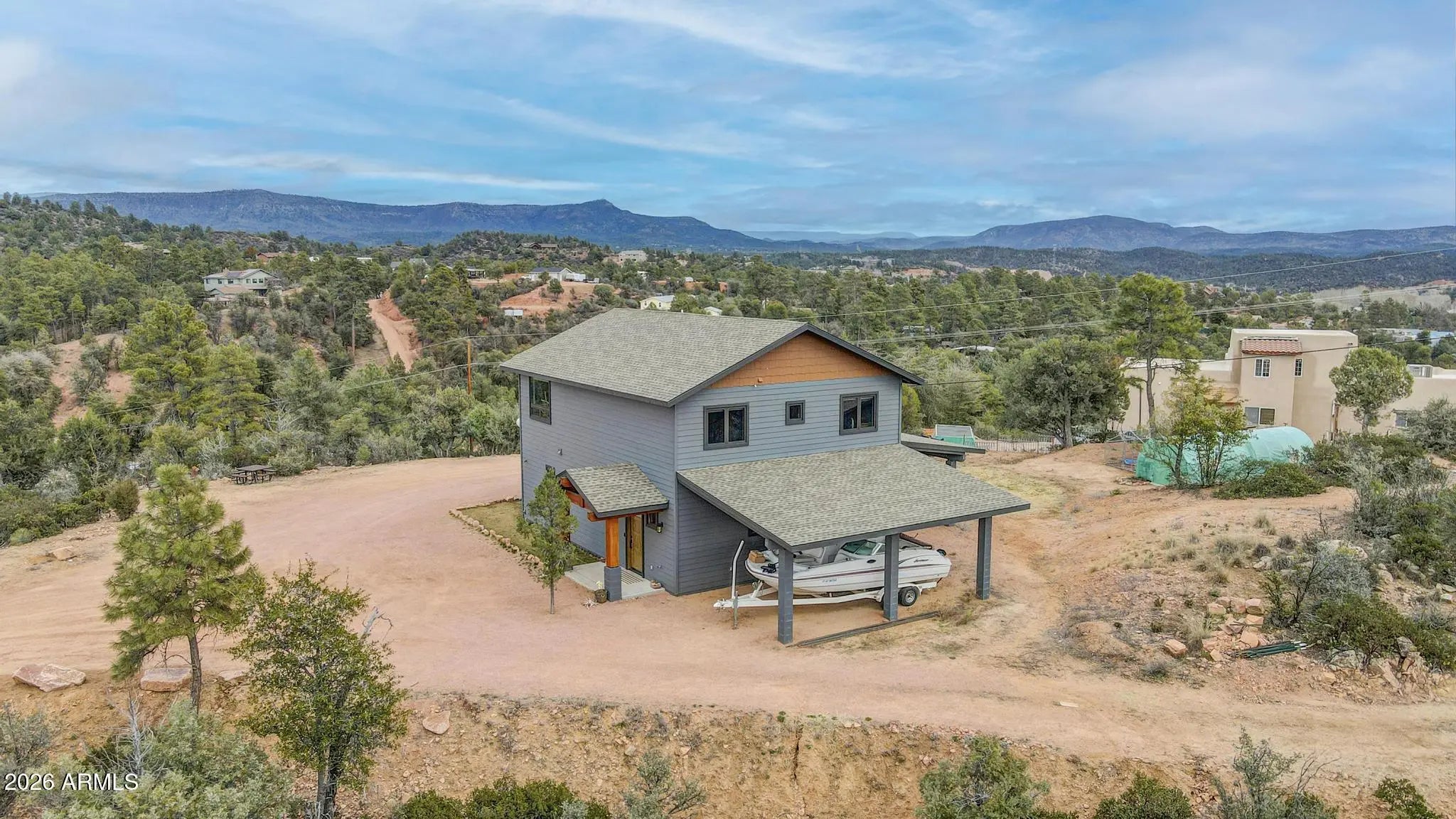 Set on 6 acres with sweeping panoramic views, this exceptional property offers privacy, flexibility, and outstanding future potential. With ample space for horses, recreational vehicles, and outdoor pursuits, this versatile property is perfectly suited for a rural lifestyle with room to grow. The property presents an excellent opportunity for a family compound or a short-term rental that accommodates horses. Extensive groundwork and infrastructure are already in place, offering significant time and cost savings for future development. The property includes an alternative septic system approved to accommodate a future 4-bedroom, 3-bath main residence, along with a private well and a 1,550-gallon storage tank. A cleared building pad is ready for your dream home. An oversized four-car garage located beneath the home is equipped with split-system heating and cooling, making it ideal for vehicle storage, a workshop, or hobby space. The existing residence is a like-new 2-bedroom home built in 2022, offering approximately 1,200 sq ft of thoughtfully designed living space with high-end finishes throughout. The kitchen features LG Smart appliances, quartz countertops and backsplash, custom hickory cabinetry, under-cabinet lighting, and a walk-in pantry. Additional highlights include tongue-and-groove ceilings, luxury vinyl plank flooring throughout, and a spacious custom tile shower. A large covered deck provides the perfect vantage point to enjoy the breathtaking views.