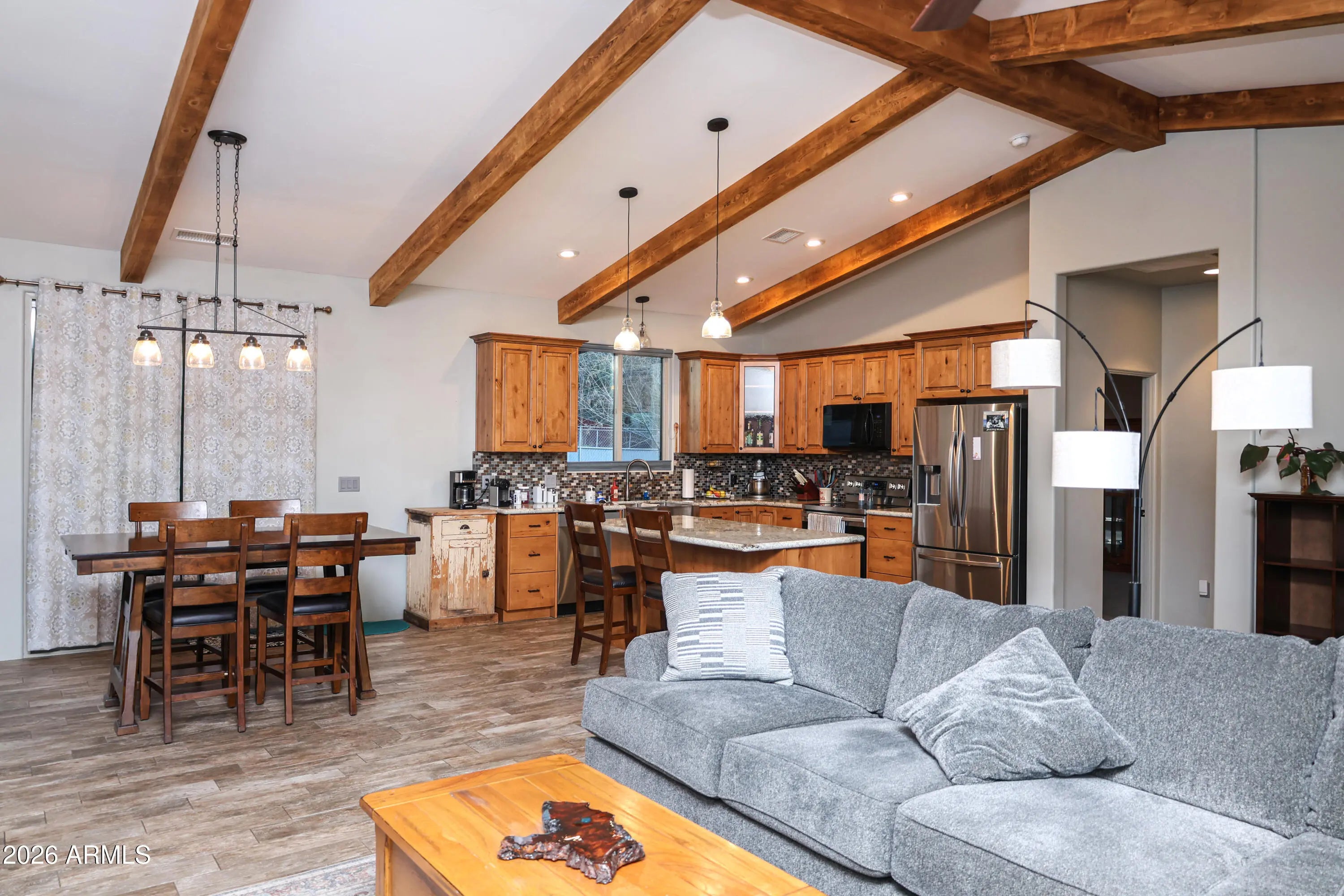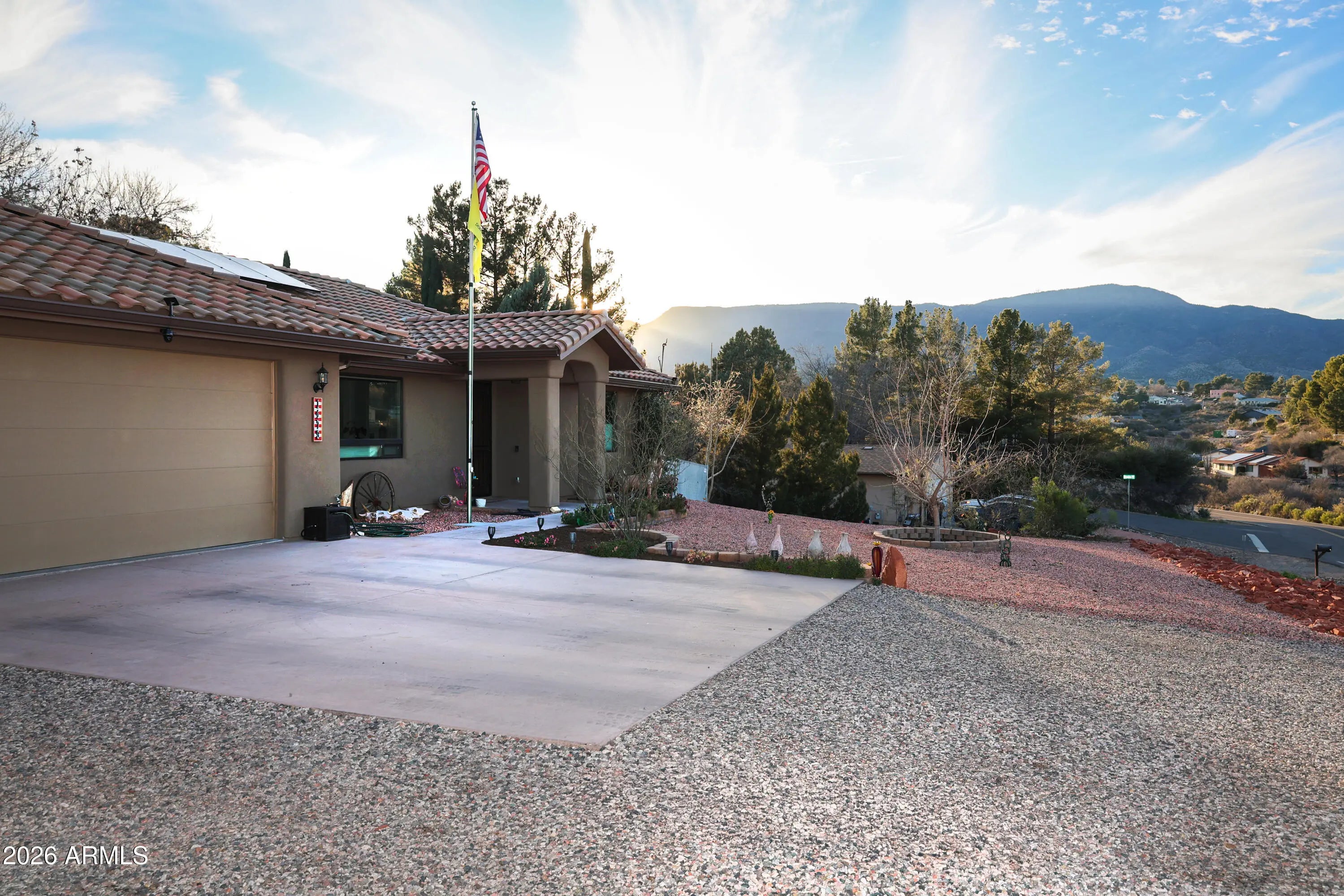 Step into your dream retreat! This home offers a seamless blend of rustic elegance & modern function with an open floor plan & stunning exposed wood beams. The gourmet kitchen boasts a large island and granite counter tops, flowing into spacious living areas with custom wood doors & cabinetry. Enjoy ultimate outdoor living on the covered patio while soaking in panoramic Red Rock and Mingus Mountain views. The low maintenance landscape provides natural beauty without the upkeep. Large bedrooms ensure comfort while practical amenities shine: RV parking with 30 amp hookups & a dedicated workshop cater to every hobbyist's needs. This versatile sanitary is built for the Arizona lifestyle!