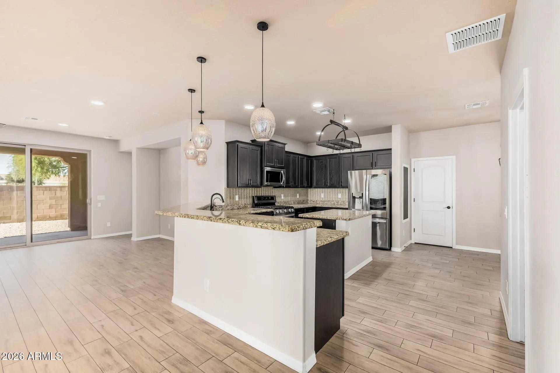 Just a 10-minute drive to Intel, and 15-minutes to Chandler Fashion Center. You'll experience modern comfort & style in this thoughtfully designed 4BR+ beauty packed with features you're sure to love! The spacious open floor plan is highlighted by wood-look tile flooring, abundant natural light, & fresh paint throughout. The well-appointed kitchen is a cook's delight, equipped with ample cabinetry, stainless appliances, a tile backsplash, hanging pot rack, granite counters, recessed/pendant lighting, a walk-in pantry, & a center island. Large main retreat offers an ensuite w/an enclosed glass shower & a walk-in closet. Bonus room. Fire pit. 2-car garage. Water softener. This gem is move-in ready!