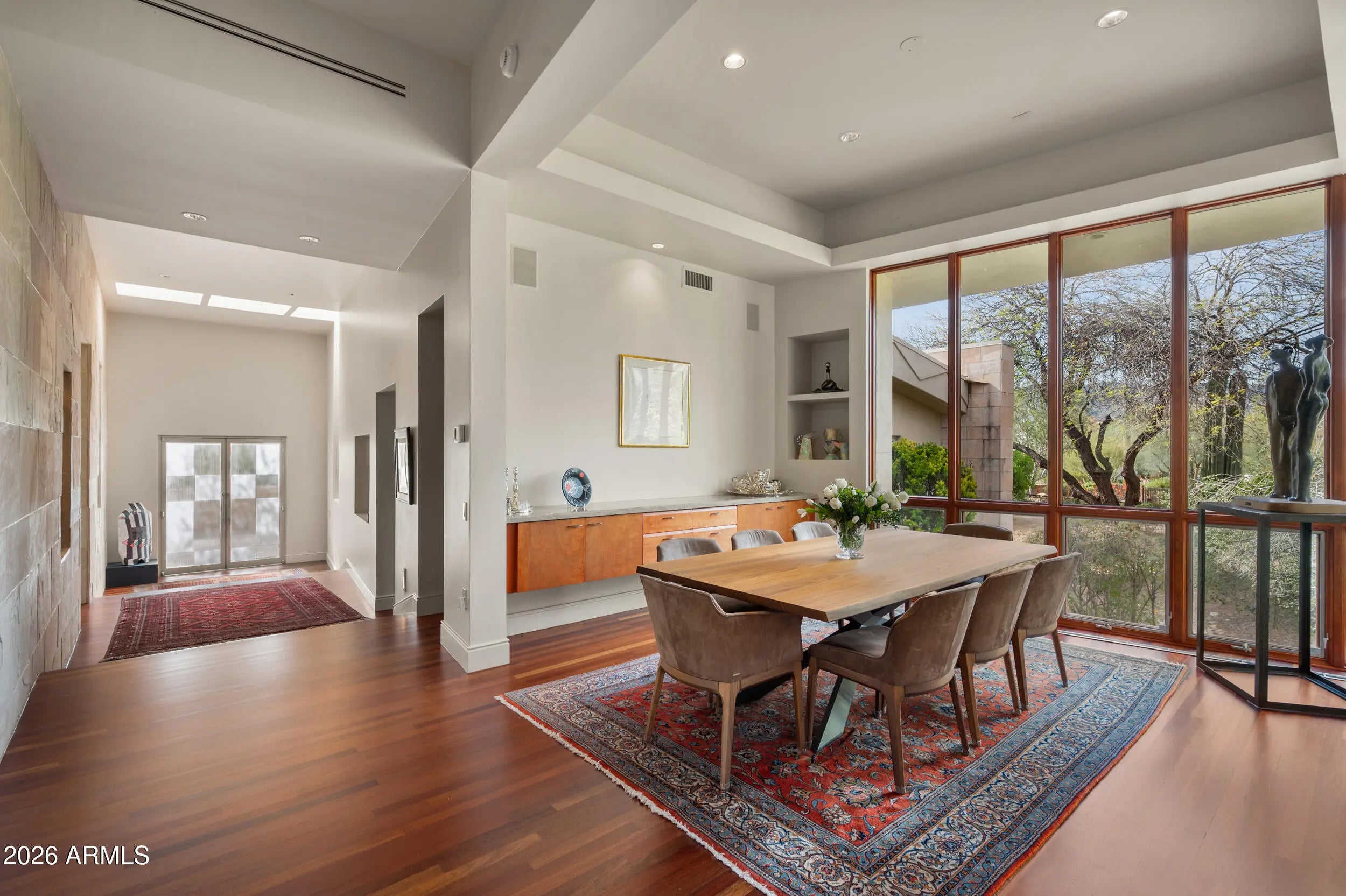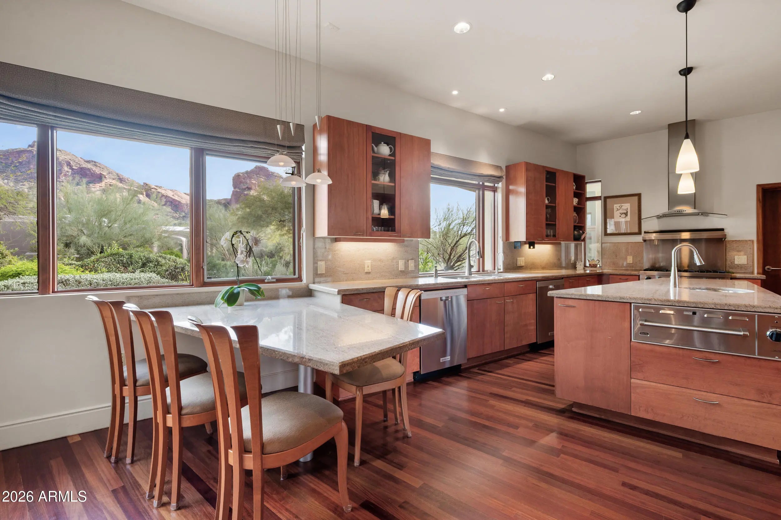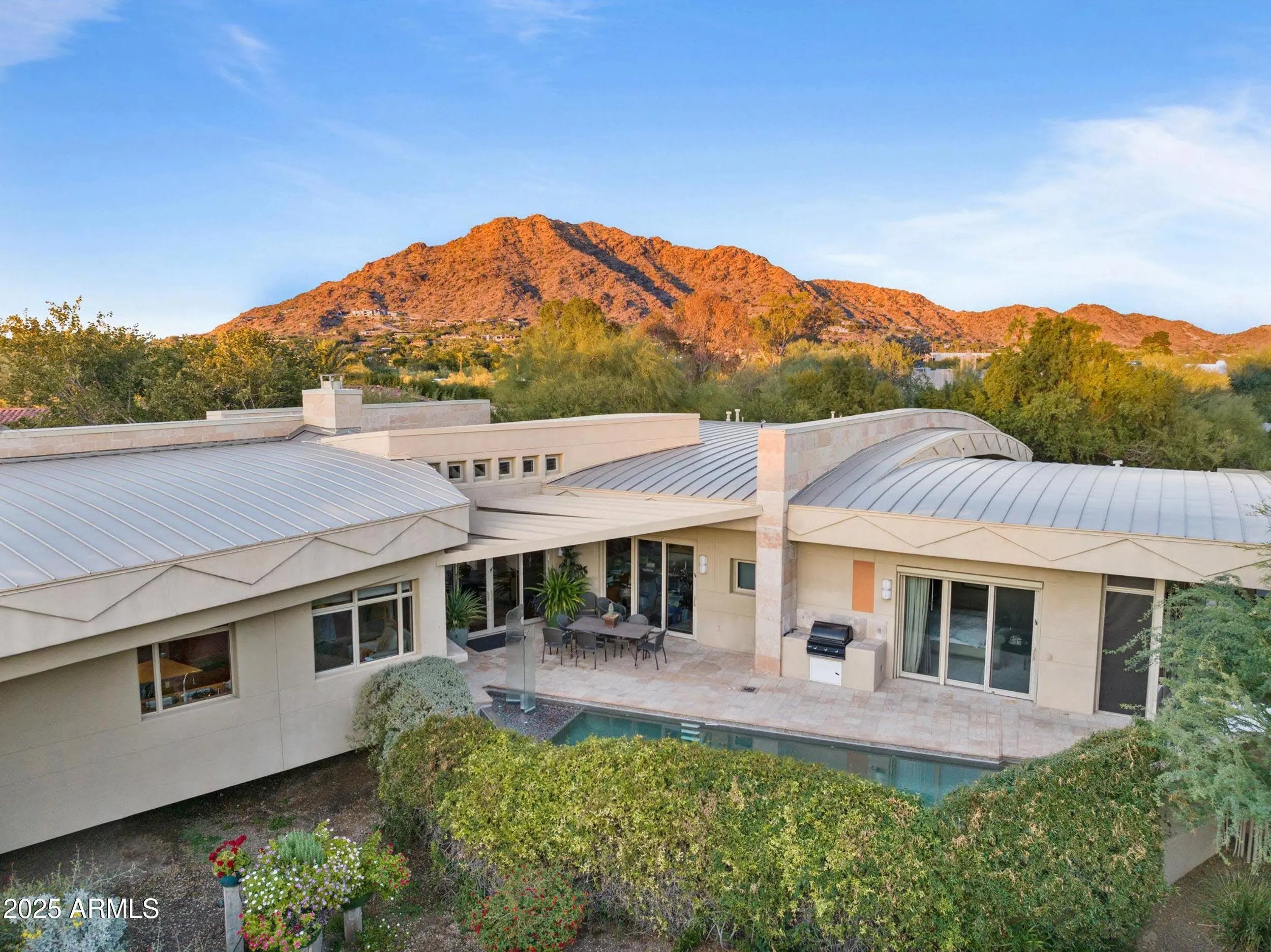 Architecture, landscape, and light converge at this one-of-a-kind Paradise Valley estate, where iconic mountain views unfold in every direction. Thoughtfully positioned on a full acre, the residence appears to float above the desert terrain, offering a rare balance of privacy, scale, and sightlines to Camelback Mountain, Mummy Mountain, and the Phoenix Mountain Preserve. Spanning over 5,930 square feet, the home is designed around openness and flow. Expansive glass and intentional spatial alignment allow each space to feel seamlessly connected to the surrounding landscape. The living, dining, and kitchen areas flow seamlessly together, creating an ideal setting for both elevated entertaining and everyday living. The interiors are defined by rich materials and sculptural details: Brazilian cherry wood flooring, limestone walls that transition seamlessly from exterior to interior, skylights that bathe the home in natural light, and custom architectural windows that frame the mountains as art. Every room was intentionally oriented to capture views while preserving privacy. The chef's kitchen blends beauty and performance, featuring custom cabinetry, stone countertops, a built-in banquet, and a suite of high-end appliances including a Viking six-burner gas cooktop, Wolf convection oven, dual dishwashers, warming drawer, Sub-Zero refrigeration, and icemakerideal for hosting at any scale. The great room anchors the home with a dramatic domed ceiling and stone fireplace, opening through large glass doors to outdoor living. A linear negative-edge pool and spa sit perfectly against the mountain backdrop, creating a resort-like experience that feels both luxurious and serene. The owner's suite is a private retreat, wrapped in floor-to-ceiling glass with mountain views, and complemented by a spa-inspired bath, an adjacent yoga studio, and direct access to the lush backyard. Three additional ensuite bedrooms, including one with its own private patio, offer comfort and privacy for guests or family. A dedicated office with custom built-ins provides a refined space for work or creativity. Constructed with adobe and stone beneath a distinctive domed metal roof, the residence reflects a thoughtful architectural vision that is both timeless and grounded in its desert setting. Mature trees, manicured lawn spaces, and layered outdoor living areas create a lush, private setting that contrasts beautifully with the surrounding desert. This is not simply a home, but a composed architectural experiencedefined by views, privacy, and design integrityin one of Arizona's most coveted locations.