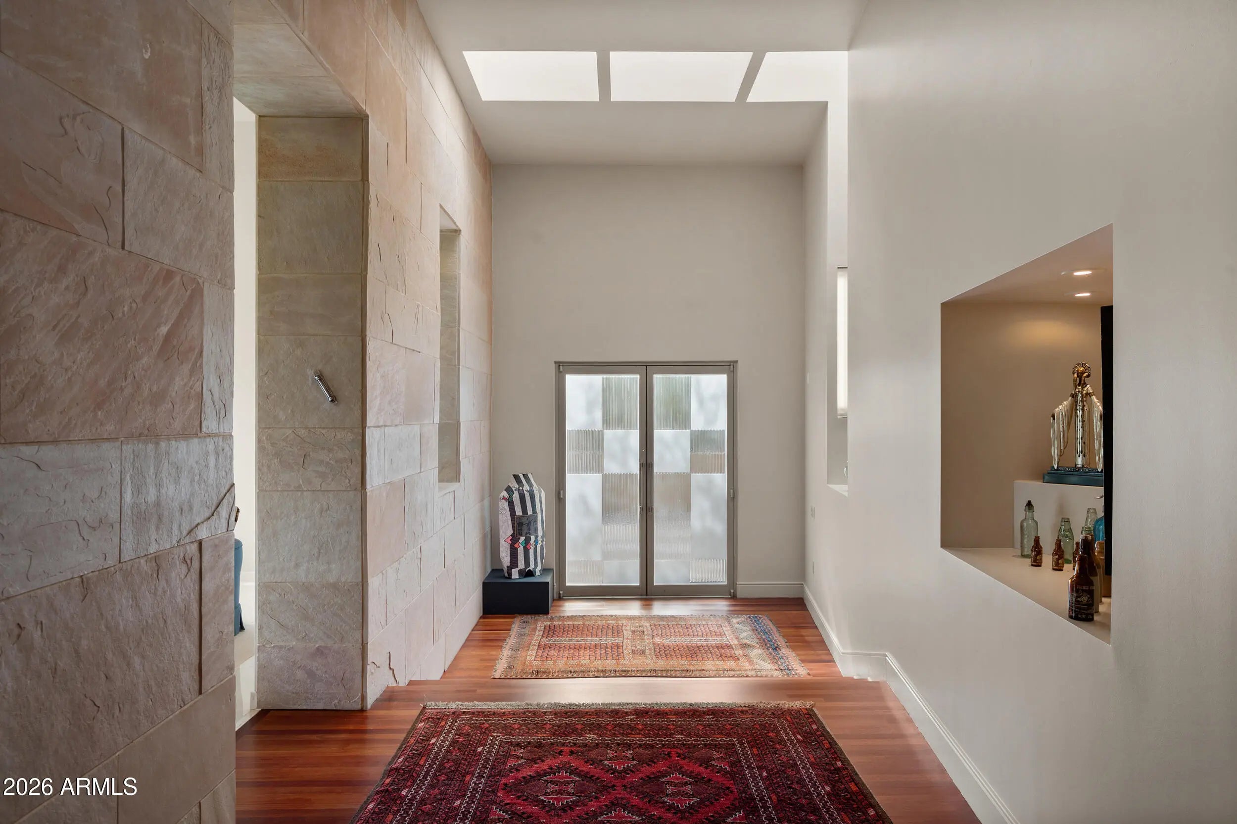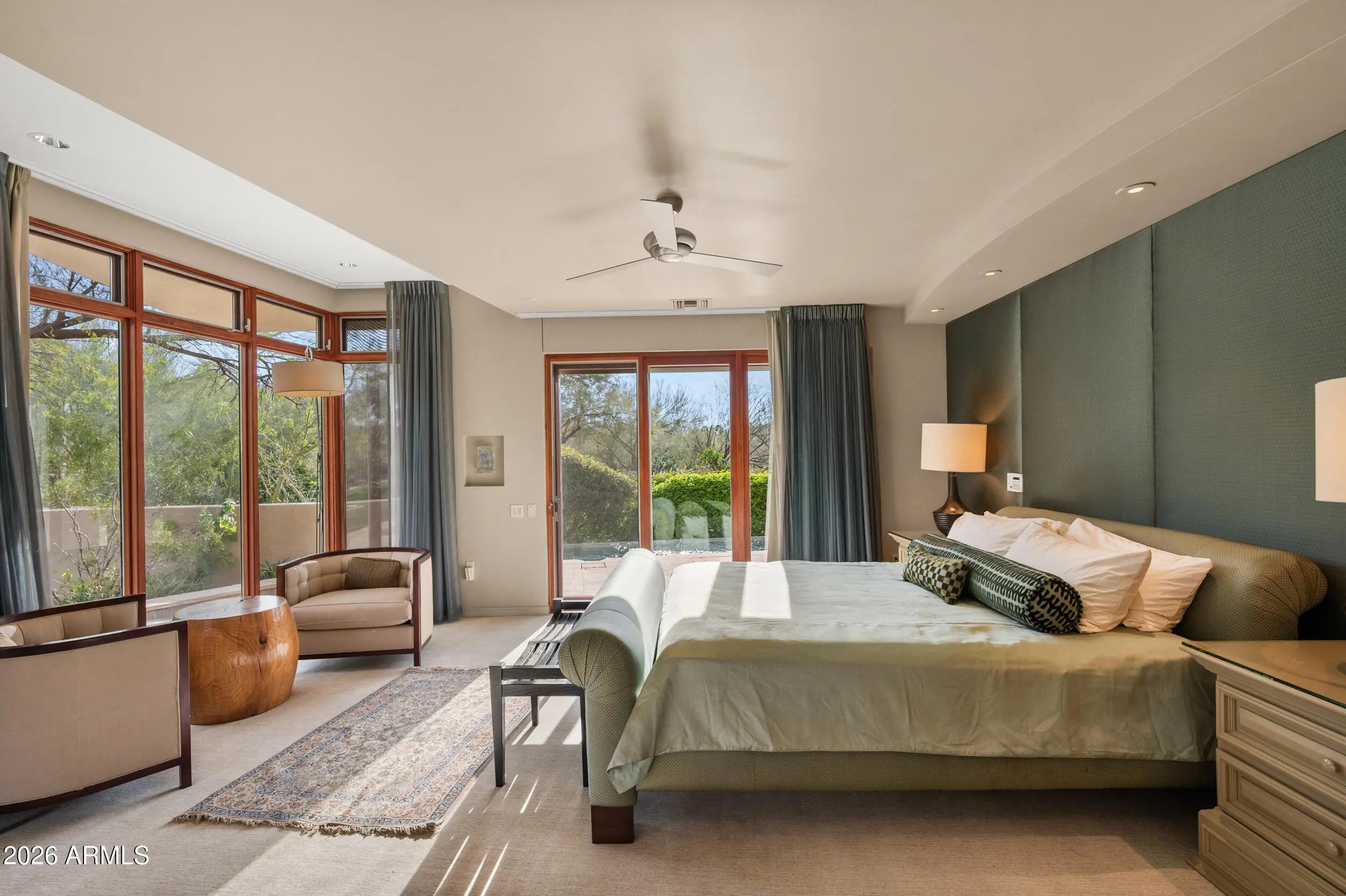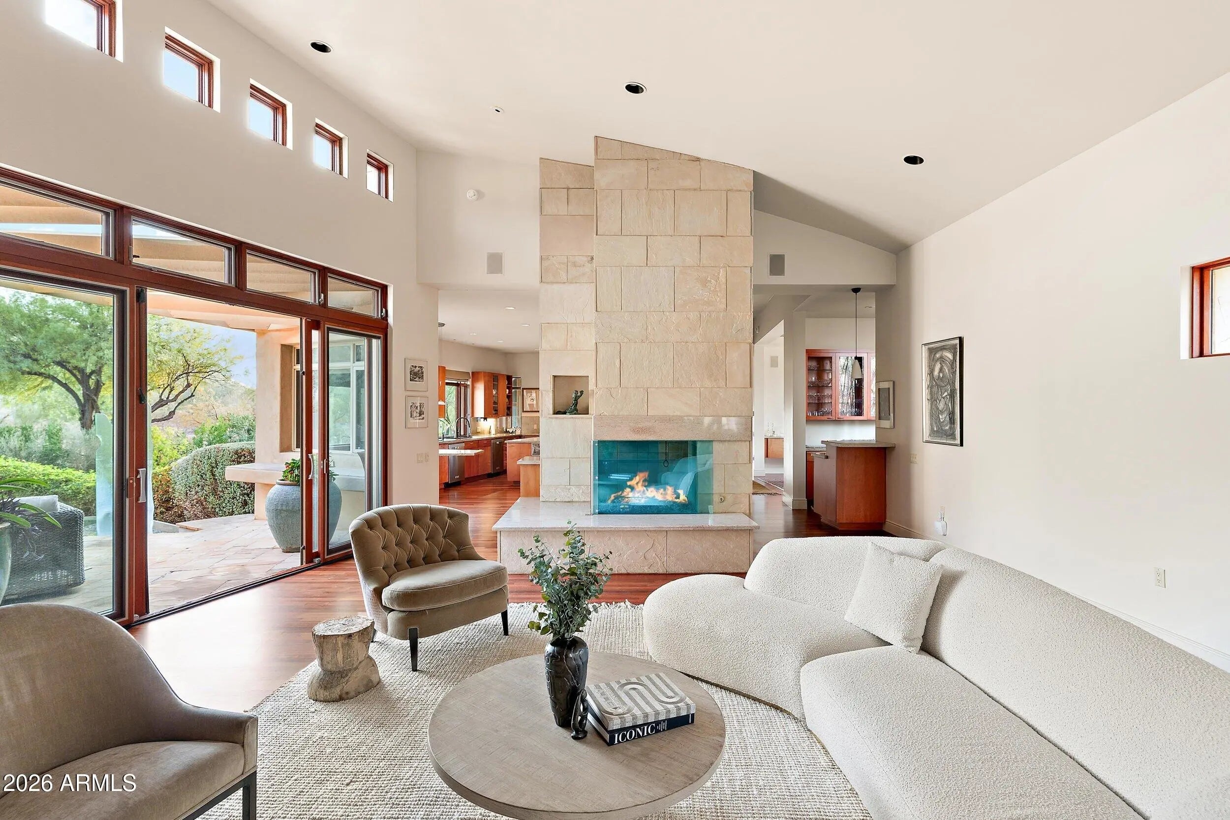 Architecture, landscape, and light converge at this one-of-a-kind Paradise Valley estate, where iconic mountain views unfold in every direction. Thoughtfully positioned on a full acre, the residence appears to float above the desert terrain, offering a rare balance of privacy, scale, and sightlines to Camelback Mountain, Mummy Mountain, and the Phoenix Mountain Preserve. Spanning over 5,930 square feet, the home is designed around openness and flow. Expansive glass and intentional spatial alignment allow each space to feel seamlessly connected to the surrounding landscape. The living, dining, and kitchen areas flow seamlessly together, creating an ideal setting for both elevated entertaining and everyday living. The interiors are defined by rich materials and sculptural details: Brazilian cherry wood flooring, limestone walls that transition seamlessly from exterior to interior, skylights that bathe the home in natural light, and custom architectural windows that frame the mountains as art. Every room was intentionally oriented to capture views while preserving privacy. The chef's kitchen blends beauty and performance, featuring custom cabinetry, stone countertops, a built-in banquet, and a suite of high-end appliances including a Viking six-burner gas cooktop, Wolf convection oven, dual dishwashers, warming drawer, Sub-Zero refrigeration, and icemakerideal for hosting at any scale. The great room anchors the home with a dramatic domed ceiling and stone fireplace, opening through large glass doors to outdoor living. A linear negative-edge pool and spa sit perfectly against the mountain backdrop, creating a resort-like experience that feels both luxurious and serene. The owner's suite is a private retreat, wrapped in floor-to-ceiling glass with mountain views, and complemented by a spa-inspired bath, an adjacent yoga studio, and direct access to the lush backyard. Three additional ensuite bedrooms, including one with its own private patio, offer comfort and privacy for guests or family. A dedicated office with custom built-ins provides a refined space for work or creativity. Constructed with adobe and stone beneath a distinctive domed metal roof, the residence reflects a thoughtful architectural vision that is both timeless and grounded in its desert setting. Mature trees, manicured lawn spaces, and layered outdoor living areas create a lush, private setting that contrasts beautifully with the surrounding desert. This is not simply a home, but a composed architectural experiencedefined by views, privacy, and design integrityin one of Arizona's most coveted locations.