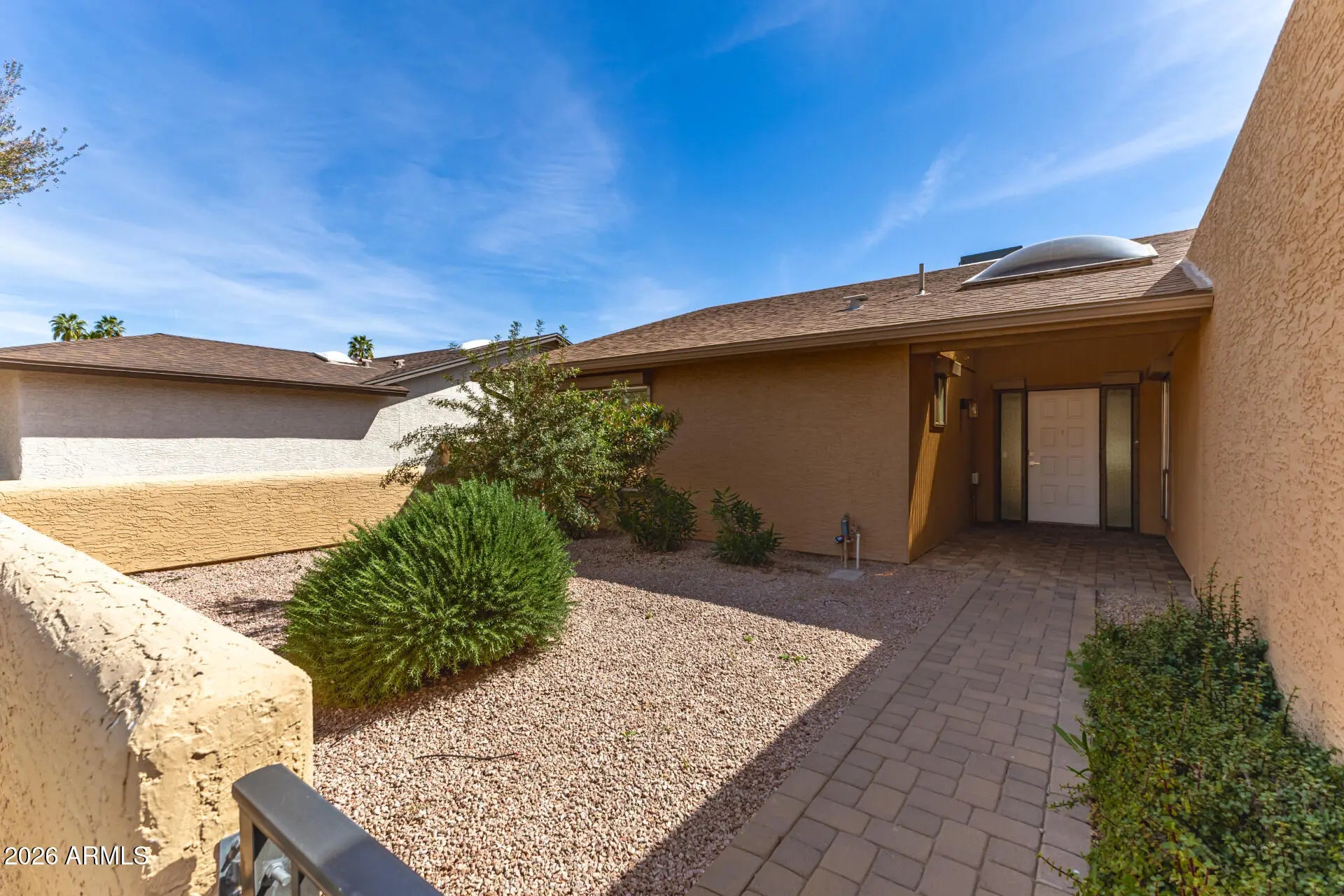 Welcome to this beautiful newly updated home that blends comfort, style and upgrades all set within a highly desirable amenity- rich community. A huge front courtyard and inviting pavered walkway create a welcoming entry. The home is equipped with exterior security roll-down shades, offering added privacy and peace of mind. Inside, you'll find all-tile flooring for a clean look and easy maintenance. Natural light fills the home through skylights, while a cozy fireplace adds warmth and ambiance to the living area. The heart of the home is the fully updated kitchen which features a large island with breakfast bar, quartz counters, all new ss appliances, a farmhouse sink and a deep covered pantry providing generous storage. Both bathrooms have been thoughtfully updated with new cabinetry, counters, backlit mirrors and new showers. Both bedrooms offer large walk in closets and this home also has large linen and coat closets. This home is available now and offers a country club lifestyle with extensive amenities including golf, tennis, pickleball, dining and various clubs. Experience the serenity of Palo Verde, a gated community while enjoying access to facilities in both neighborhoods- including two golf courses, clubhouses, fitness centers and scenic walking paths. Don't miss out on this incredible opportunity