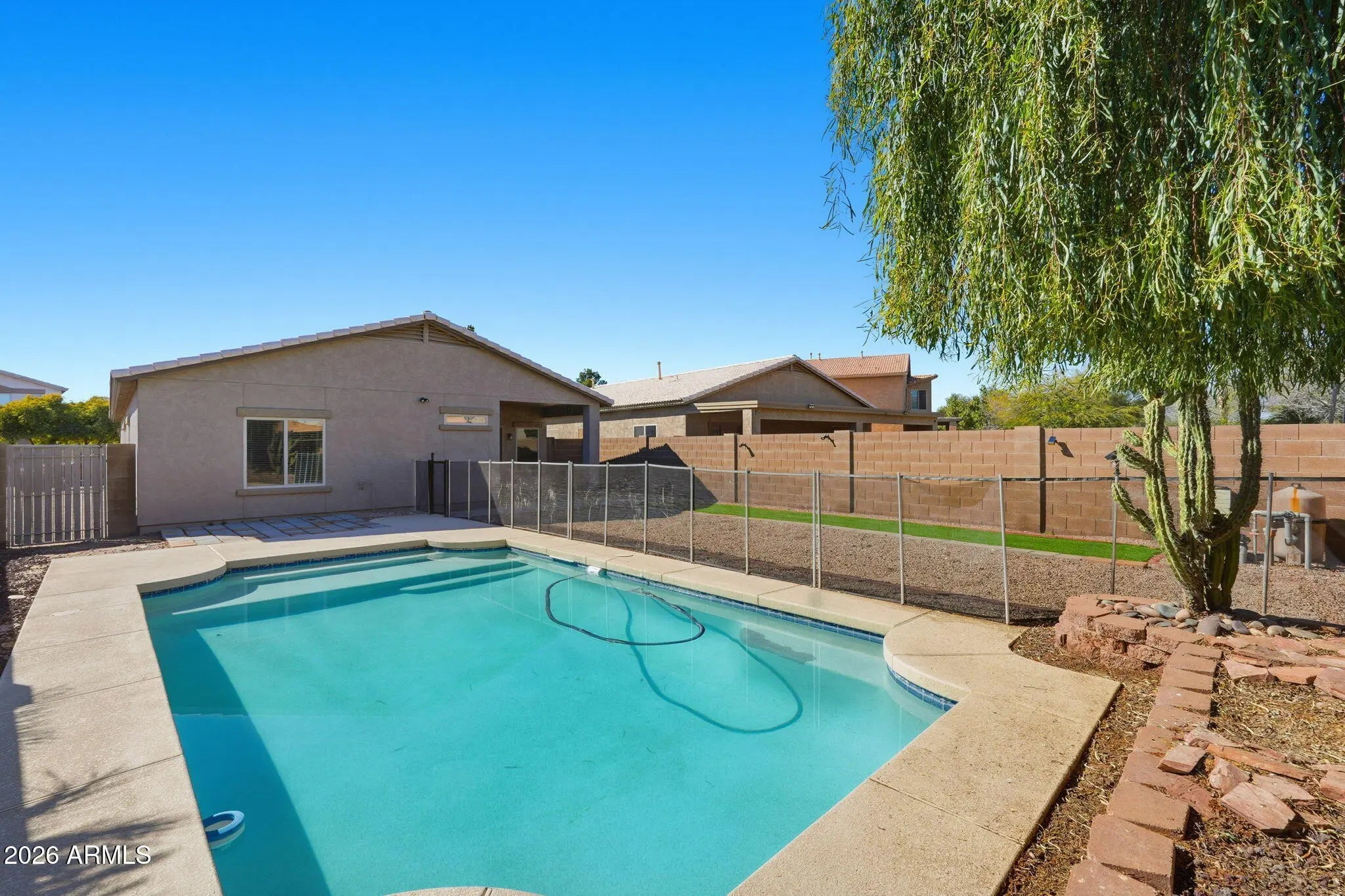 Move-in ready 4-bedroom, 2-bath home with a private pool and thoughtfully designed living spaces. Recently refreshed and professionally cleaned, the home offers an open layout, a spacious kitchen, and a comfortable primary suite with dual sinks. Secondary bedrooms are well sized, including a convenient shared bathroom with dual access. Step outside to a low-maintenance backyard with decorative rock and a sparkling pool enclosed by a safety fence—ideal for relaxing or entertaining. Located in the Johnson Ranch community with access to parks, greenbelts, and numerous neighborhood amenities. Perfect for buyers at any stage—first home, downsizing, vacation retreat, or investment opportunity.