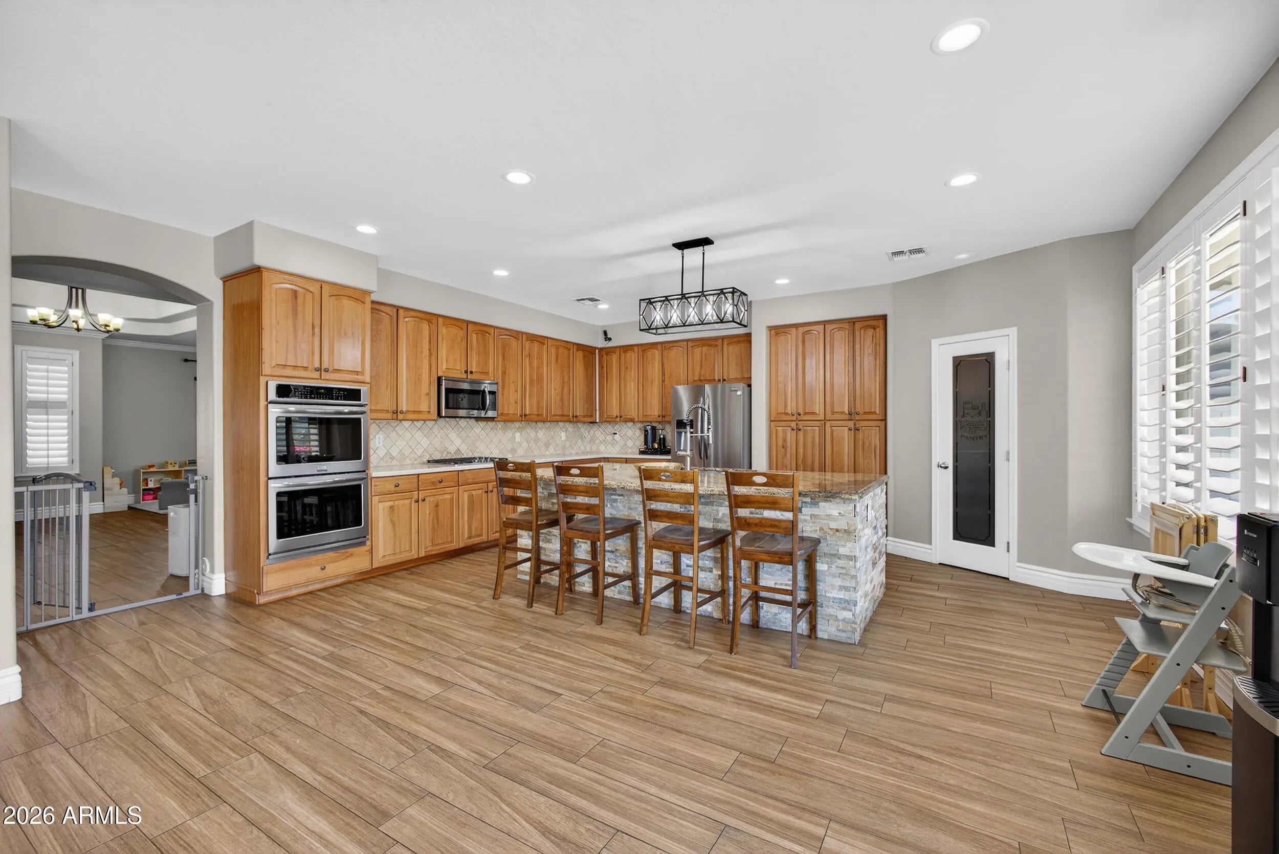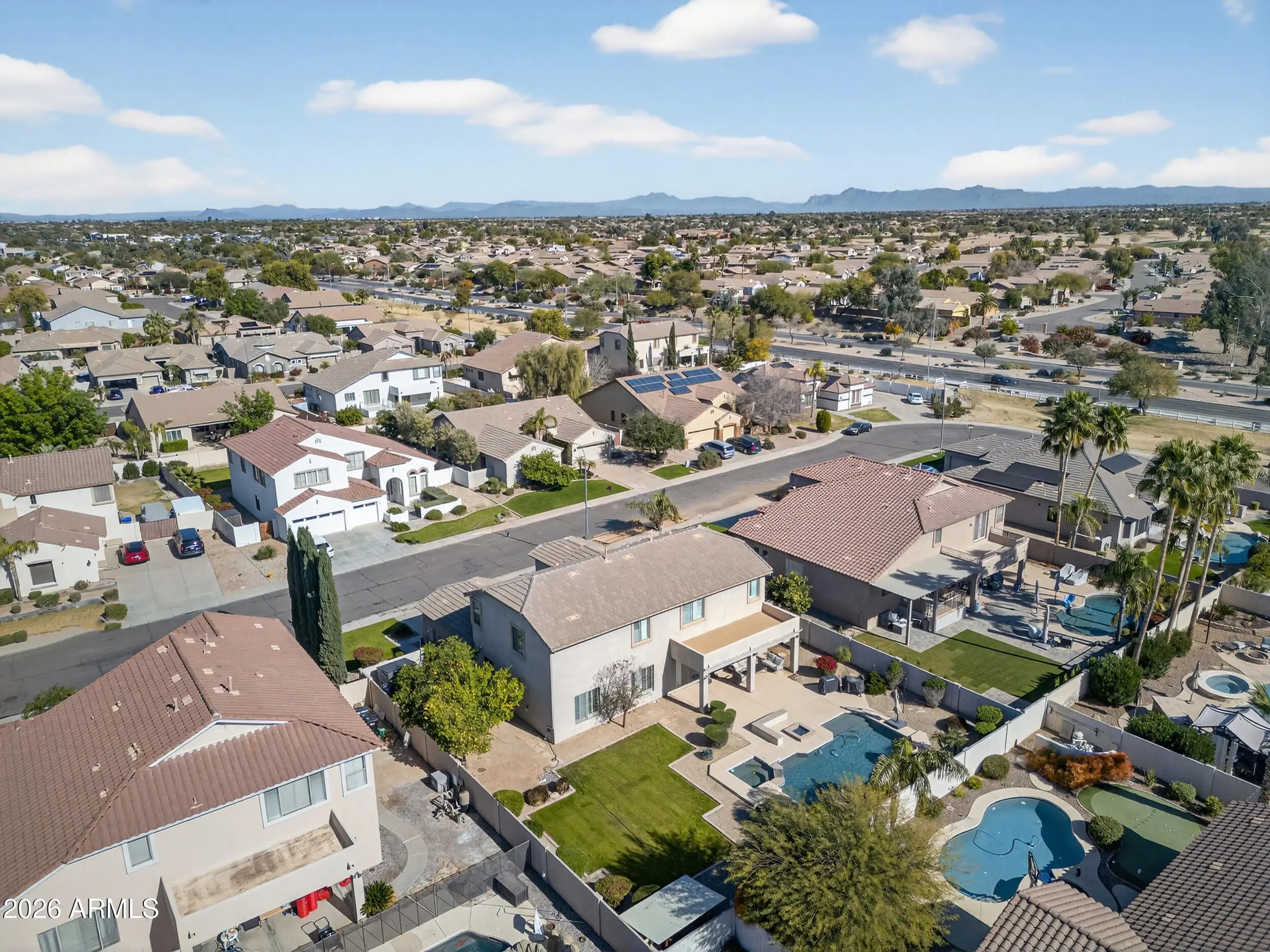 Serious value here—prime location with major upgrades already done. Key systems and finishes have been handled: vinyl flooring (2022), water heater (2021), water softener (2023), pool and spa updates including PebbleTec, heater, and filter (2023), and a new HVAC systems (2024). Plantation shutters throughout and no carpet anywhere make this home truly move-in ready. The layout delivers space where it matters. An open-concept kitchen and family room create the main living hub, featuring 42-inch hickory cabinets, double ovens, a gas stove, and a walk-in pantry. Separate formal living and dining rooms add flexibility for entertaining or everyday use. With 5 bedrooms and 3 full baths, including a full bedroom and bathroom downstairs, the floor plan supports guests, multigenerational living, or a dedicated home office. The extended 3-car garage offers extra storage and room to work. Outside, the backyard is designed for Arizona living with a heated pool and spa and built-in fire pit, ready for year-round enjoyment. Extensively updated and priced under market, offering a rare opportunity for value and immediate occupancy.
