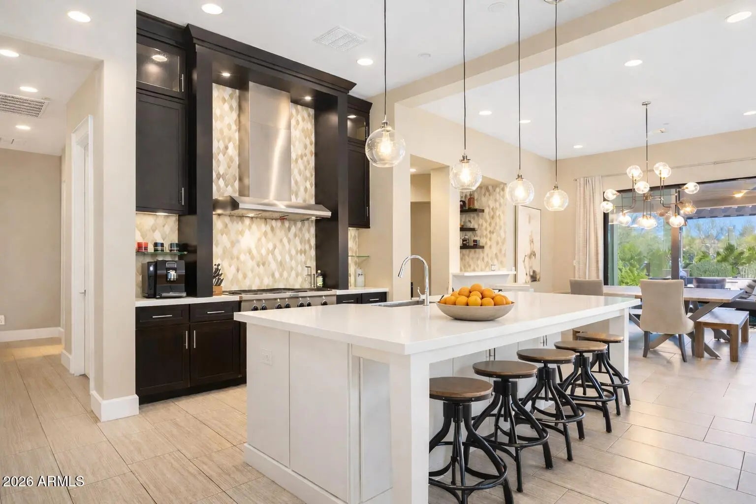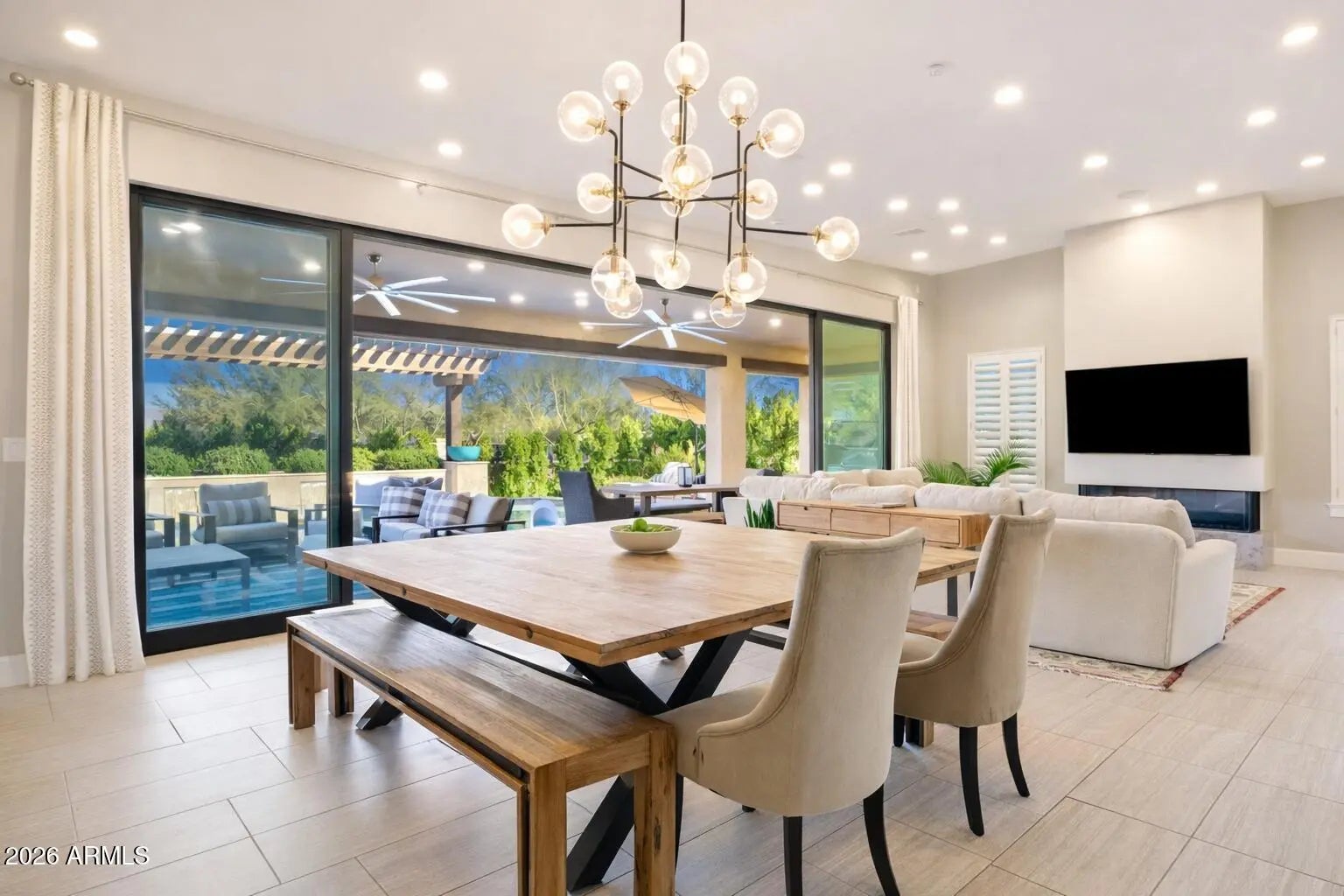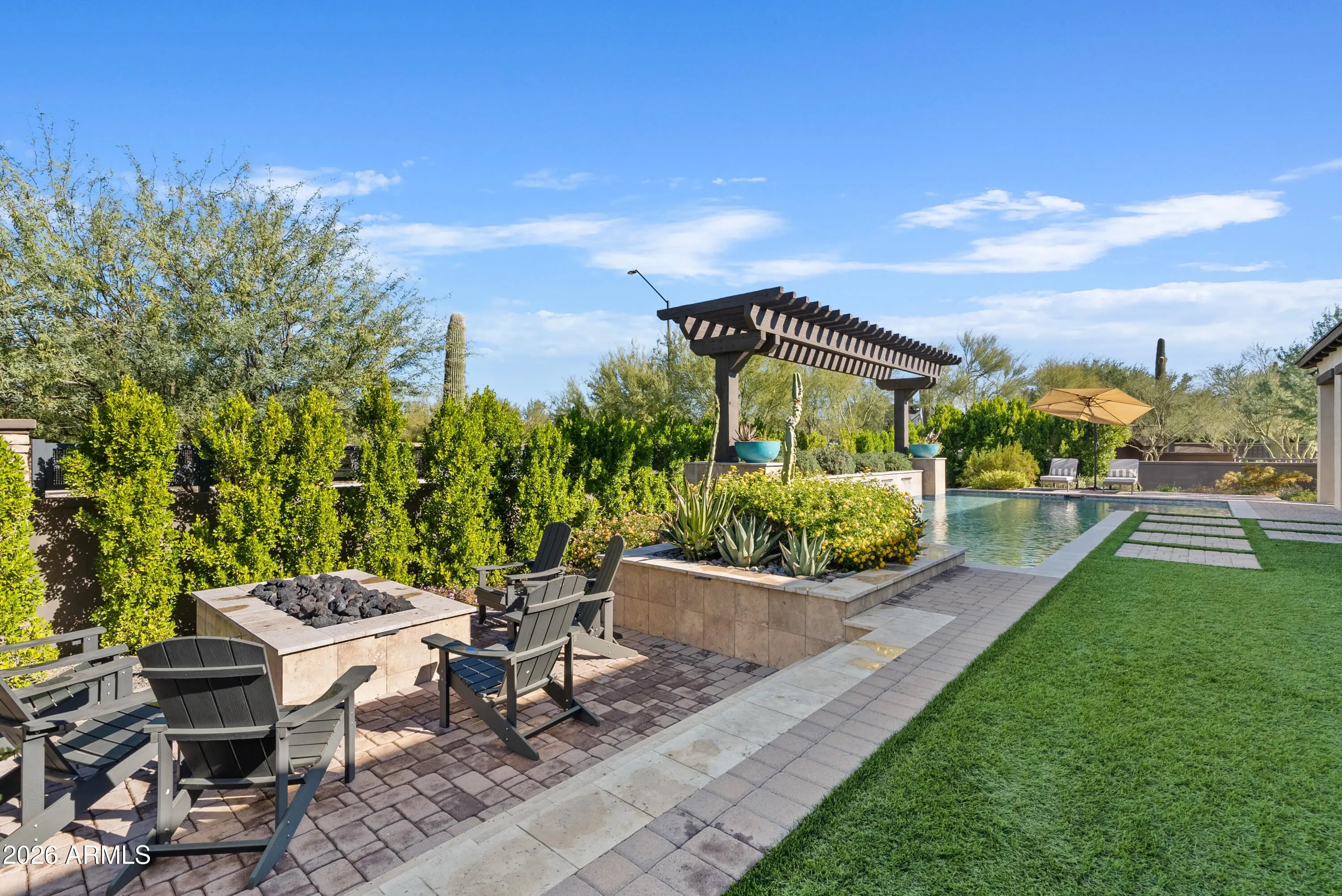 Welcome to your dream home in the prestigious gated community of Bellissima! This former model residence offers all main level living with 3 spacious bedrooms, 4 baths, and a dedicated office — all thoughtfully designed with premium finishes and furnishings. This home is being offered fully furnished, making it move-in ready for the most discerning buyer. From the professionally curated interior décor to the chef's kitchen with high-end appliances, no detail has been overlooked. The seamless indoor-outdoor design features a brand-new 32-foot sliding glass wall that opens to a lush backyard oasis — featuring over 30 mature trees installed by Moon Valley Nurseries. Enjoy casual dining, comfortable lounging, and effortless entertaining, all in a home that reflects refined desert living. Located just minutes from upscale shops, restaurants, and top-rated schools. Offered turnkey, just bring your toothbrush. Giddy up!