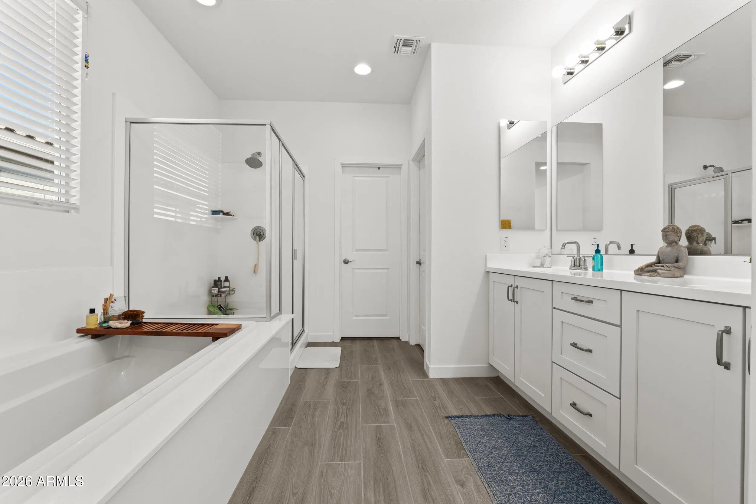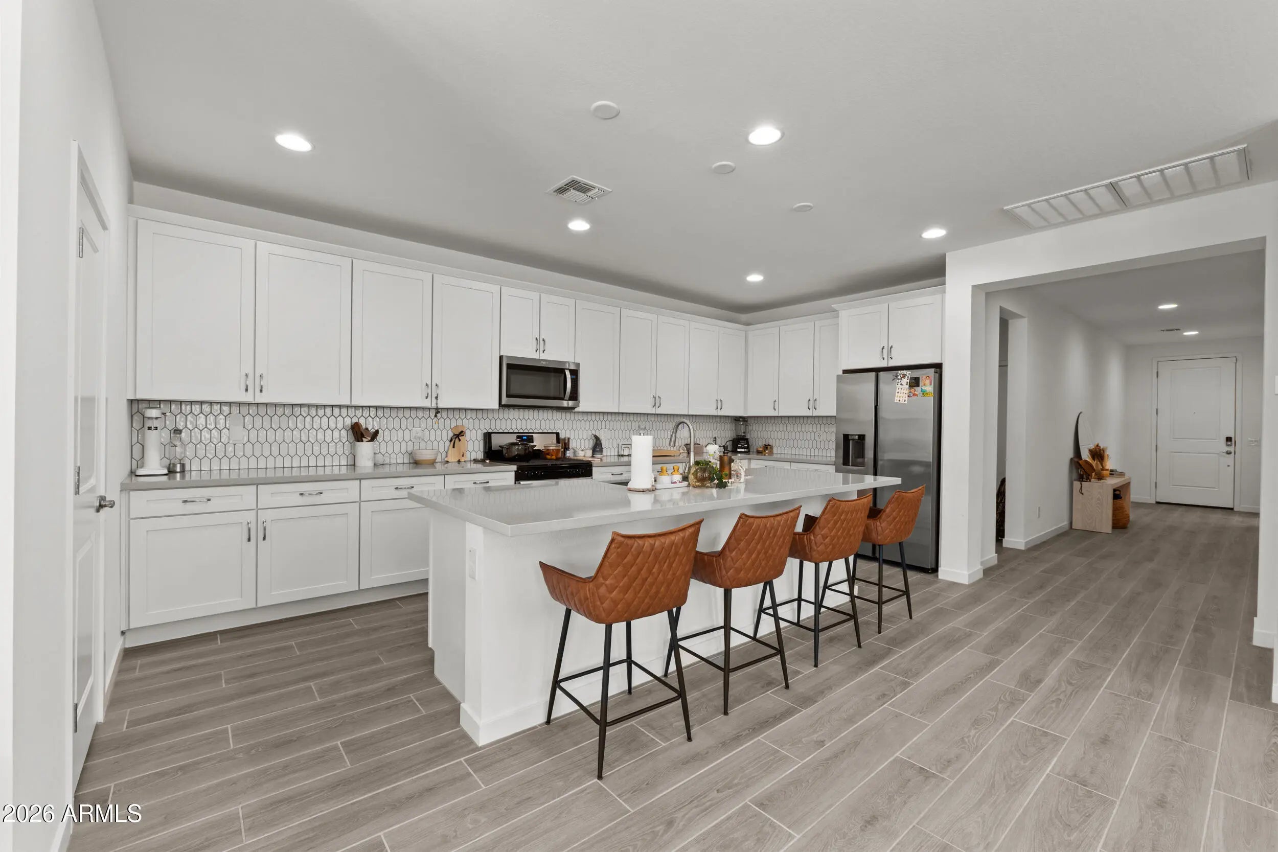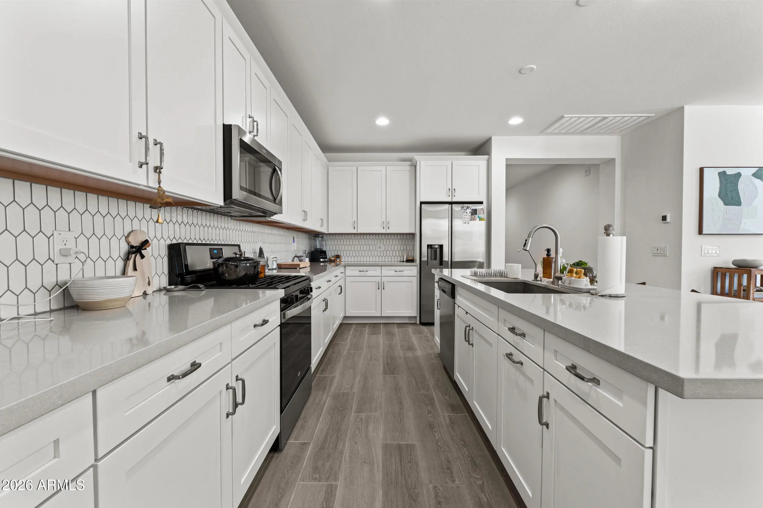 Welcome to this beautifully upgraded home located in the desirable Vidrio at Estrella community. Offering 3 bedrooms plus a dedicated study and 2 bathrooms, this home showcases thoughtful design and quality finishes throughout. The kitchen is a standout with crisp white shaker cabinetry, sleek gray quartz countertops, and a modern geometric tile backsplash, creating a space that's both stylish and functional. The spacious primary suite feels like a private retreat, featuring a spa-inspired ensuite with a separate soaking tub and walk-in shower, along with a walk-in closet that conveniently connects to the laundry room. The laundry room itself is elevated with decorative tile and built-in cabinetry for added storage. Gray wood-look plank tile flows throughout the main living areas, and the backyard includes a BBQ gas stub, perfect for entertaining. A wonderful opportunity to enjoy comfort, style, and the Estrella lifestyle.