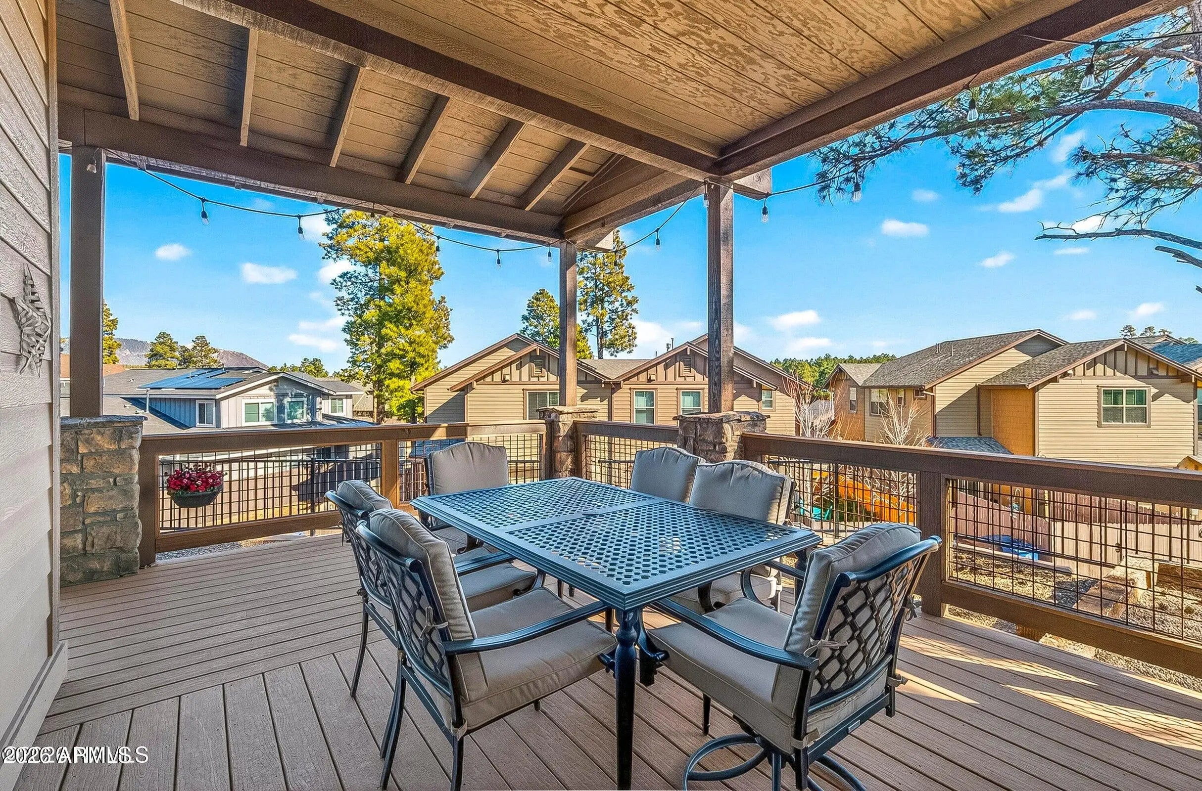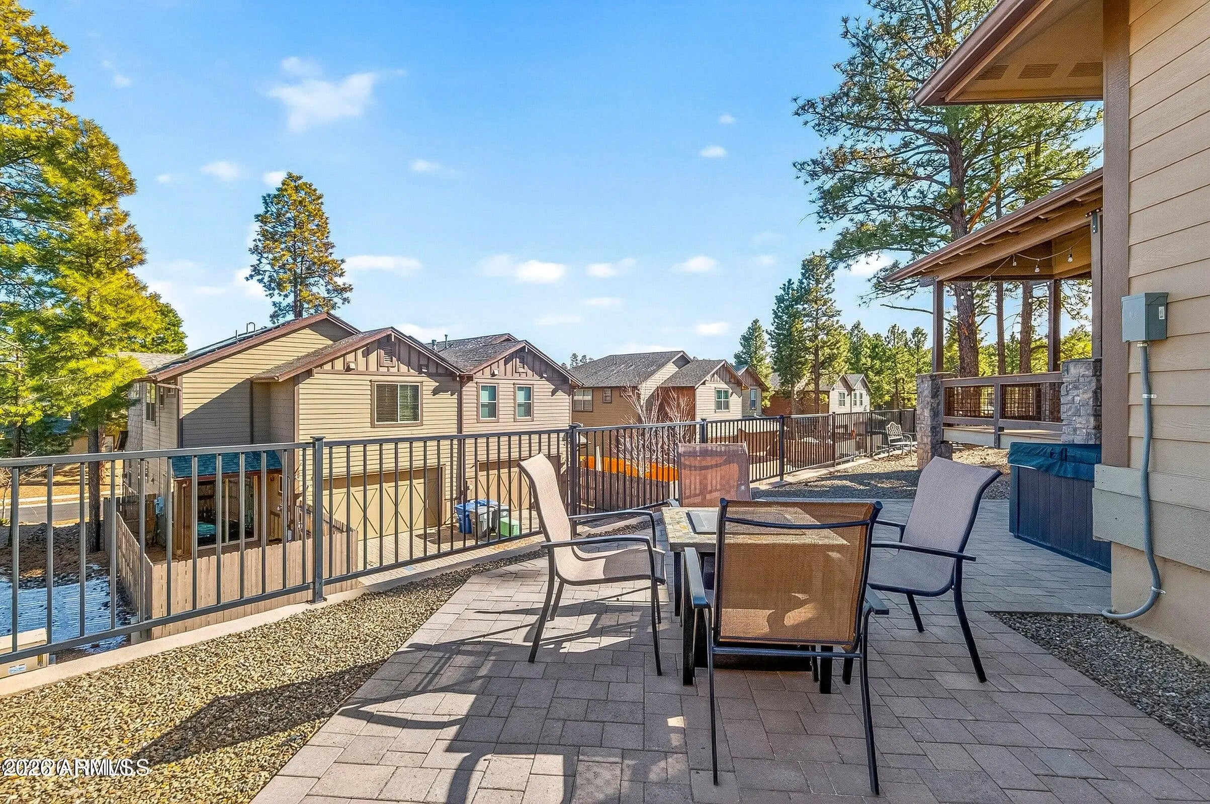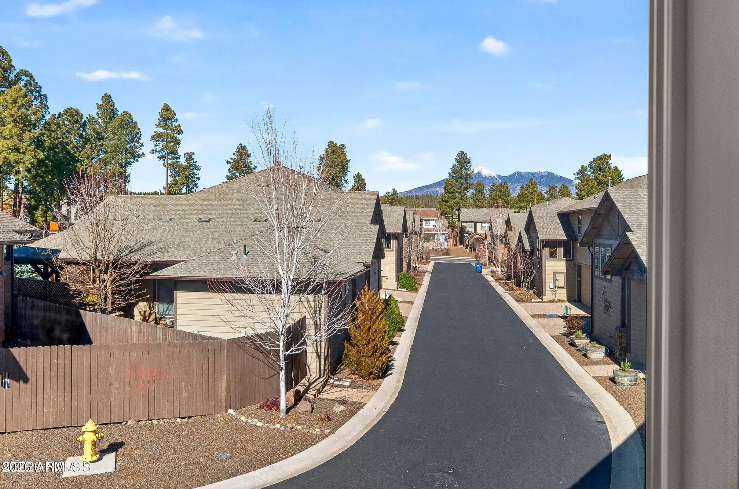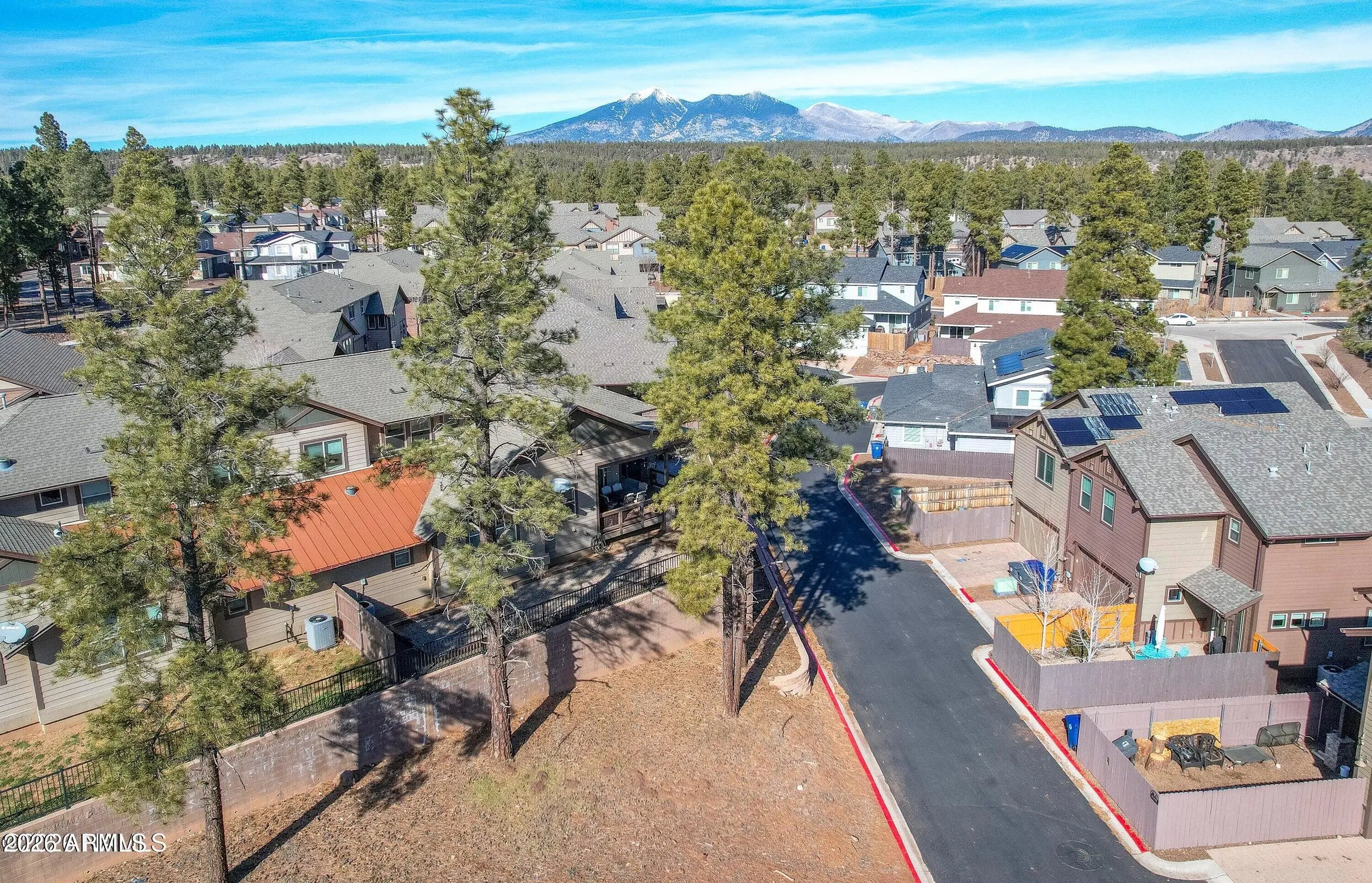 Located on a peaceful European looking street, tucked away within Presido on a premium, oversize lot you will find this thoughtfully crafted townhome with views of the San Francisco Peaks. With attention to detail in mind, you will find 8ft doors, a remodeled gas fireplace, custom screen doors, sun tubes, LED lighting, real hardwood floors, electric shades, light dimmers, under and upper cabinet lighting. Primary bedroom on the main floor featuring dual sinks in the bathroom and a tiled walk-in shower. The kitchen offers abundant lighting, upgraded appliances and a stylish tiled backsplash. The 1 bedroom 1 bath casita offers endless possibilities. Outside is perfect for entertaining offering a fire pit area, Jacuzzi, and a bocce ball court with complimentary string lights. Covered al fresco dining area with trex deck is perfect for summer nights. The location is perfect with a park just a stones throw away, offering basketball courts, volleyball courts, bark park, and playground. 10-minute drive to Northern Arizona University.