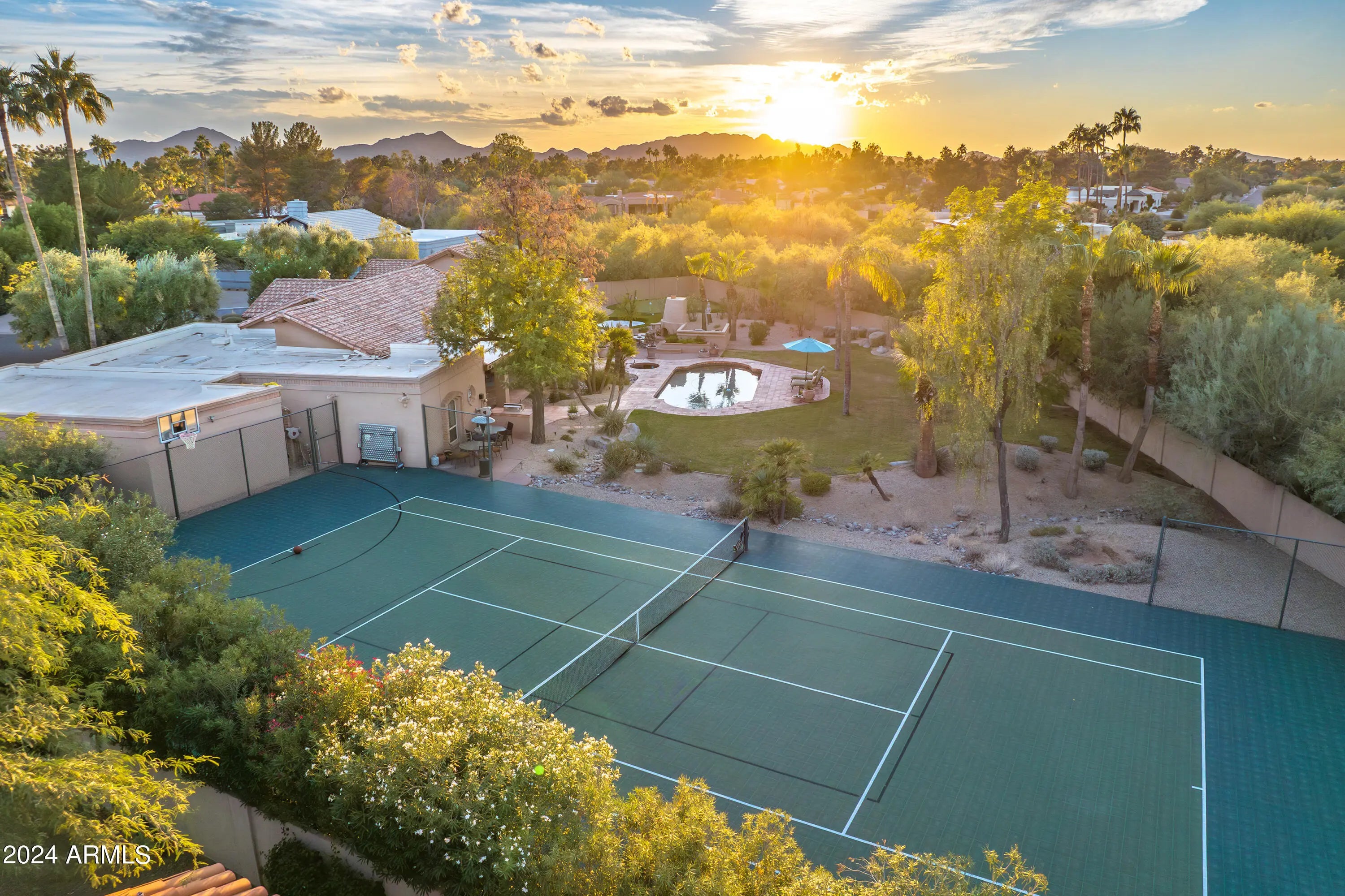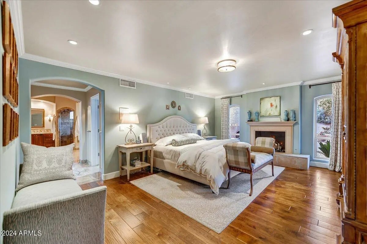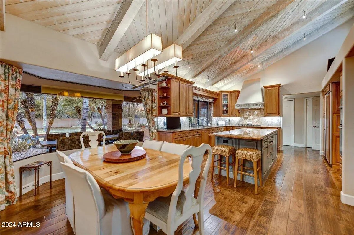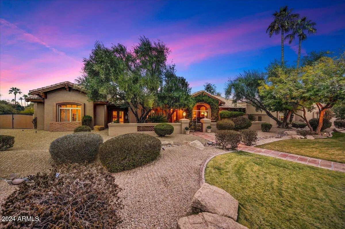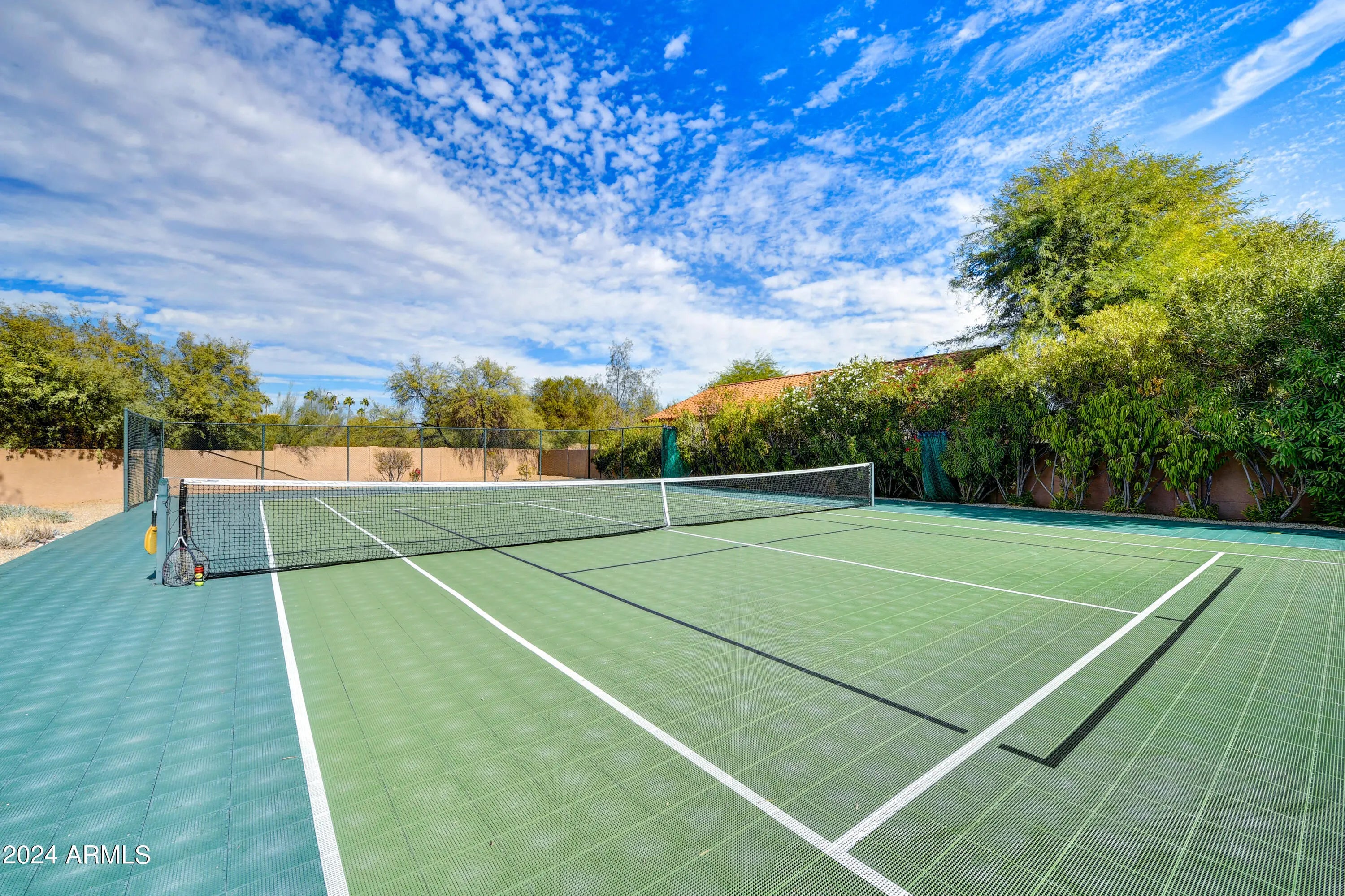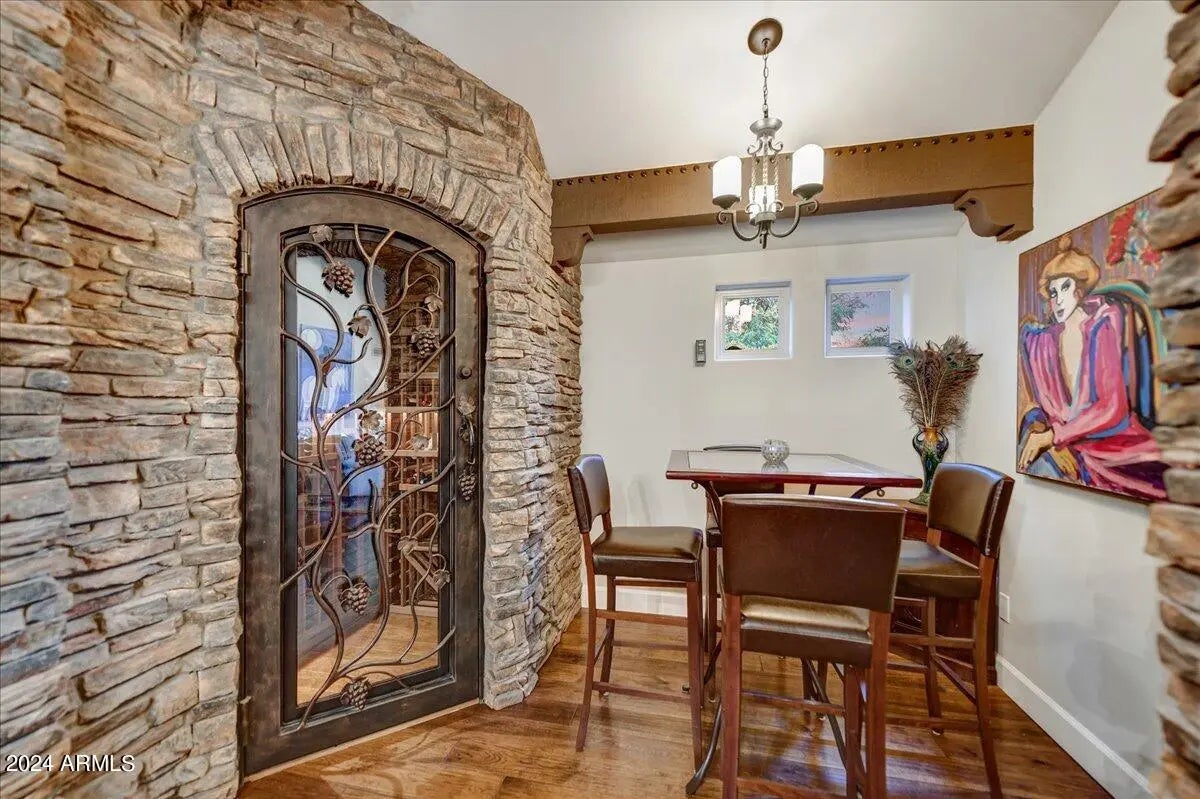 Welcome to this remarkable Scottsdale estate, perfectly situated on a private cul-de-sac in one of the area's most desirable enclaves. Thoughtfully designed for both sophisticated living and exceptional entertaining, this residence offers four bedrooms, four bathrooms, and an array of impressive amenities. Rich hickory wood flooring, dramatic wood beams, and multiple fireplaces infuse the home with warmth and timeless elegance. The gourmet kitchen is an entertainer's dream, showcasing an oversized island, butler's pantry, and premium finishes. Adjacent, the formal dining room is elevated by a stunning 435-bottle climate-controlled wine cellar, an impressive centerpiece for hosting and celebrations. A spacious game and media room complete with a 100-inch screen and 4K projector complemented with 7 speaker and surround sound sets the stage for unforgettable movie nights, while a dedicated spacious home gym brings convenience and wellness right to your doorstep. The luxurious primary suite serves as a true sanctuary, featuring dual walk-in closets, a spa-inspired walk-in shower, and a jetted soaking tub supplied by its own tankless hot water heater. Step outside to your private oasis, where a heated pool and spa, 500sq ft putting green, and chipping area and tee box green, and along with a full regulation size tennis court that doubles as a /pickleball court create an unparalleled retreat for recreation and relaxation. Conveniently located just minutes from freeway access and a wealth of shopping, dining, and entertainment options, this exceptional property offers both privacy and proximity. Opportunities like this are truly rare.