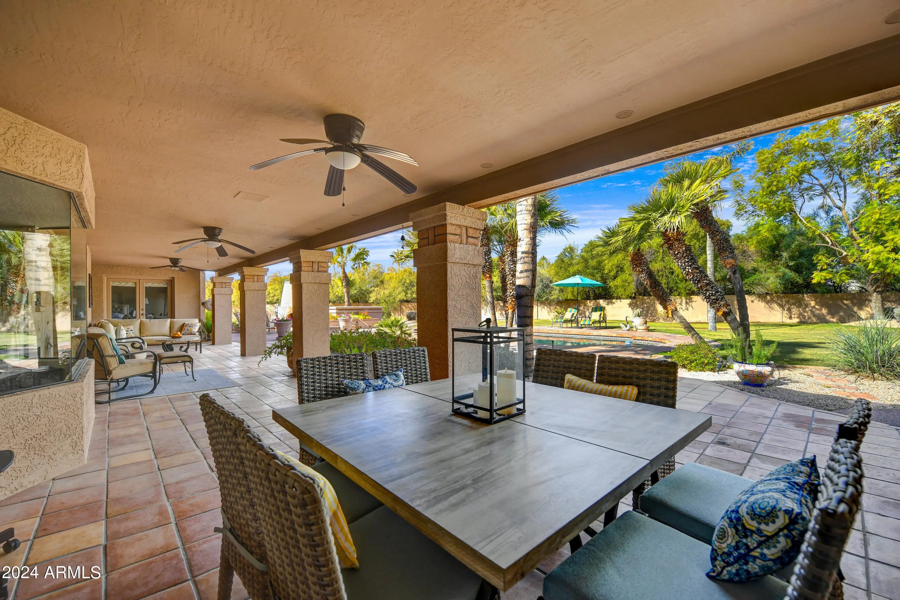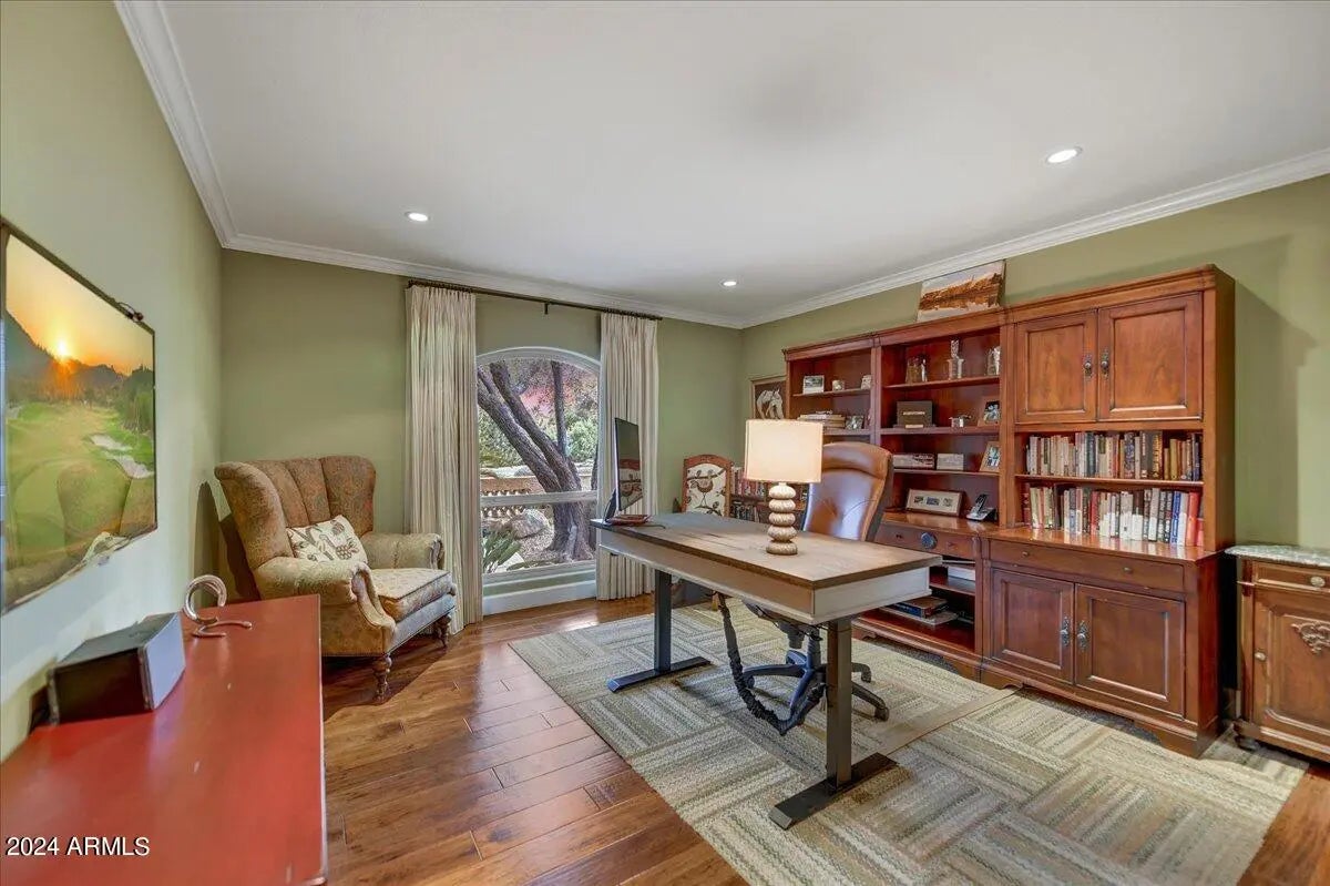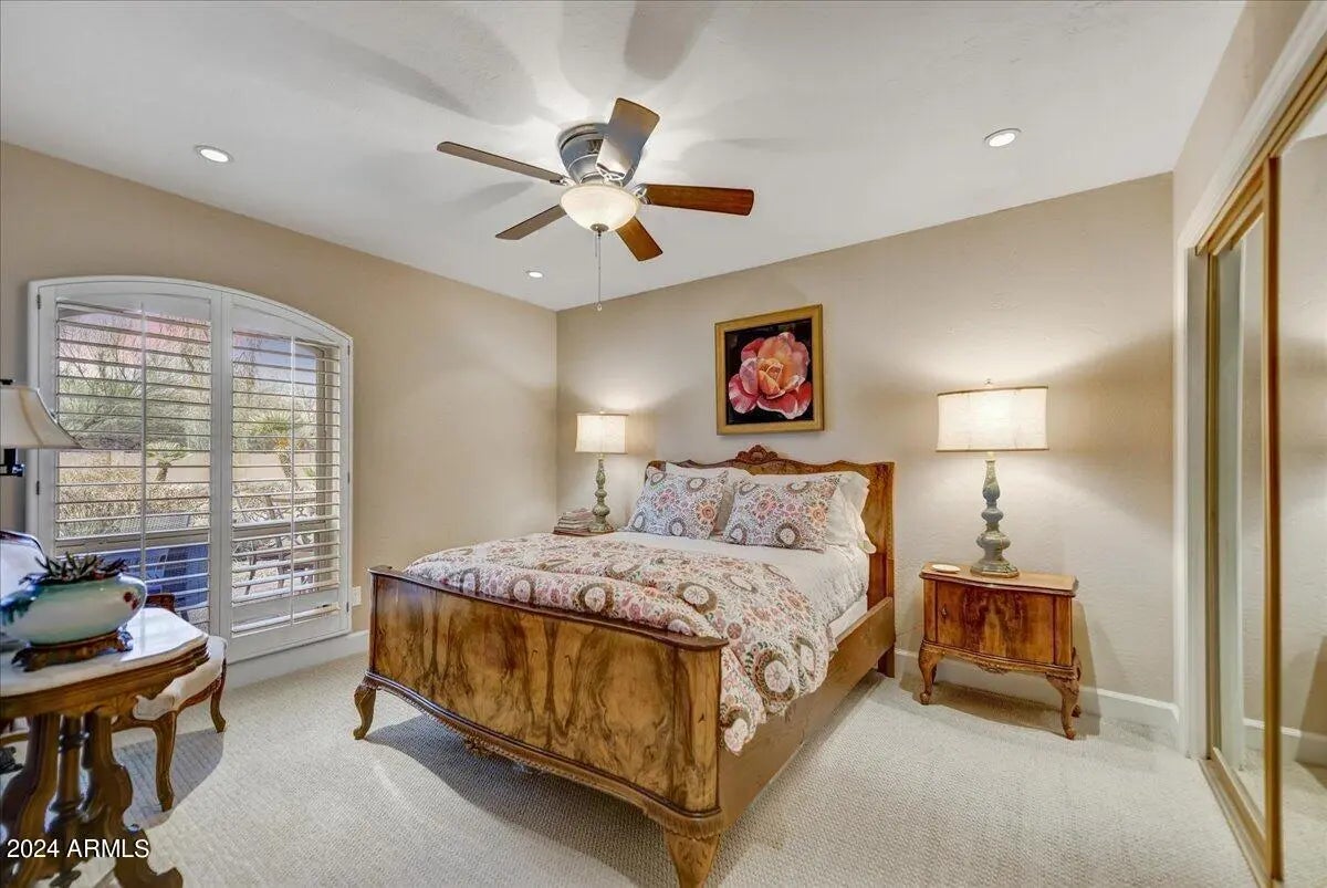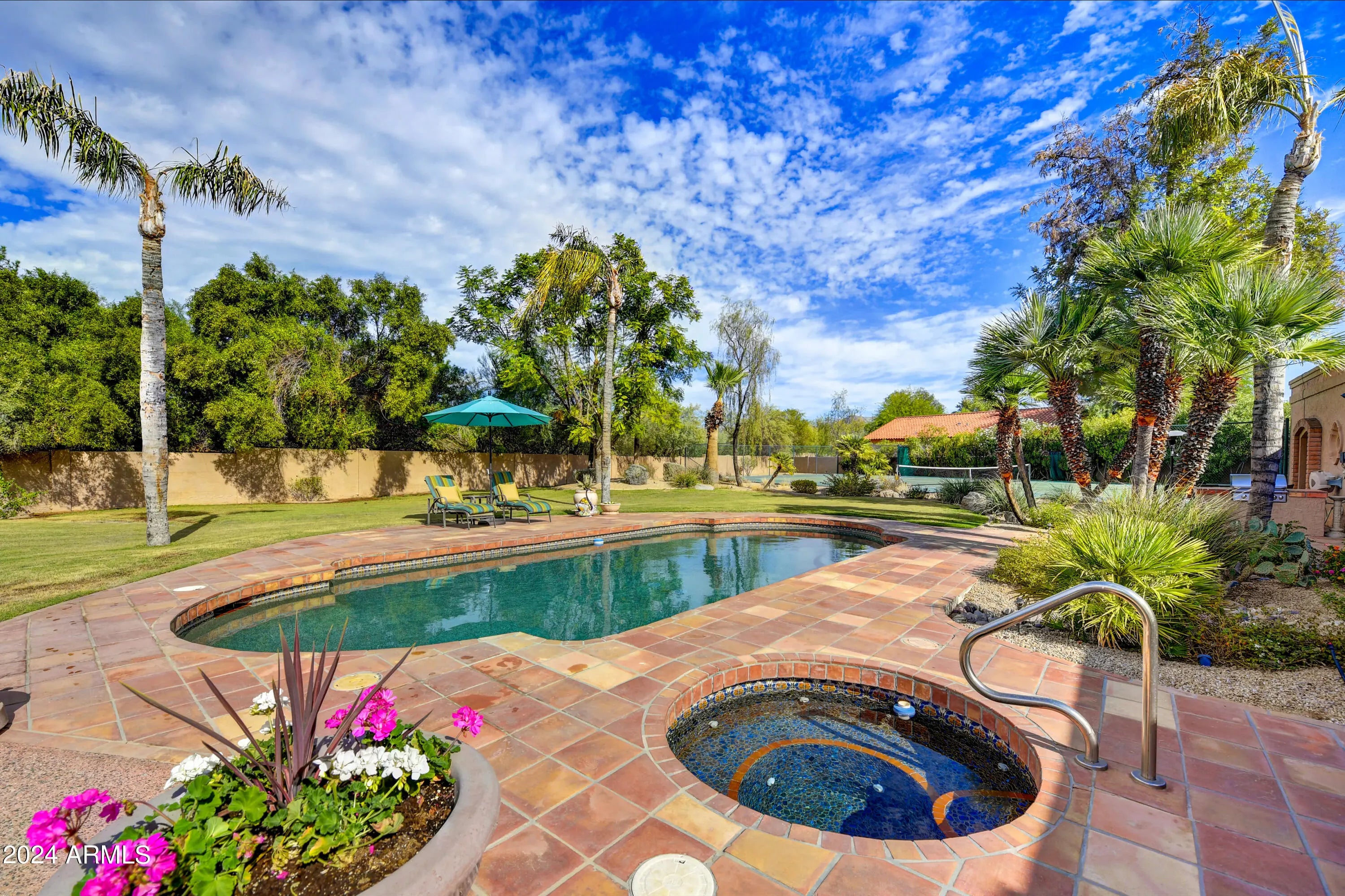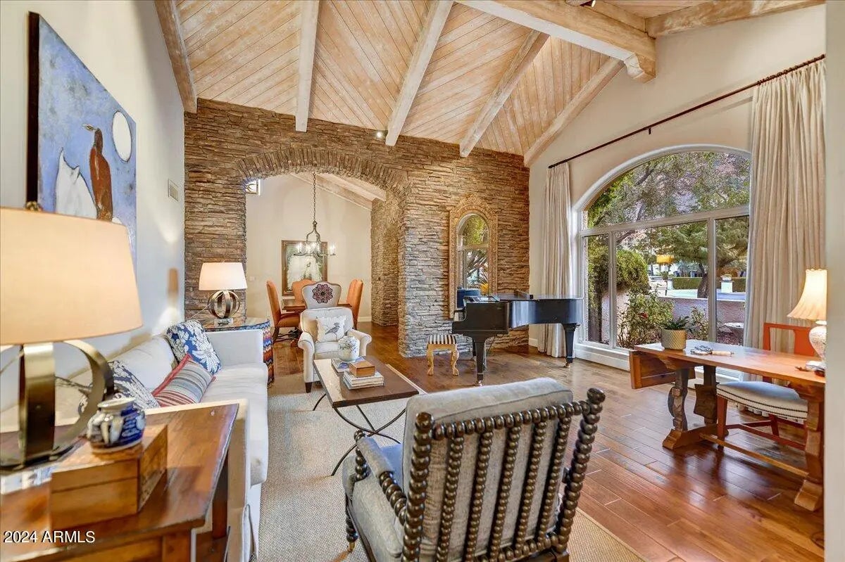 Welcome to this remarkable Scottsdale estate, perfectly situated on a private cul-de-sac in one of the area's most desirable enclaves. Thoughtfully designed for both sophisticated living and exceptional entertaining, this residence offers four bedrooms, four bathrooms, and an array of impressive amenities. Rich hickory wood flooring, dramatic wood beams, and multiple fireplaces infuse the home with warmth and timeless elegance. The gourmet kitchen is an entertainer's dream, showcasing an oversized island, butler's pantry, and premium finishes. Adjacent, the formal dining room is elevated by a stunning 435-bottle climate-controlled wine cellar, an impressive centerpiece for hosting and celebrations. A spacious game and media room complete with a 100-inch screen and 4K projector complemented with 7 speaker and surround sound sets the stage for unforgettable movie nights, while a dedicated spacious home gym brings convenience and wellness right to your doorstep. The luxurious primary suite serves as a true sanctuary, featuring dual walk-in closets, a spa-inspired walk-in shower, and a jetted soaking tub supplied by its own tankless hot water heater. Step outside to your private oasis, where a heated pool and spa, 500sq ft putting green, and chipping area and tee box green, and along with a full regulation size tennis court that doubles as a /pickleball court create an unparalleled retreat for recreation and relaxation. Conveniently located just minutes from freeway access and a wealth of shopping, dining, and entertainment options, this exceptional property offers both privacy and proximity. Opportunities like this are truly rare.