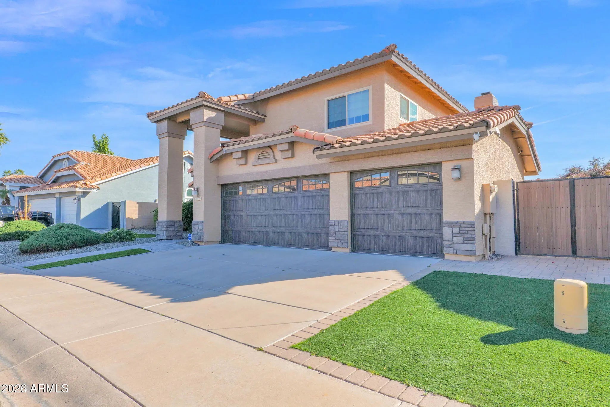 WELCOME HOME! This home has been beautifully upgraded. From the moment you drive up to the home, you will be welcomed with custom garage doors, oversized custom metal front door, and gorgeous pavers. The designer kitchen has been reimagined with an oversized island, abundance of designer cabinets with loads of storage and gorgeous quartz countertops. The primary retreat has a balcony to enjoy sunsets and dual sinks, private dressing table area and a master closet fit for a queen. The yard is an oasis with pergolas, a built in kitchen perfect for entertaining, easy care turf and beautiful pavers. The upgrades in this home truly set it apart. Enjoy newer windows, ACs, flooring, custom cabinetry throughout, two fire places, custom metal hand railing to name a few. Enjoy the idealic Islands! LIST OF UPGRADES AND IMPROVEMENTS: New flooring (tile, vinyl, carpet) throughout (2019-2020) Replaced fans throughout Staircase upgraded with custom made metal hand railing (2020) Juliet balcony installed with custom made metal railing (2020) New iron front entry door with glass/privacy screen (Sept 2024); Montes Iron Door Two new HVAC systems; #1 new TRANE condenser and air handler (August 2020); #2 new TRANE condenser (March 2022); Orangutan Total Home Comfort Whole House Air Purifier (UV Clean Air) installed March 2022; Orangutan Total Home Comfort New electric water heater (March 2021); M-R Plumbing, LLC Nest thermostats Water softener installed (2022) New garage doors (2021; double and single) + wifi garage door openers (Chamberlain) Epoxy garage floor (2021) New windows everywhere (except street facing in living room); American Vision Windows of Arizona (2017-2020) Replaced indoor doors throughout Replaced toilets throughout Entirely rebuilt & enlarged the outdoor deck/balcony/railing (permitted; 2020) Had x1 freestanding Alumawood pergola and x2 attached Alumawood pergolas installed in backyard; Goldfield Awnings (2022) Renovated entire front (2021) and back yard (2020) with landscape/hardscape (stuccoed the walls, built planters, installed pavers and artificial grass) Built outdoor kitchen with storage, sink, gas grill, ice chest, mini fridge (2020) French drain installed (back/front yard) Gutters in backyard (2021) Custom side gate (2020) Custom (Home Depot) Bali Blackout Cellular Shades throughout Outdoor shed on east side of backyard (2022) Notable: home has 2 wood burning fireplaces Laundry Room New tile floor, cabinets New washer/dryer (2024) Downstairs Guest Bedroom/bathroom New carpet; closet doors, closet system Bathroom: vanity/sink, flooring (tile), remodeled the shower Kitchen/Family Room Complete kitchen renovation (flooring, custom KraftMaid cabinetry, countertops, appliances, enlarged custom island) (2020) Replaced lighting (chandeliers and LED recessed lights) Installed a 10ft glass sliding door to the yard (American Vision Windows of Arizona Electricity run so TV could be mounted above fireplace Dining Room Tile flooring; custom KraftMaid cabinetry/bar with countertops (2019) Replaced chandelier Living Room Flooring, remodeled fireplace, custom made window shutters (2019) Master Bedroom/Bathroom Complete bathroom renovation (new bathtub, shower, vanity, sinks, flooring) (2019) Removed master closet (previously located in the bathroom) and relocated the closet to a custom made walk-in closet (built from converting adjacent smaller bedroom) with combination of Ikea closet systems/hand-made custom closet system New door (American Vision Windows of Arizona) + security door (First Impression Ironworks) installed leading out to deck/balcony from master bedroom Deck/balcony resurfaced (Jan 2026) Upstairs Bathroom New custom vanity, sink, flooring, remodeled shower and resurfaced the bathtub (2019) 1) Landscaping/Hardscaping + Deck Rebuild (permitted through city of Gilbert) + Outdoor kitchen build 2) Kitchen & Bathroom renovations, tile & vinyl flooring, cabinetry installations, Juliet balcony