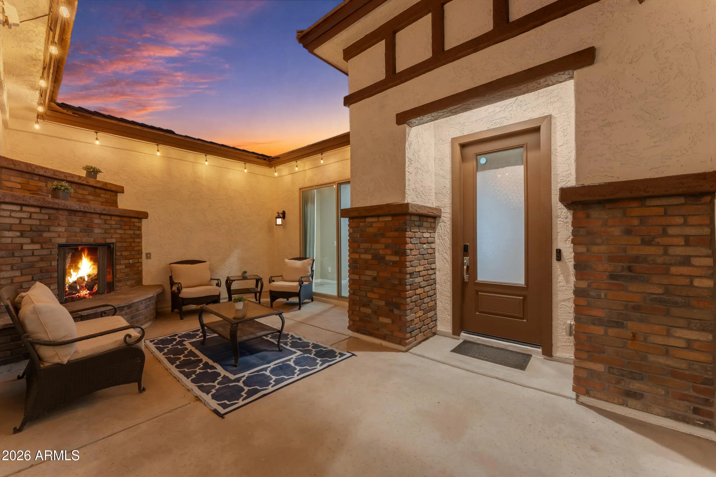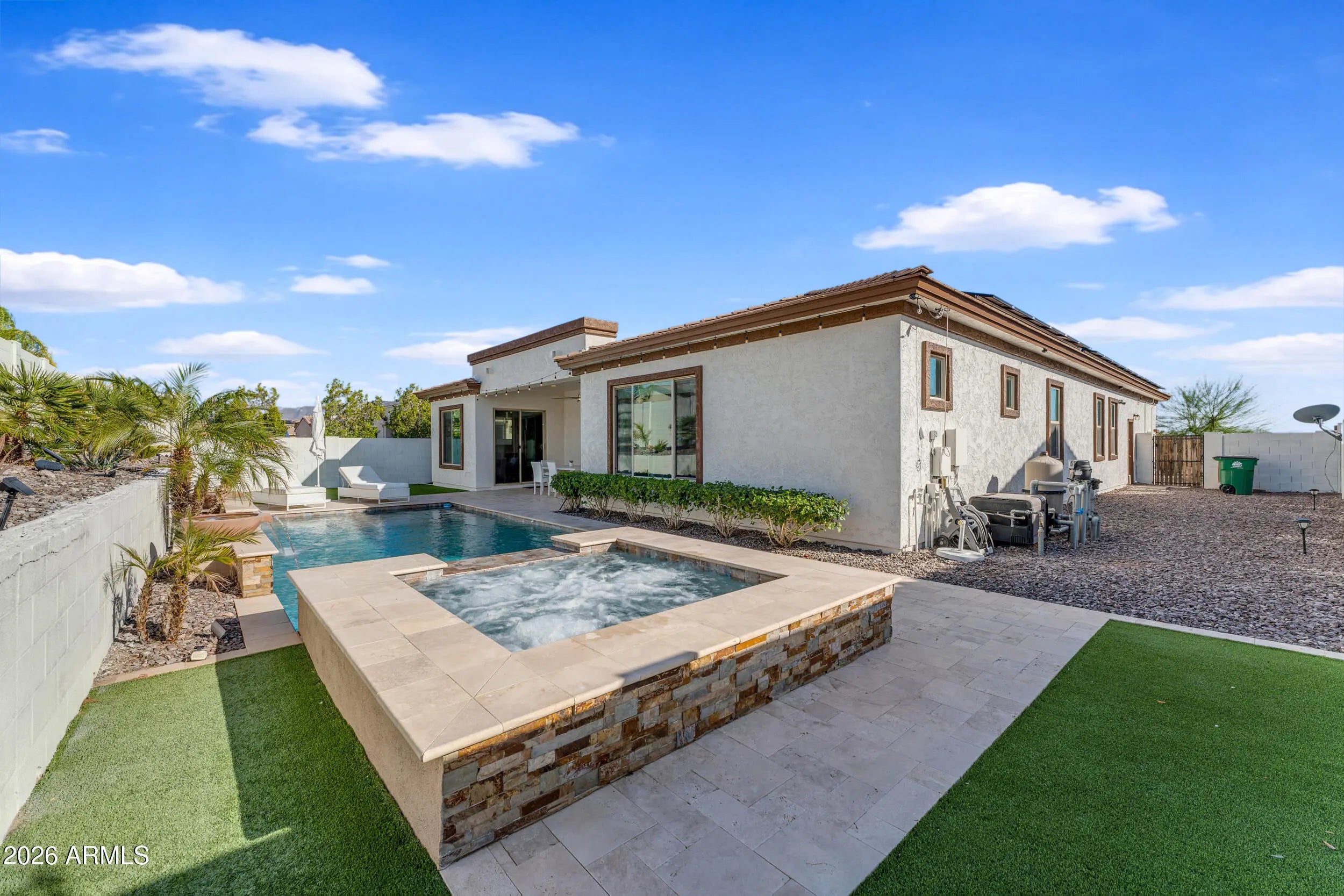 This is the Estrella lifestyle buyers dream about. Resort-style living meets smart, energy-efficient design in this stunning single-level home & private backyard oasis. A welcoming front courtyard with a built-in fireplace sets the tone for relaxed evenings and effortless entertaining. Inside, the open, light-filled layout features a spacious great room, a beautifully upgraded kitchen with a large center island, granite countertops, subway tile backsplash, & abundant cabinetry--perfect for gatherings both big and small. Smart-home features elevate everyday living, including app-controlled lighting & electrical switches for the porch, garage, entry, fireplace, & pool/spa, along w/ a Nest thermostat for efficient climate control. The primary suite feels like a spa retreat with an oversized walk-in shower, separate soaking tub, separate vanities, and large walk-in closet. Outside, enjoy a showstopping Pebble Tec pool and spa with waterfall features, painted block wall for privacy, professional landscaping, & low-maintenance turf. Located in the master planned community of Estrella Mountain Ranch, residents enjoy 65+ miles of hiking & biking trails, 2 private lakes spanning 72 acres, a yacht club, 2 Resident's Clubs w/ state of the art fitness centers, pools, splash pads, waterparks, cafes & lounges, sports courts: basket ball, volleyball, tennis, & pickle ball, a Nicklaus-designed championship golf course, over 40+ neighborhood parks, & an unmatched sense of community. This isn't just a home-it's the lifestyle everyone wants.