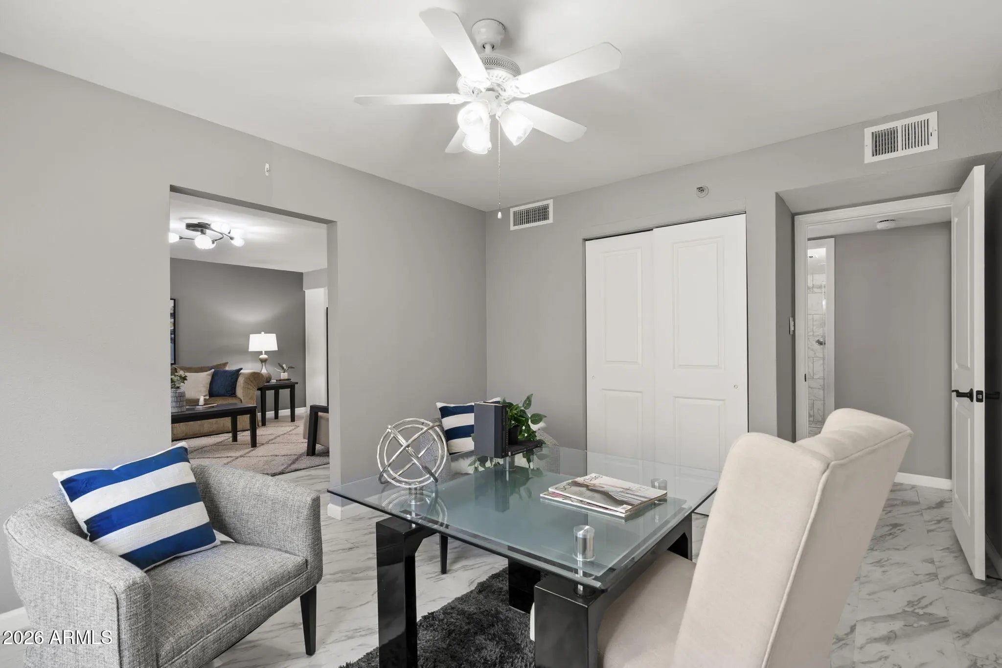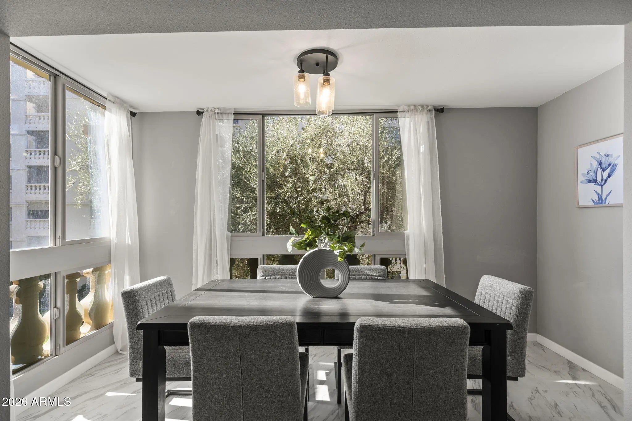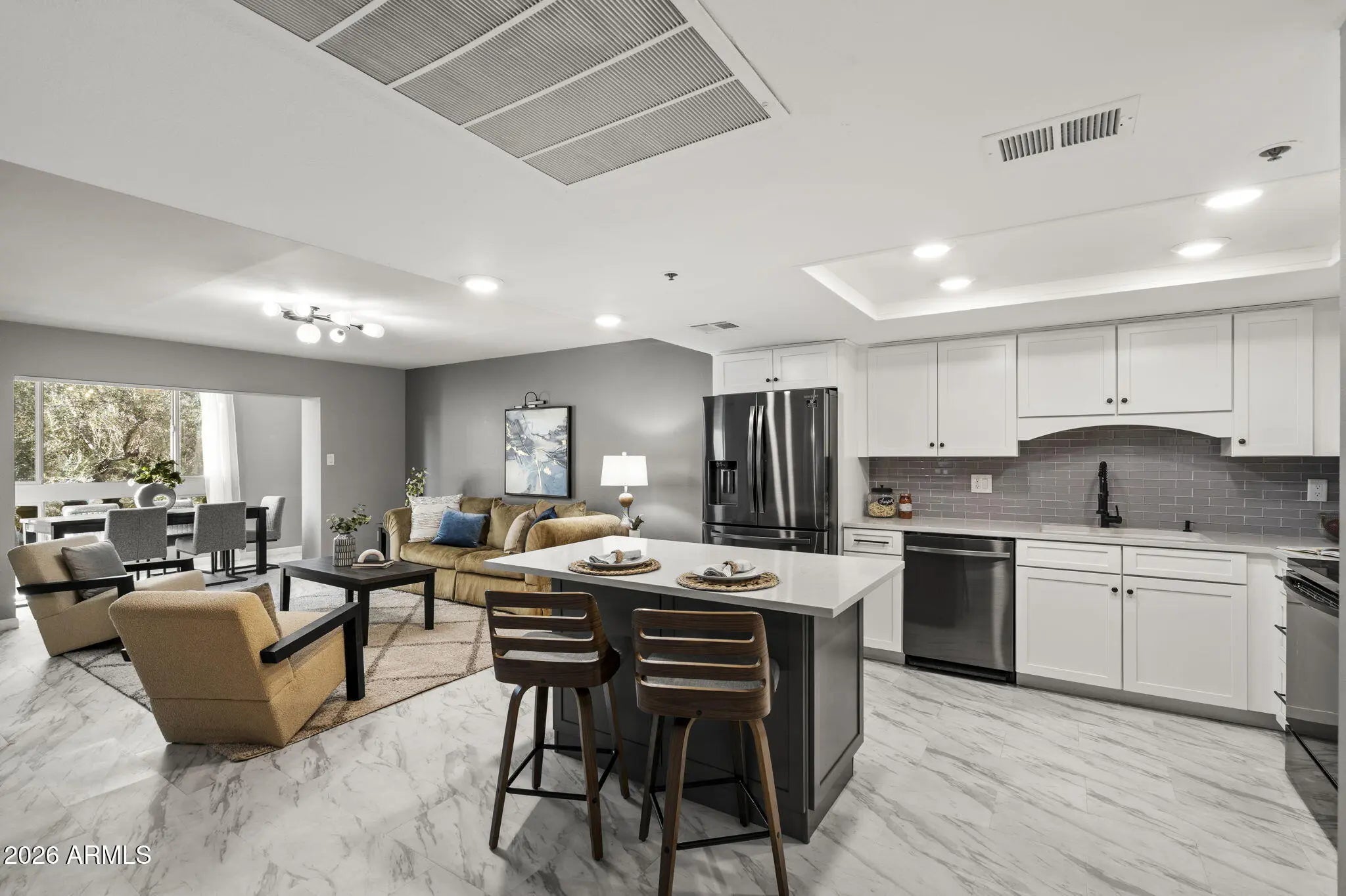 Beautifully updated 2 bedroom/2bath residence in the highly desirable, guard-gated Scottsdale Shadows community. This light-filled unit offers a clean modern aesthetic with neutral wall tones, expansive windows, and marble look tile flooring throughout. The open kitchen and both bath have been thoughtfully updated with quartz countertops, stainless steel appliances and a fresh contemporary design. The enclosed patio adds valuable living space and functions beautifully as a dining area, making the unit larger than the 1200 sq ft reflected in the tax records. The result is a bright, airy layout that lives larger and feels effortlessly inviting. And new air handler, new electrical panel, and new windows makes this unit super efficient!! Scottsdale Shadows offers an unmatched resort-style lifestyle with extensive amenities, including ga 9-hole golf course, walking and biking paths, tennis courts, multiple heated pools and spas, fitness center, clubhouse, media and recreation rooms, community laundry, and serene lake features - all within a guard-gated setting ideally located just steps from Old Town Scottsdale's fun attractions. Don't miss your chance to own a move-in-ready, modern home in one of Scottsdale's iconic communities.