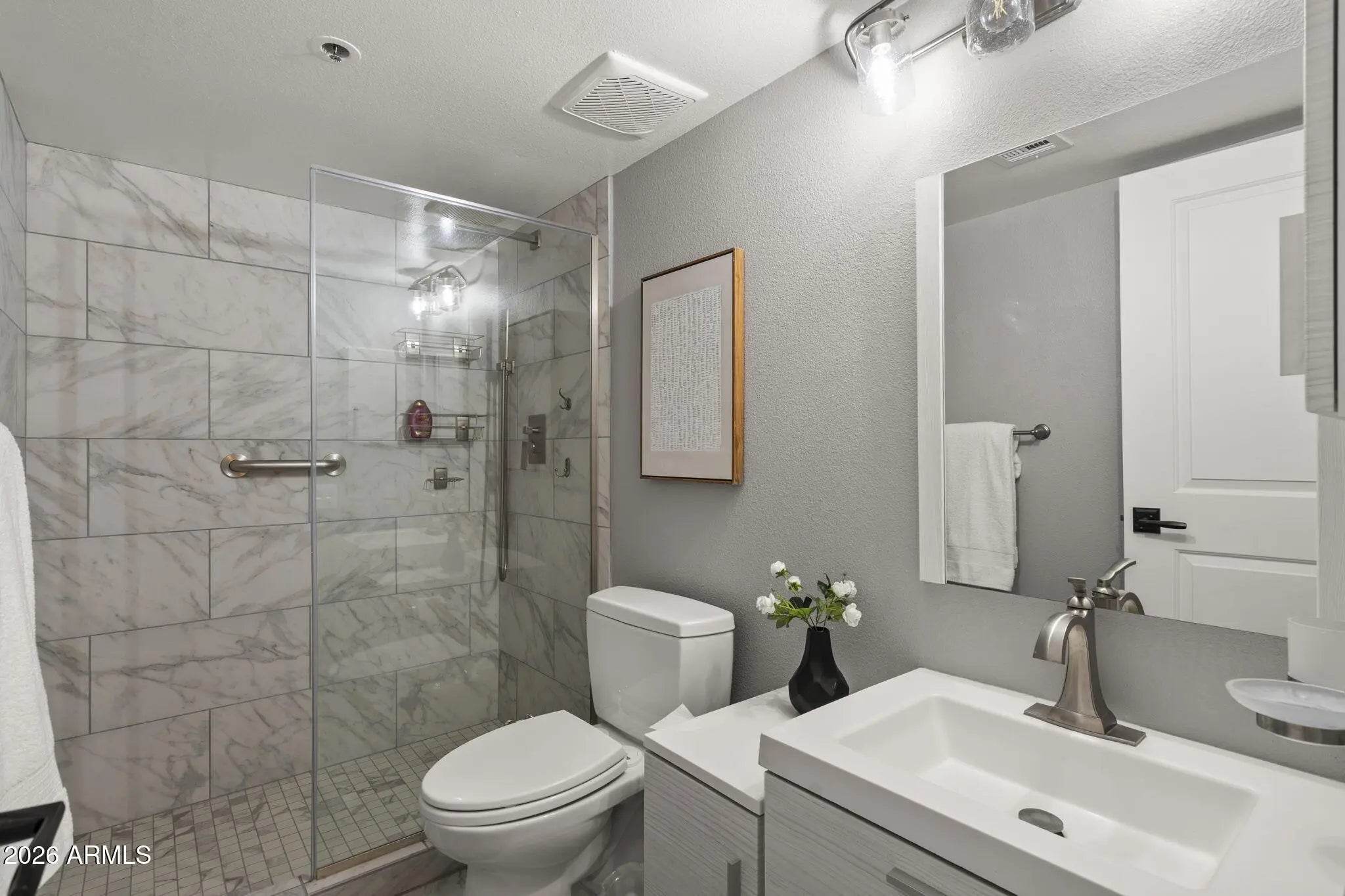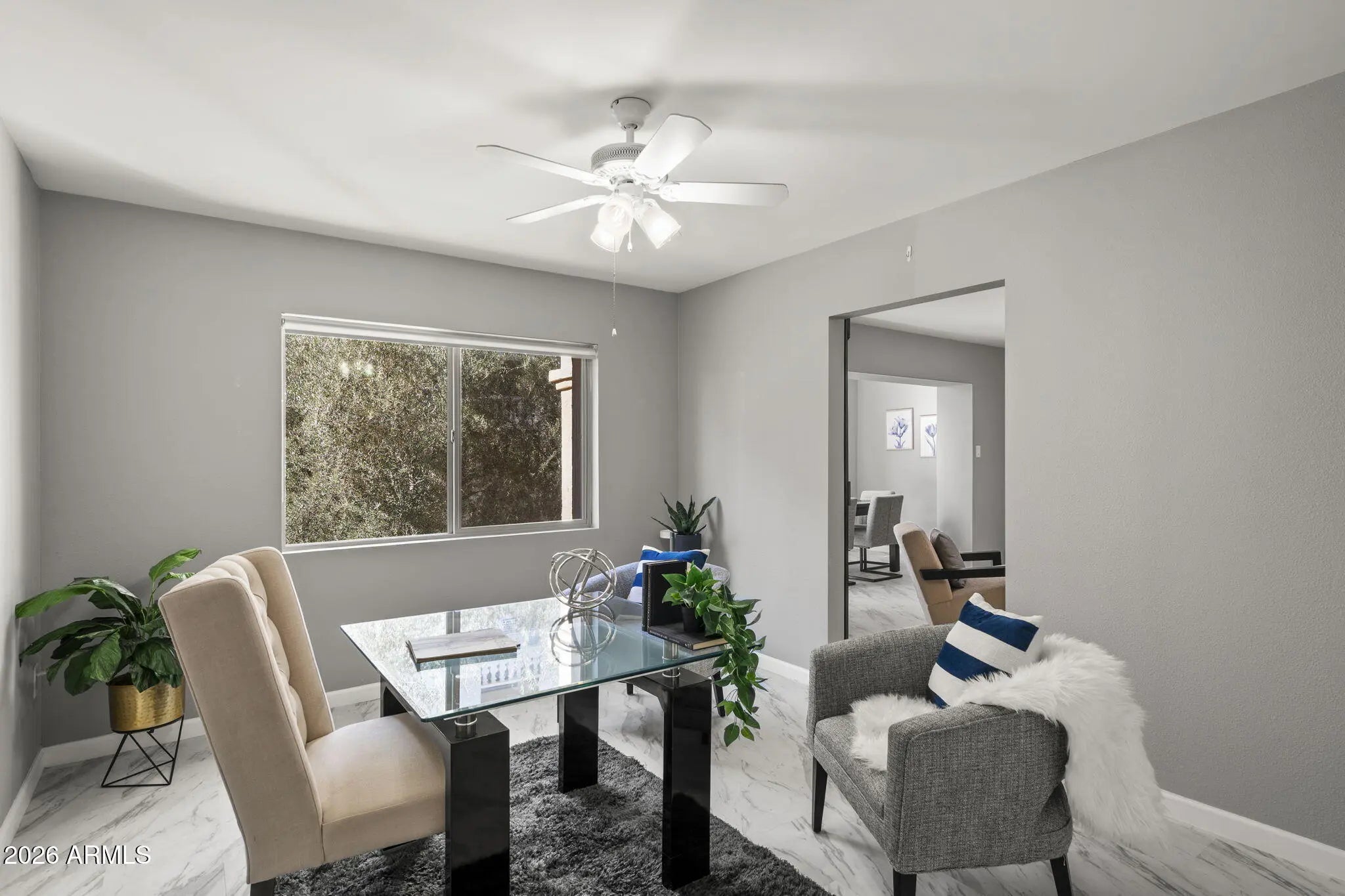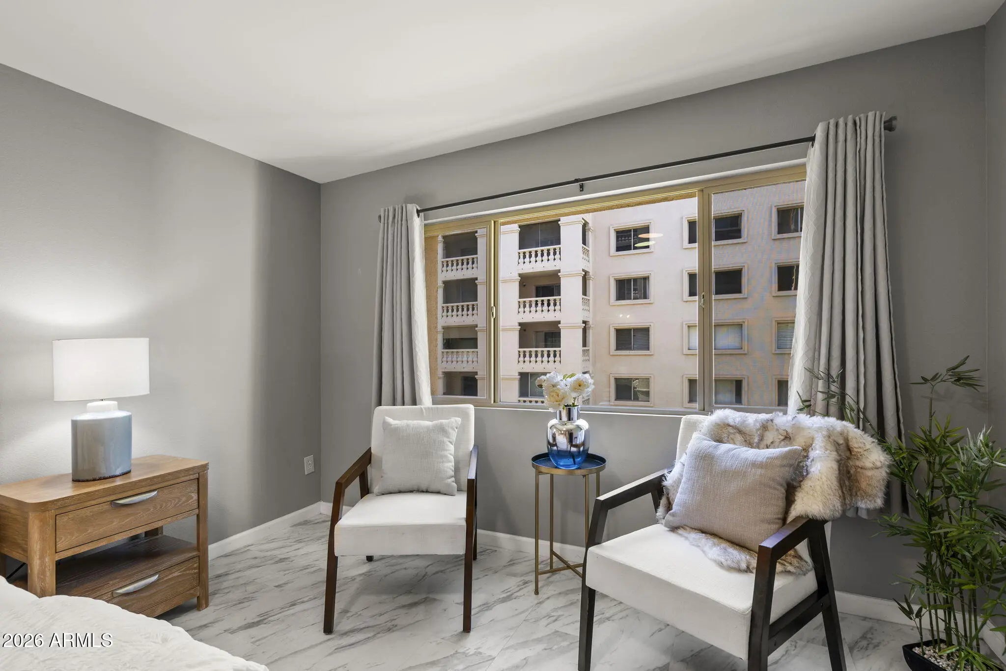 Beautifully updated 2 bedroom/2bath residence in the highly desirable, guard-gated Scottsdale Shadows community. This light-filled unit offers a clean modern aesthetic with neutral wall tones, expansive windows, and marble look tile flooring throughout. The open kitchen and both bath have been thoughtfully updated with quartz countertops, stainless steel appliances and a fresh contemporary design. The enclosed patio adds valuable living space and functions beautifully as a dining area, making the unit larger than the 1200 sq ft reflected in the tax records. The result is a bright, airy layout that lives larger and feels effortlessly inviting. And new air handler, new electrical panel, and new windows makes this unit super efficient!! Scottsdale Shadows offers an unmatched resort-style lifestyle with extensive amenities, including ga 9-hole golf course, walking and biking paths, tennis courts, multiple heated pools and spas, fitness center, clubhouse, media and recreation rooms, community laundry, and serene lake features - all within a guard-gated setting ideally located just steps from Old Town Scottsdale's fun attractions. Don't miss your chance to own a move-in-ready, modern home in one of Scottsdale's iconic communities.