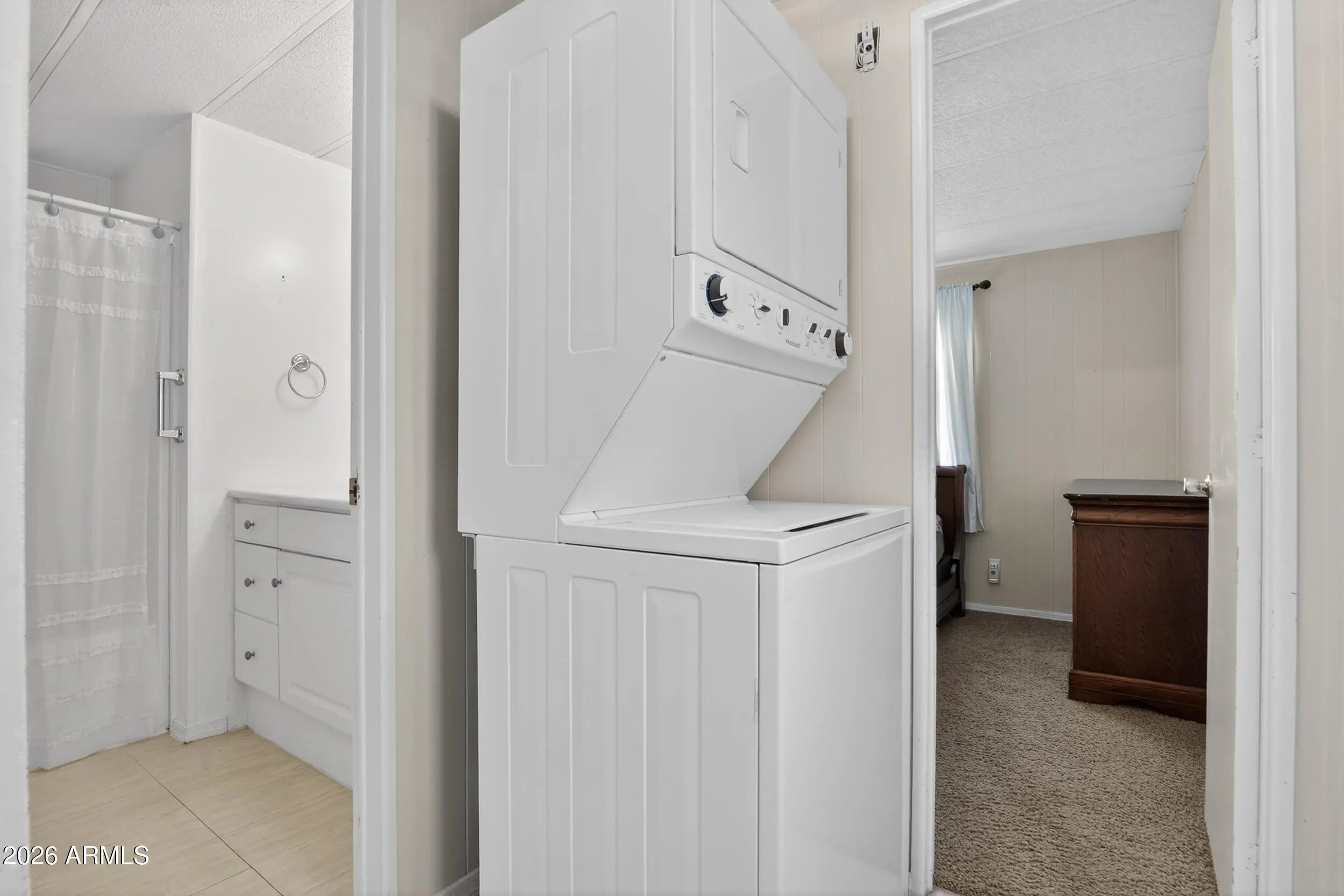 Stacked Washer/Dryer, Dryer, Washer, Refrigerator, Electric Range