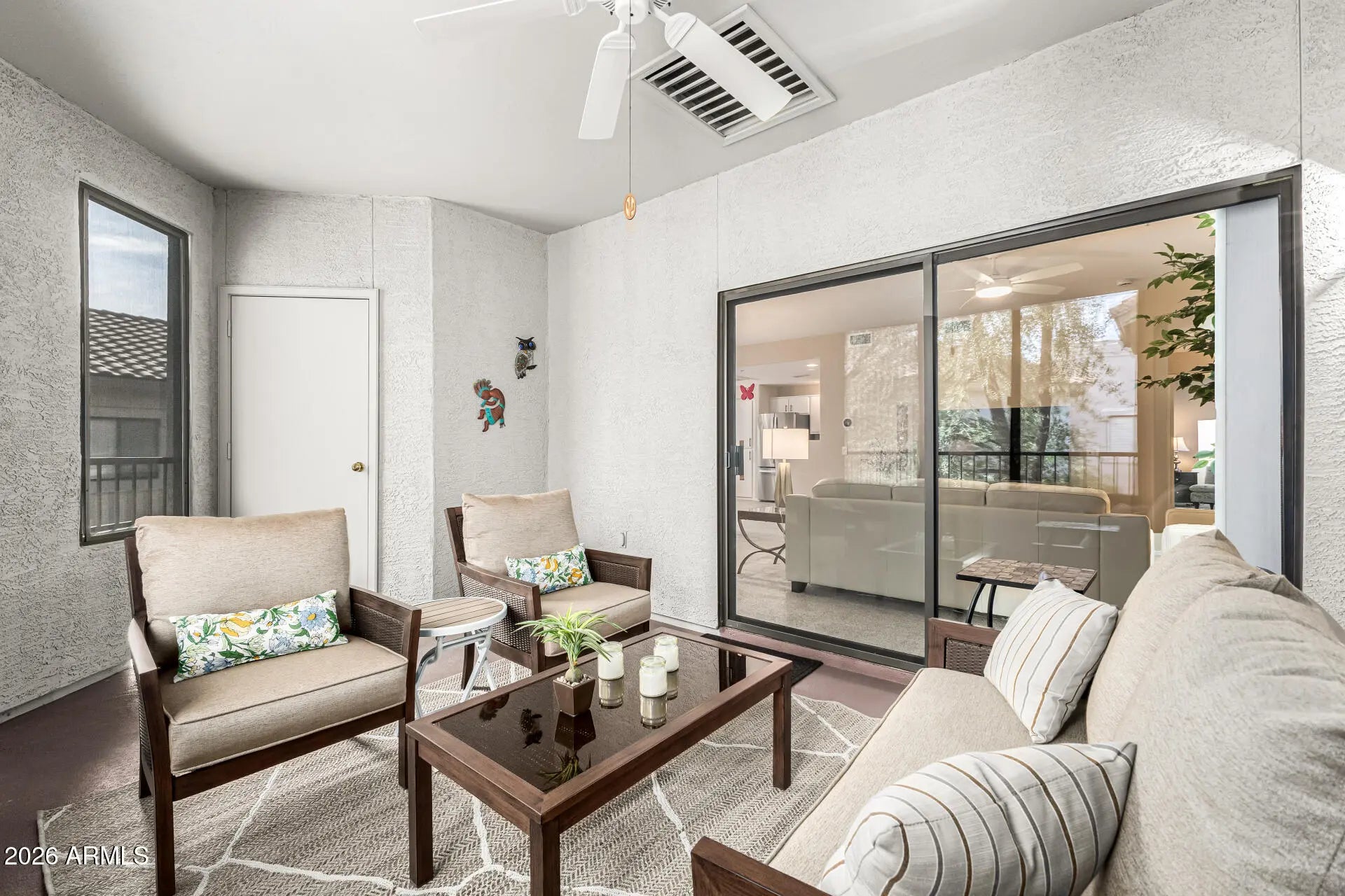 Discover the ultimate North Scottsdale lifestyle in this meticulously maintained gated retreat of Ladera Vista. As the communities largest floor plan, this impressive end unit features split 2 bedroom layout, large den, and two expansive private screened in patios. Professionally upgraded kitchen and bathrooms. Unit comes with a private one car garage- a true rarity in condo living. All new designer fans, dual-opening plantation shutters and window screens. Major appliances HVAC and water heater replaced in 2022-2023. Perfectly located, just moments away from world class shopping, recreation and freeway access. Furnishings available separate bill of sale making this luxury in the desert a true turn key move in ready home!