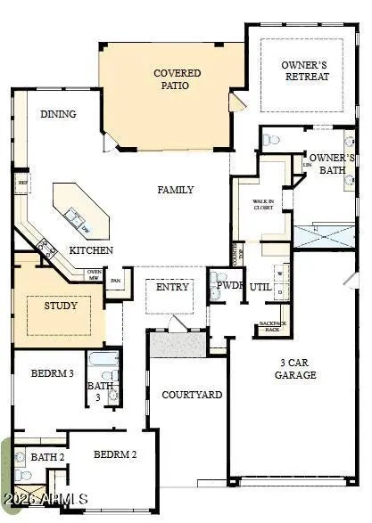 BRAND NEW gorgeous 3 ensuite beds, 3.5 baths, enclosed study, courtyard and extended covered patio accessed through 16' sliding glass door off family room; incredible gourmet kitchen with modern, white cabinets, GE Cafe stainless appliances with 42'' built-in side by side refrigerator, huge island with quartz tops, custom tiled backsplash, accent lighting over island, added dining cabinets; upgraded plank tile flooring, carpet/pad throughout; 2-tone paint; spa-like owner's bath with upgraded super shower with floor to ceiling tile and additional raincan showerhead; upper and lower utility room cabinets with sink and direct access to owner's walk-in closet; 2X6 CONSTRUCTION AND EXTENSIVE NEW HOME WARRANTY.