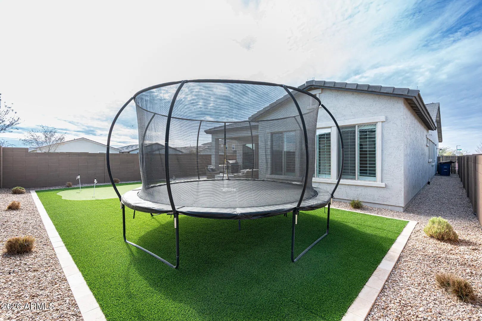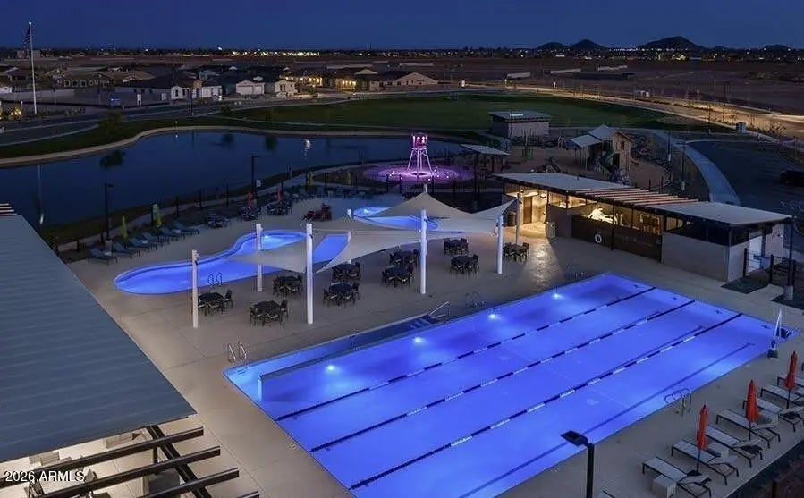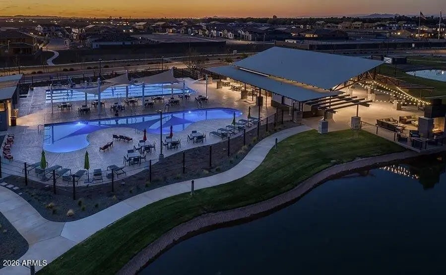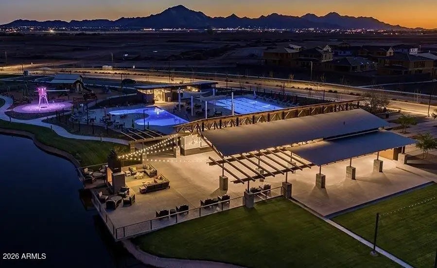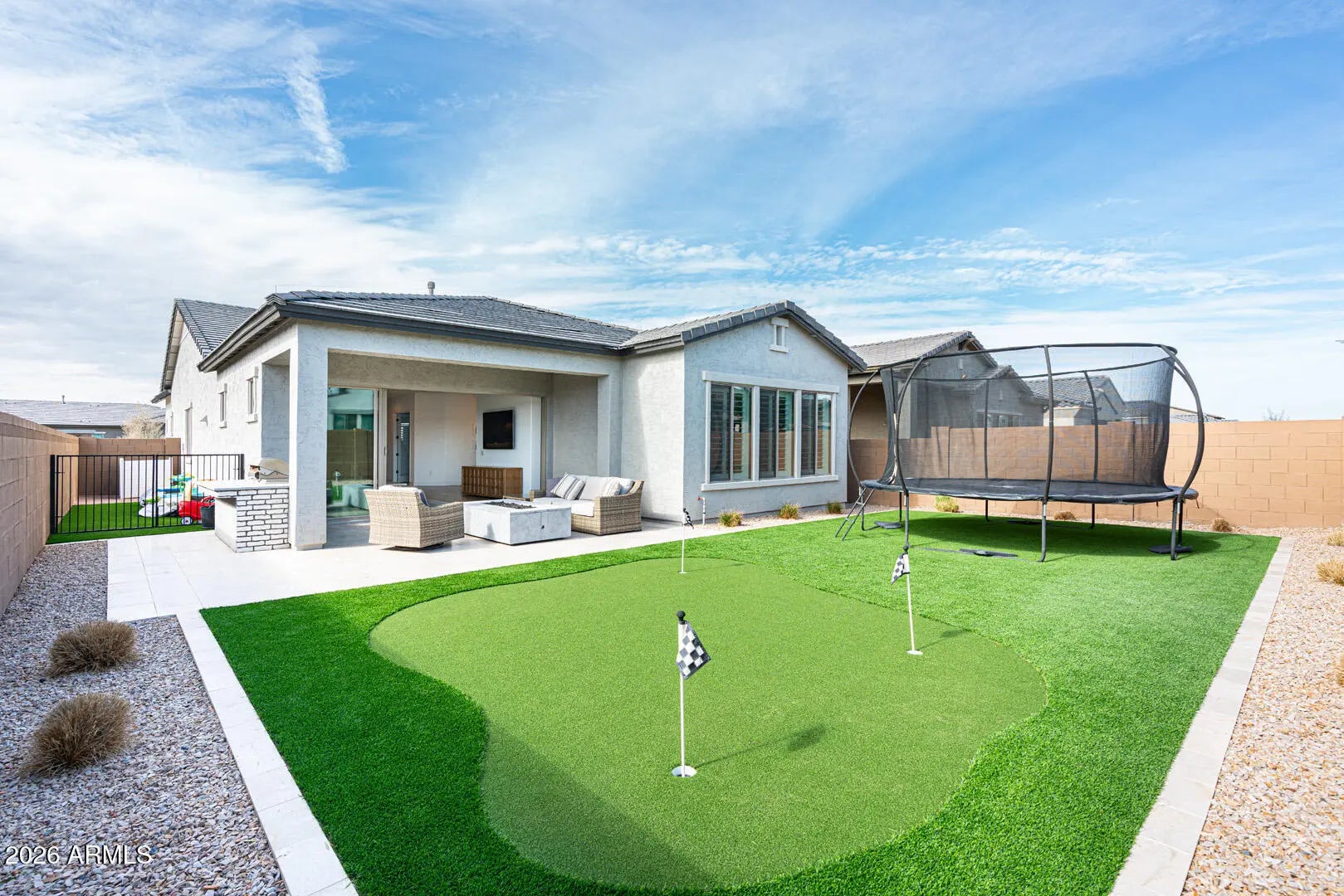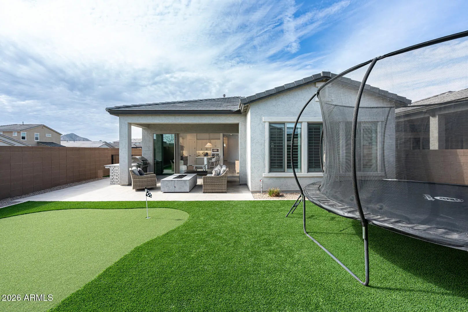 This home was thoughtfully designed to show like a model, featuring carefully selected upgrades that set it apart from standard new construction. Comparable to Model that recently sold for 715K. Situated on a superior corner lot, the layout is enhanced by a stunning cascading sliding glass door that seamlessly blends indoor and outdoor living. The backyard is already complete--no waiting, no guessing--with over $30,000 invested, including a gas fire pit, built-in BBQ, and putting green creating the perfect space for entertaining and Arizona evenings under the stars. Inside, the home offers three spacious bedrooms PLUS a true office with French doors, ideal for remote work, creative space, or a private retreat. The kitchen and living areas are elevated with under-cabinet lighting, custom shutters, and a refined, designer feel throughout. Functional upgrades include a water softener and reverse osmosis system, adding comfort and long-term value from day one. Harvest Meadows is known for its wide streets, community parks, playgrounds, and inviting green spaces, all conveniently located near top-rated schools, shopping, dining, and the charm of downtown Queen Creekwhile still offering a peaceful, neighborhood feel.