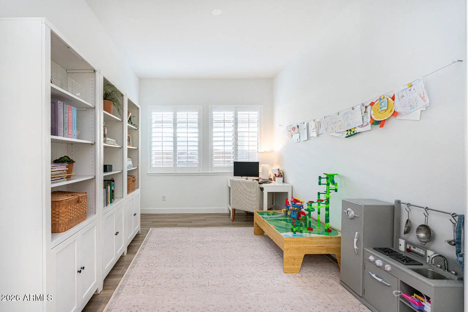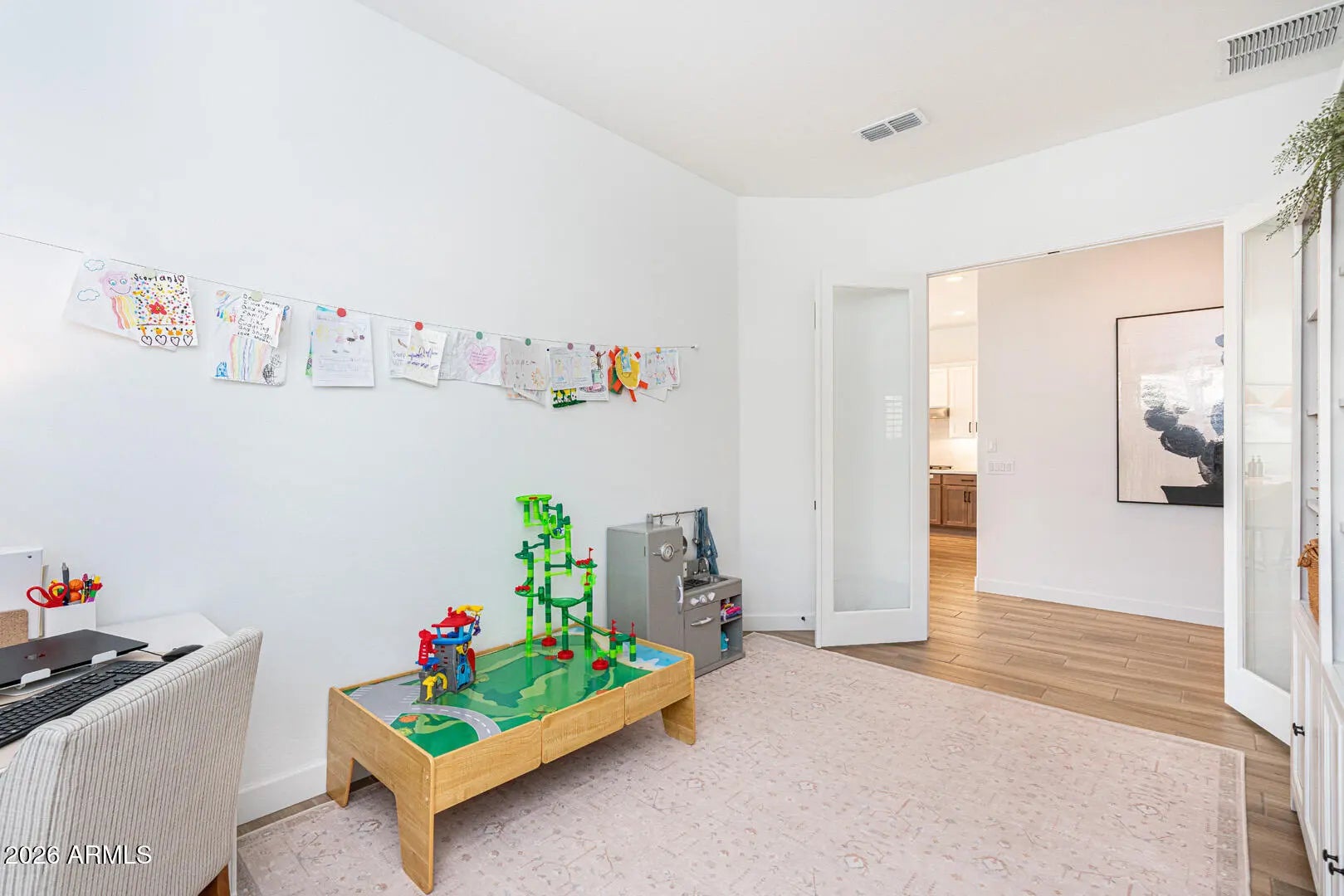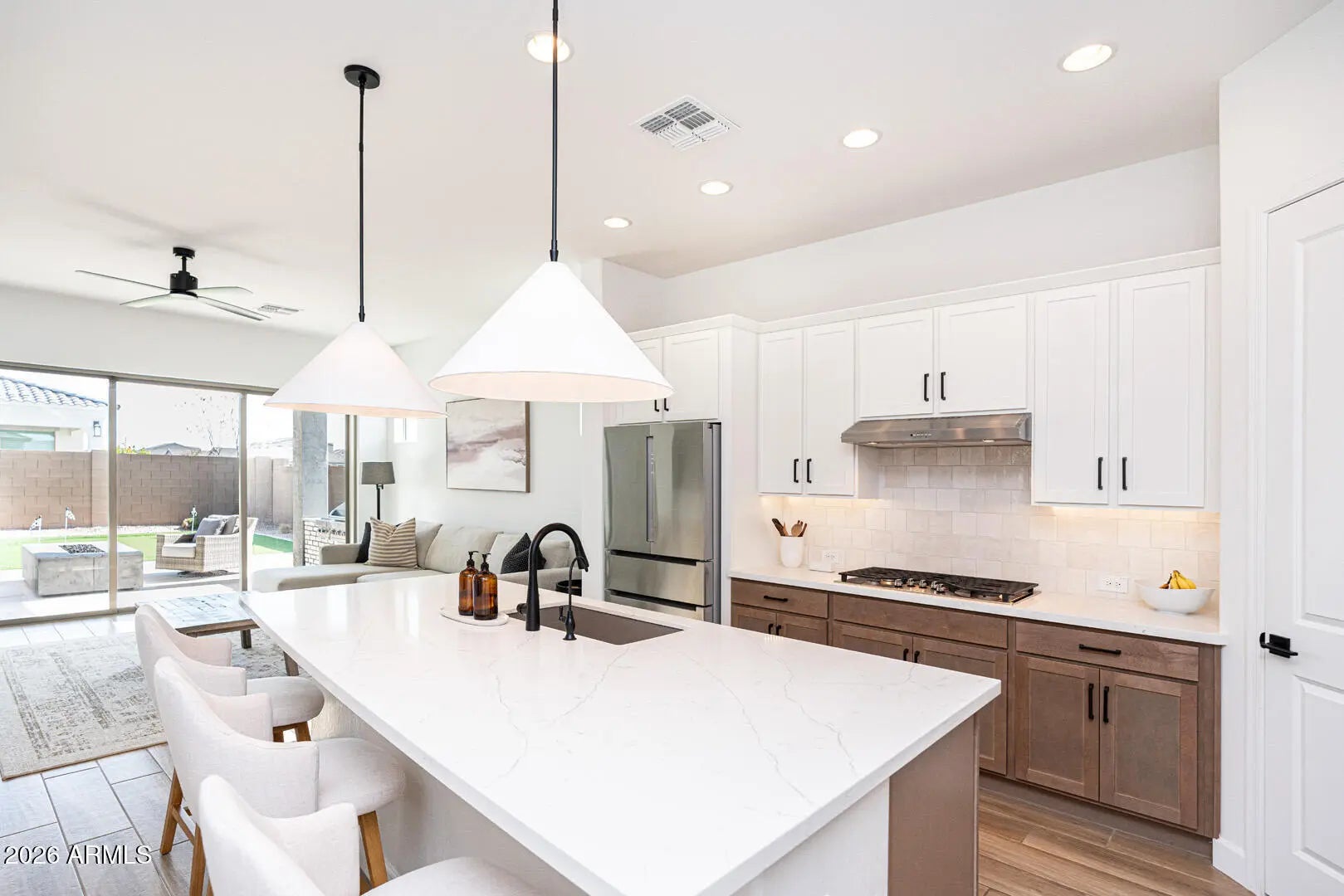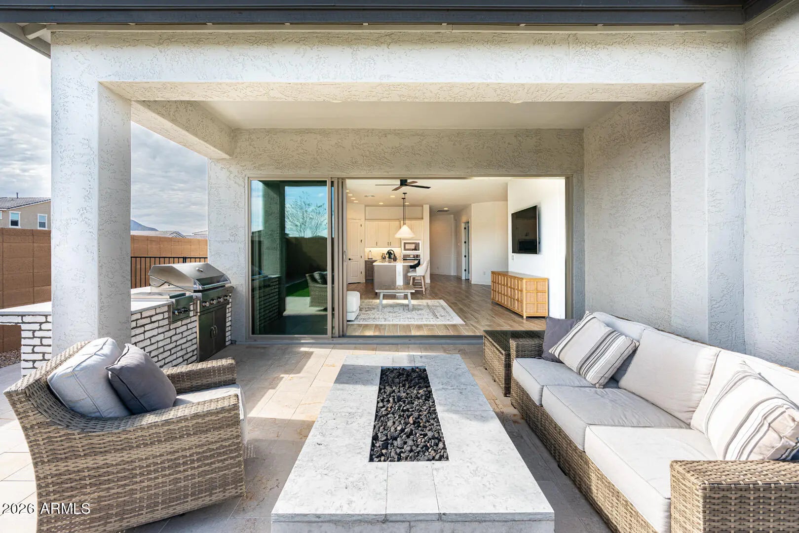 This home was thoughtfully designed to show like a model, featuring carefully selected upgrades that set it apart from standard new construction. Comparable to Model that recently sold for 715K. Situated on a superior corner lot, the layout is enhanced by a stunning cascading sliding glass door that seamlessly blends indoor and outdoor living. The backyard is already complete--no waiting, no guessing--with over $30,000 invested, including a gas fire pit, built-in BBQ, and putting green creating the perfect space for entertaining and Arizona evenings under the stars. Inside, the home offers three spacious bedrooms PLUS a true office with French doors, ideal for remote work, creative space, or a private retreat. The kitchen and living areas are elevated with under-cabinet lighting, custom shutters, and a refined, designer feel throughout. Functional upgrades include a water softener and reverse osmosis system, adding comfort and long-term value from day one. Harvest Meadows is known for its wide streets, community parks, playgrounds, and inviting green spaces, all conveniently located near top-rated schools, shopping, dining, and the charm of downtown Queen Creekwhile still offering a peaceful, neighborhood feel.