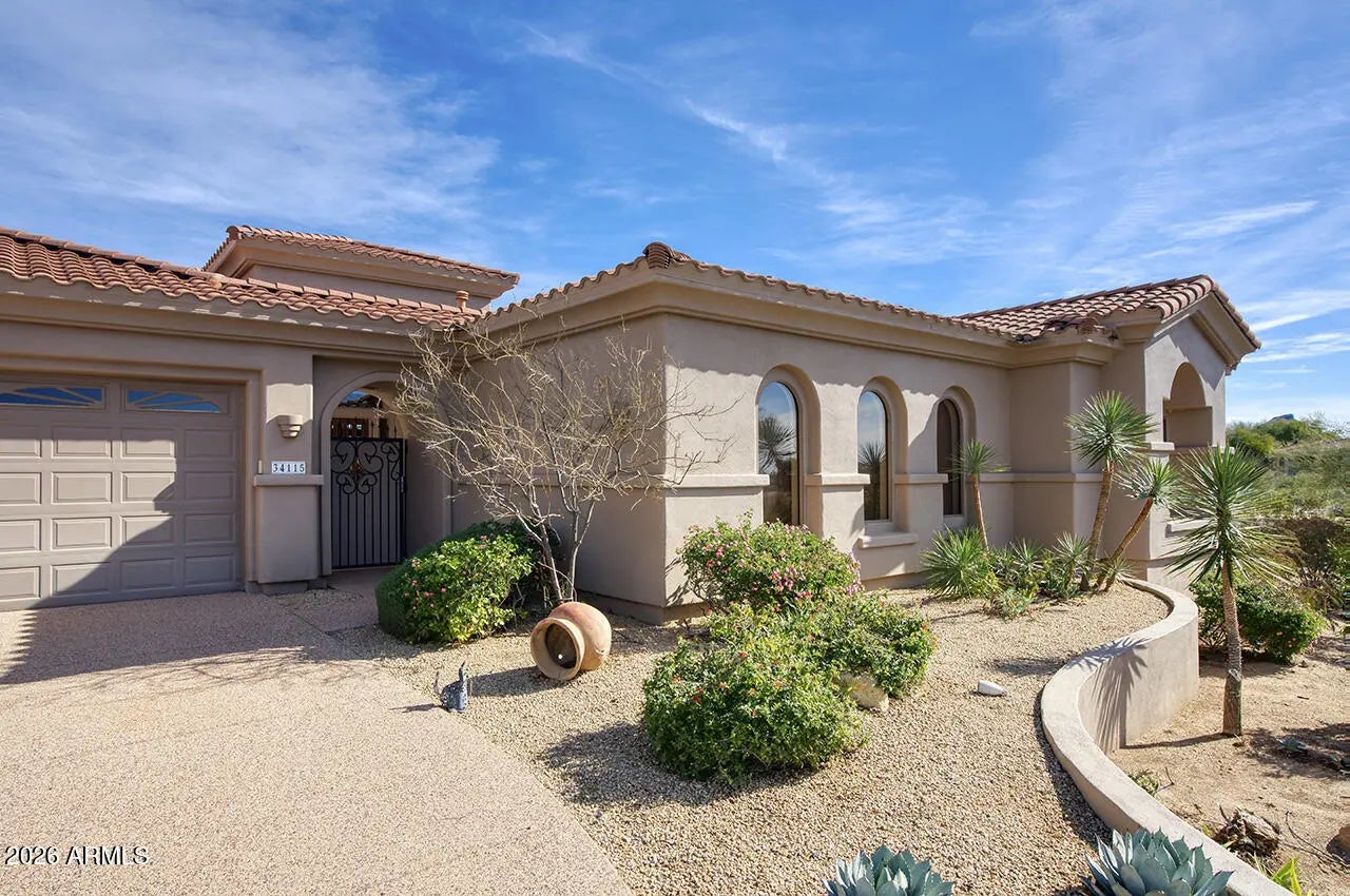 Hacienda-style living at its best! This stunning Legend Trail Avron Kachina Model backs to the 10th Green of Legend Trail Golf Course and showcases sweeping North Mountain views. Designed for both comfort and entertaining, the home features private outdoor living and an inviting open floorplan. A charming gated courtyard welcomes you with a tranquil water fountain, leading to a detached two-room casita and the main home entrance. Inside, the great room opens to expansive golf course and mountain views, seamlessly connecting the living, dining, and entertaining spaces. The resort-style outdoor living space is ideal for entertaining, offering a heated pool and spa, fire pit, putting green, and lush desert vegetation-your own private retreat. With over 3,400 square feet of thoughtful With over 3,400 square feet of thoughtfully designed space, this home features tile and wood flooring, custom plantation shutters throughout, and a versatile open office/flex room or third bedroom in the main home that flows into the open dining or game room. The expansive primary suite offers a true split-bedroom concept, complemented by two guest bedrooms with ensuite bathrooms for ultimate privacy and comfort.