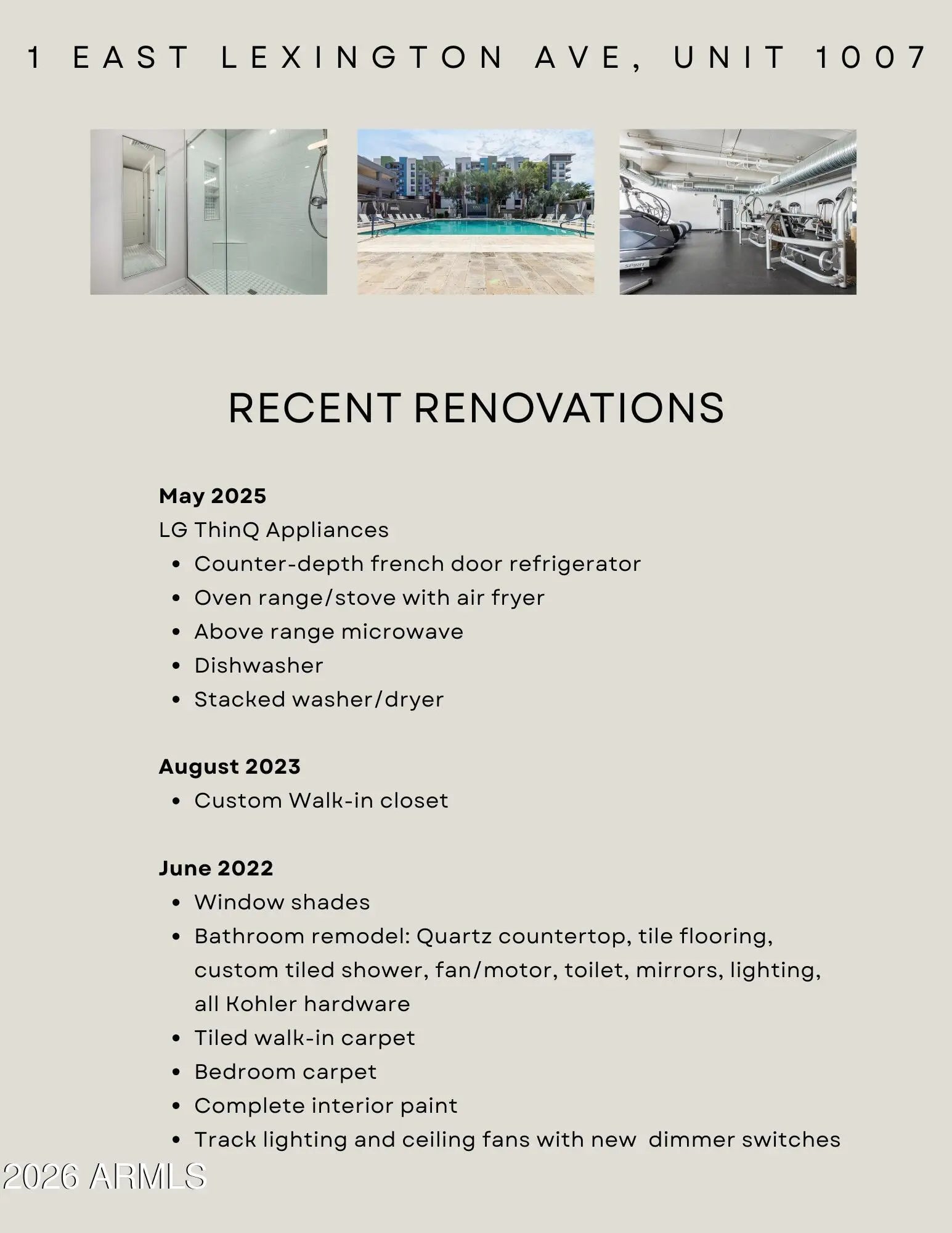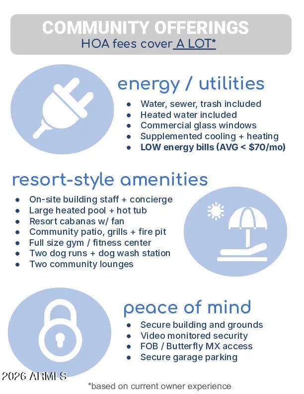 Mid-Town living at its finest! A tranquil oasis above the bustling city. Panoramic city and mountain views, 24/7 concierge amentiies, light-rail, dining, sporting events, museums, theatres and Sky Harbor near by. Floor to ceiling windows, remodeled bathroom with top of the line Kohler hardware. Custom walk-in closet. Newer stainless steel appliances thoroughout with the oven range/stove with air fryer. Track lighting, dimmer switches and ceiling fans. Resort-style amenities that boasts a heated pool and spa, cabanas, firepit. Fitness center, club room, community BBQ, garage parking with EV charging and storage. Our four legged friends are taken care of as well. Dog run/washing station. The HOA fee covers a vast array of services, providing for a true lock-and-leave lifestyle..