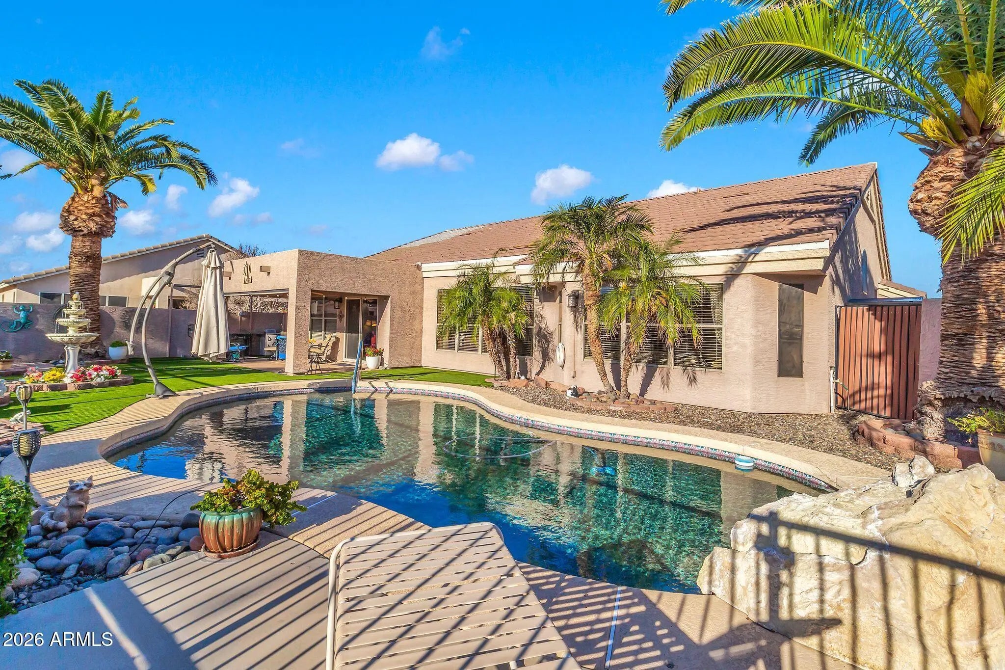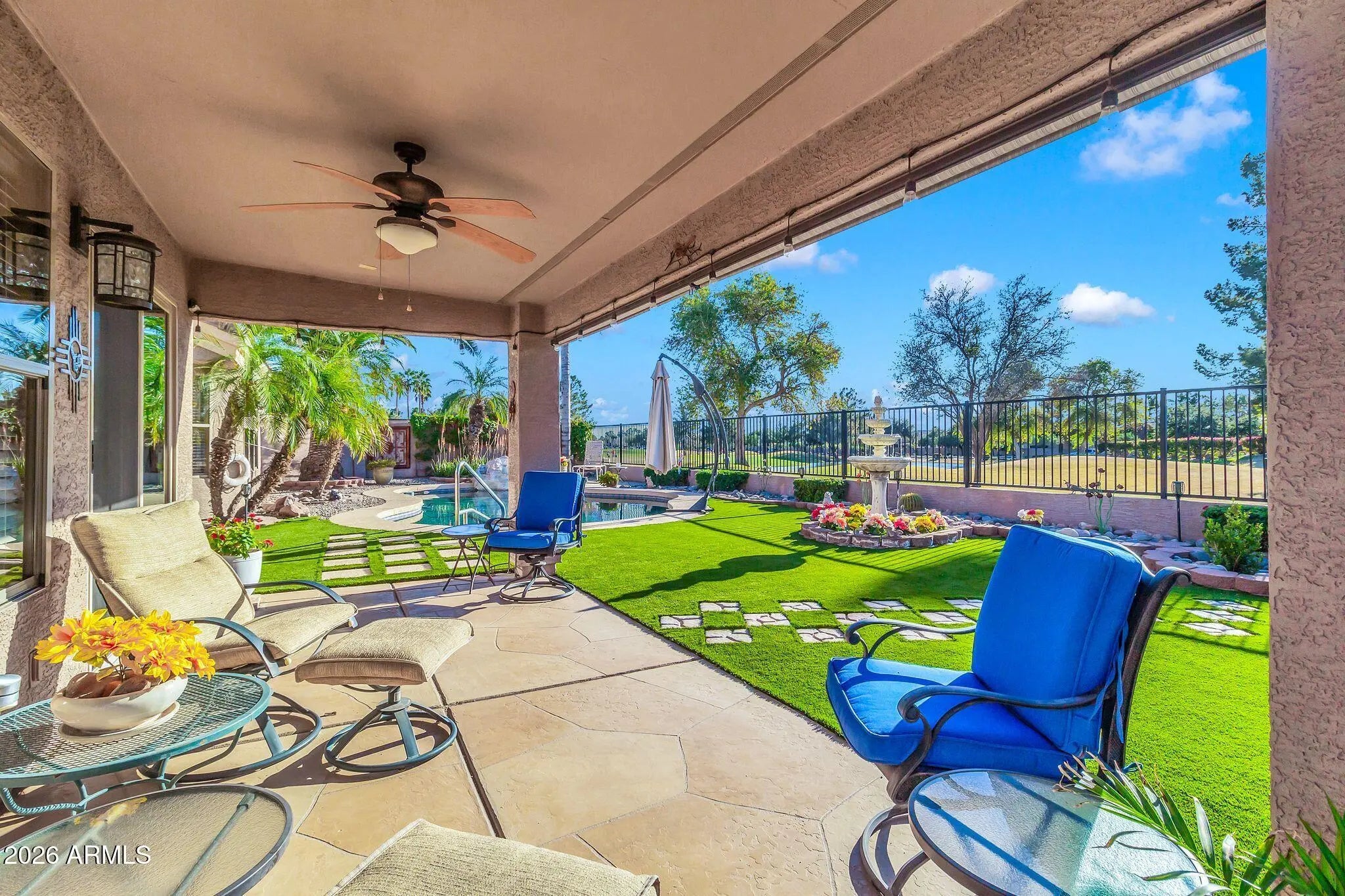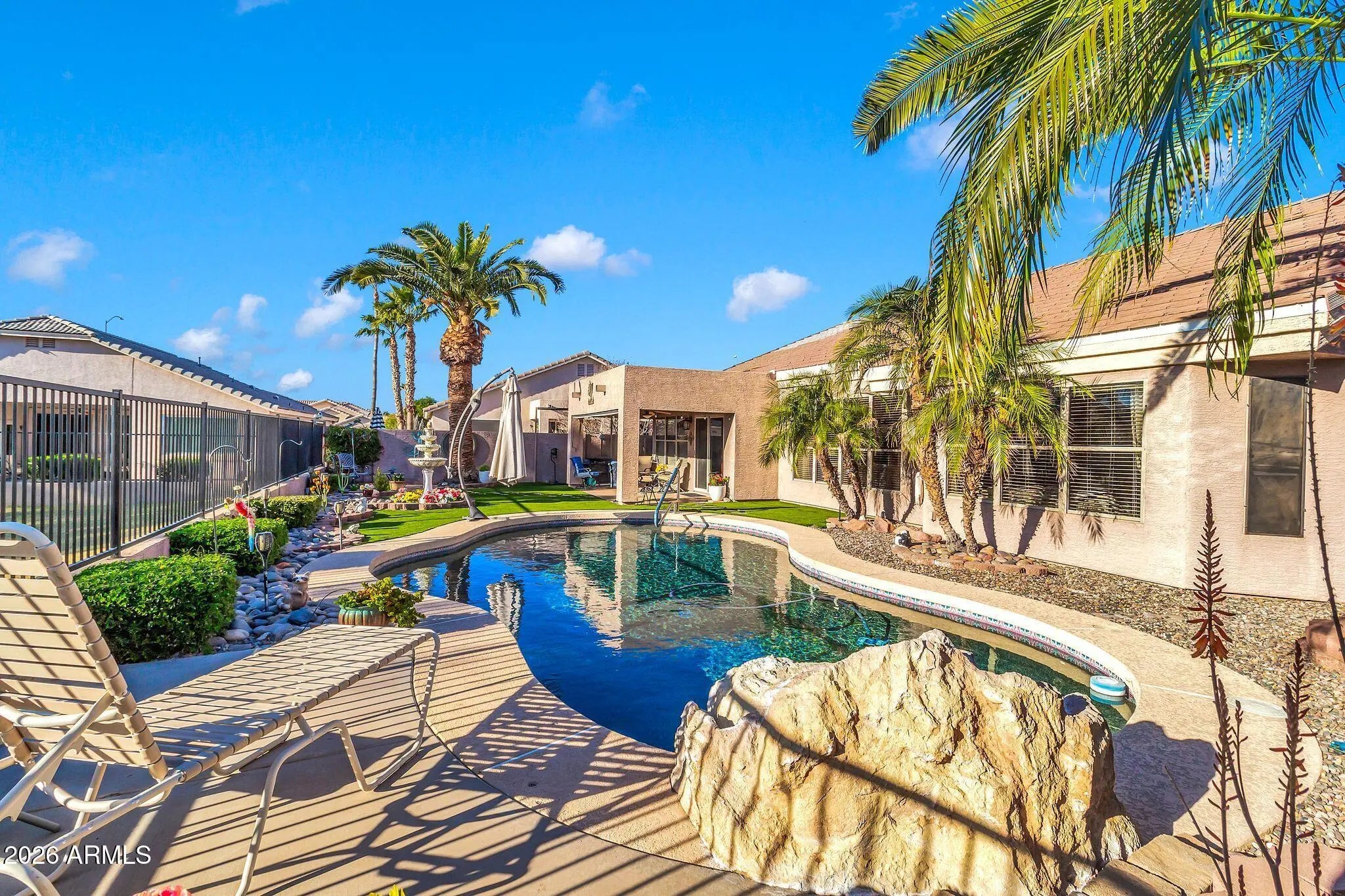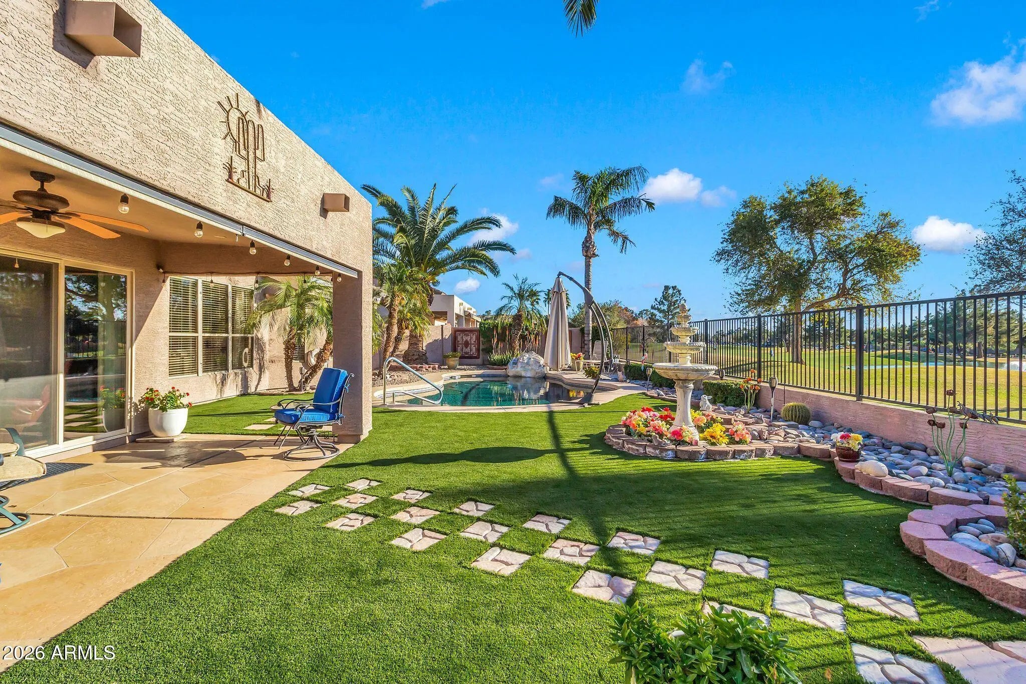 Amazing home on a GC Lot in the highly desirable Augusta Ranch. BRAND NEW ROOF 1/2026! Newer A/C & tankless HW. The back yard oasis is the gem of this gorgeous home. Sitting at hole 10, this inviting outdoor living space includes new turf, sparkling pool, fountain and palm trees. Beautiful single level 3BR/2Bath split living. Spacious Master bedroom with bay window, walk-in closet & upgraded block shower! Secondary bedrooms are generously sized and equipped with ceiling fans. Three car garage, rare RV gate with extra storage sheds and parking, another gem is the extra golf cart garage/man cave/shop with a/c and water - the possibilities are endless. Another unique feature is the whole house exhaust system for lowering your utility bills.