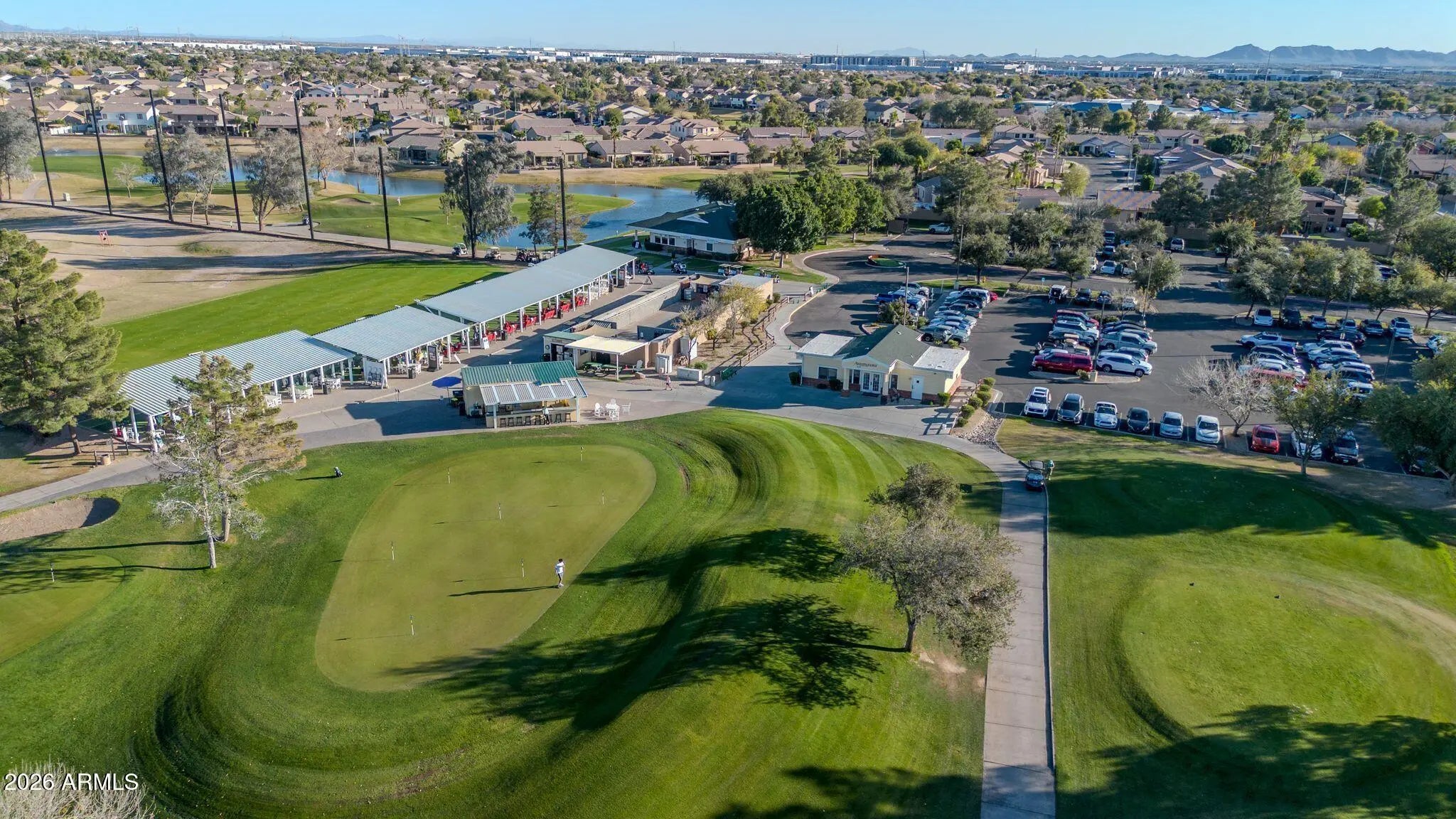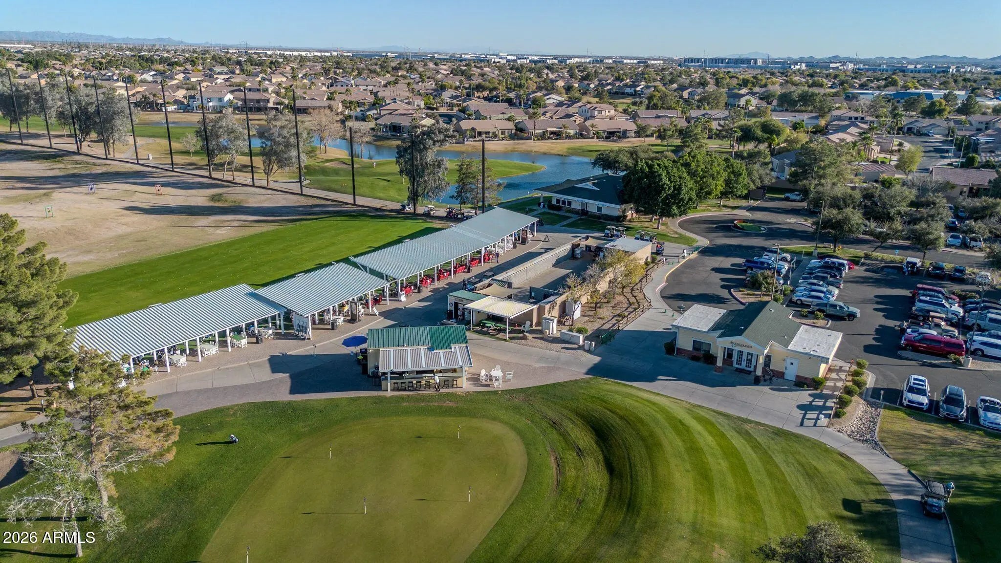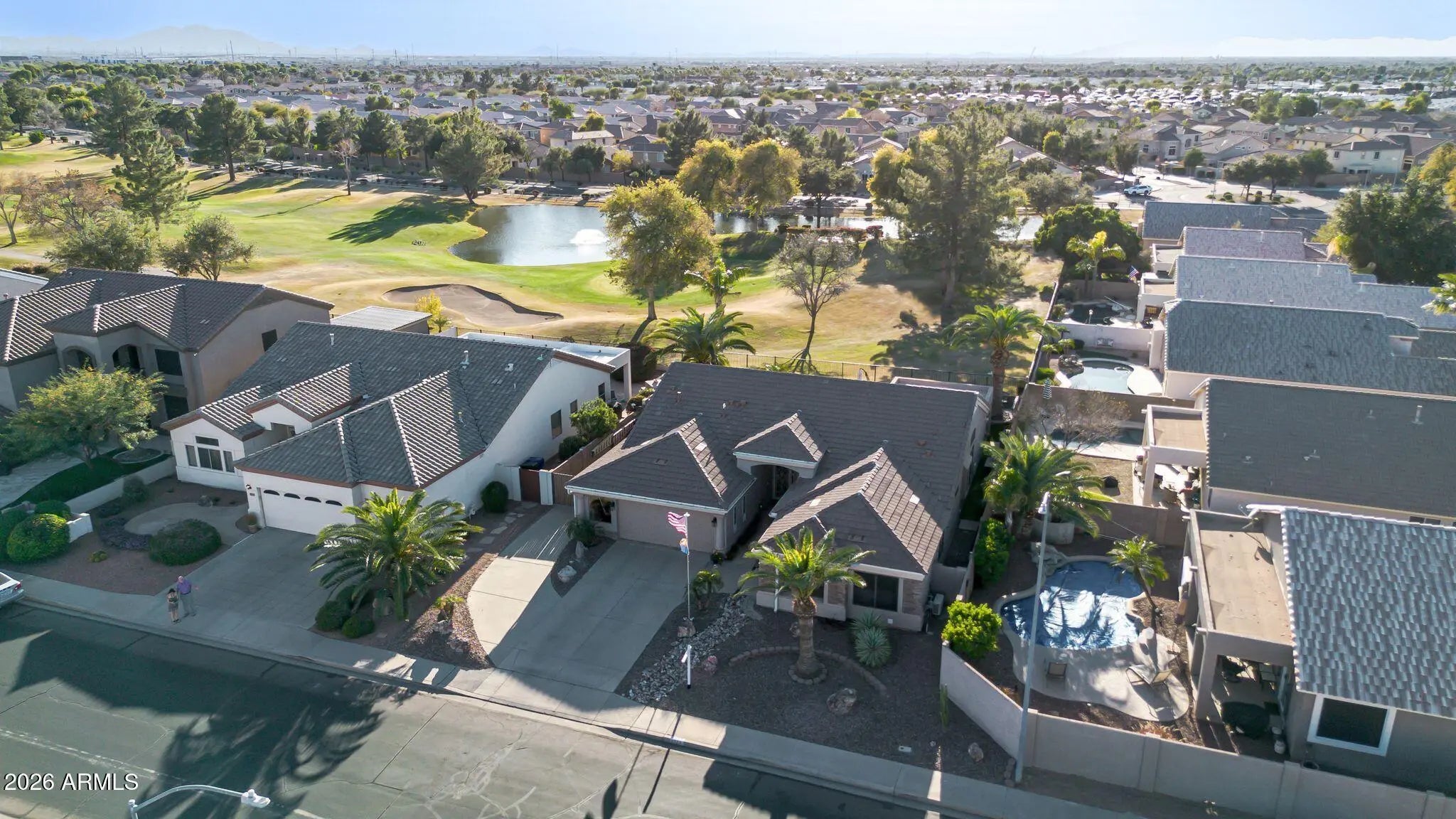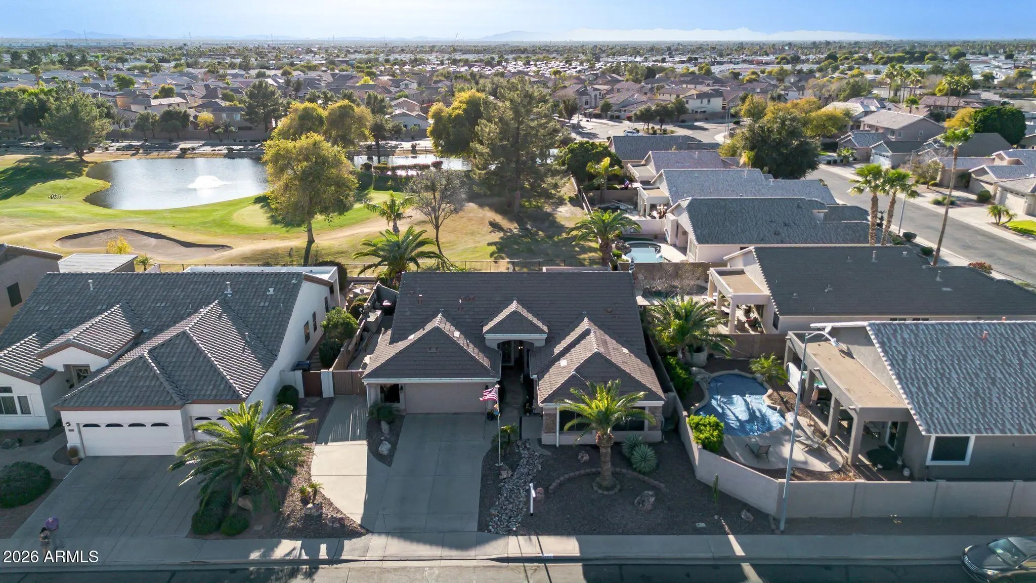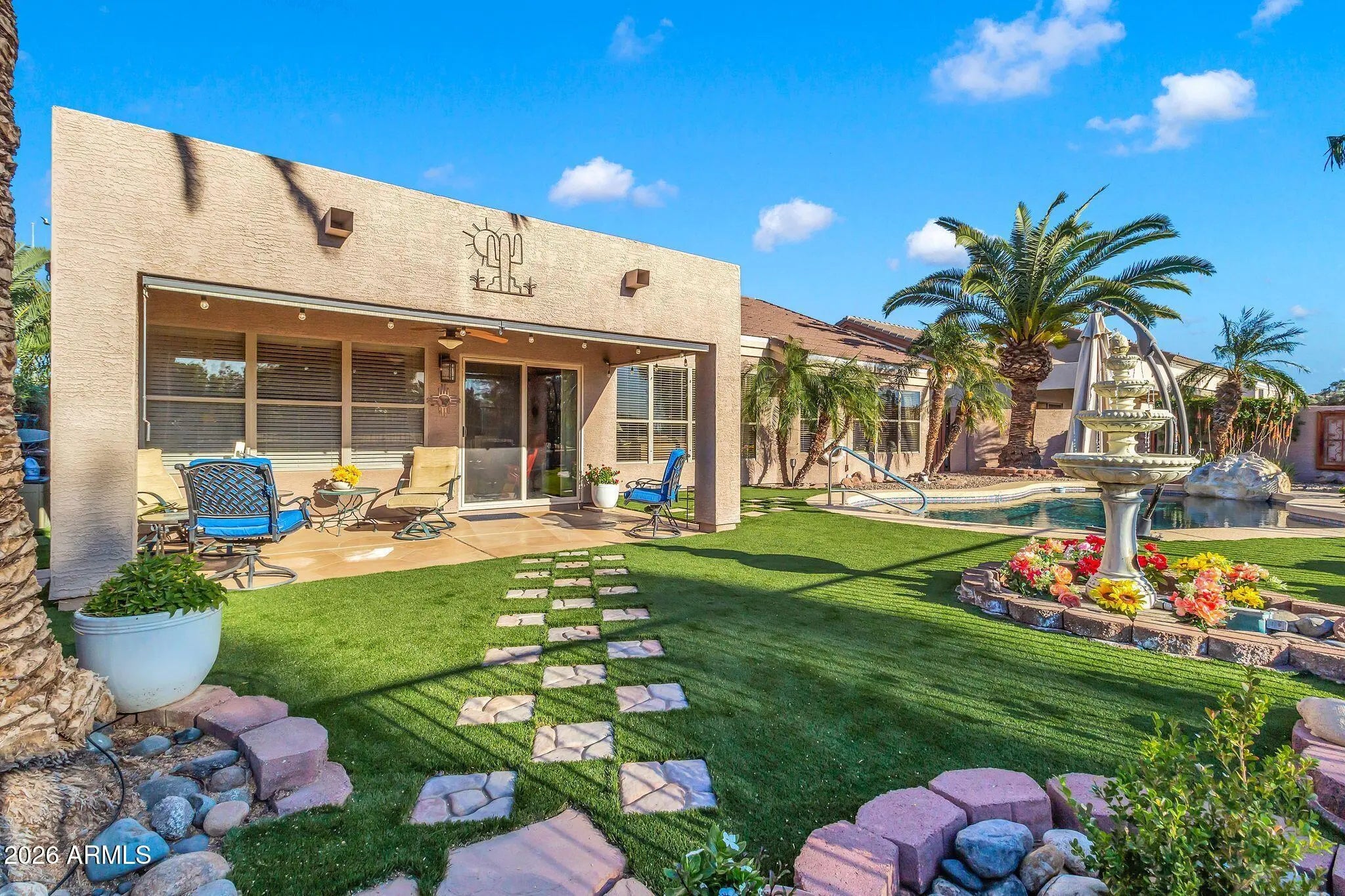 Amazing home on a GC Lot in the highly desirable Augusta Ranch. BRAND NEW ROOF 1/2026! Newer A/C & tankless HW. The back yard oasis is the gem of this gorgeous home. Sitting at hole 10, this inviting outdoor living space includes new turf, sparkling pool, fountain and palm trees. Beautiful single level 3BR/2Bath split living. Spacious Master bedroom with bay window, walk-in closet & upgraded block shower! Secondary bedrooms are generously sized and equipped with ceiling fans. Three car garage, rare RV gate with extra storage sheds and parking, another gem is the extra golf cart garage/man cave/shop with a/c and water - the possibilities are endless. Another unique feature is the whole house exhaust system for lowering your utility bills.