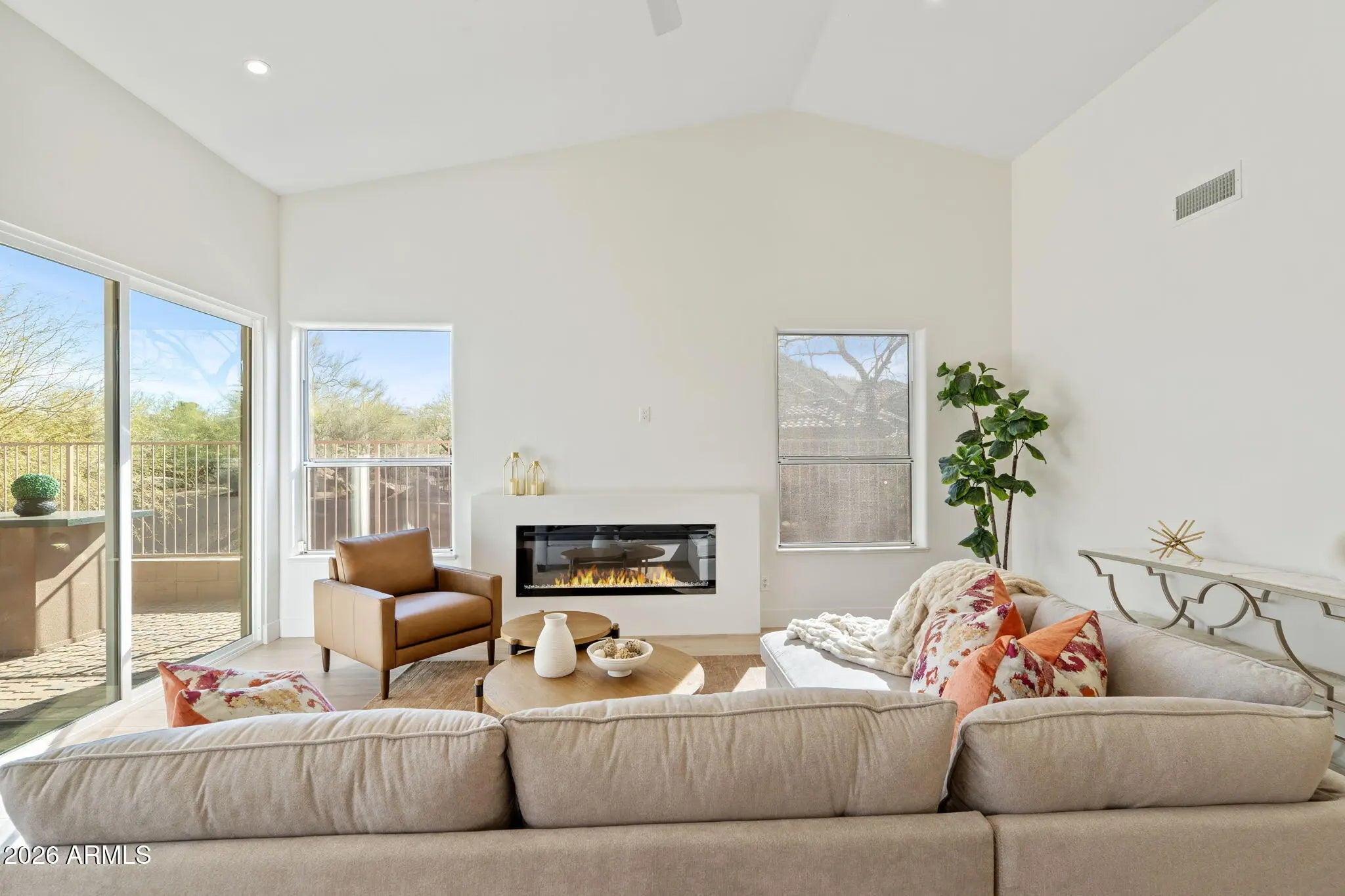 Welcome to one of the few true down-to-the-studs rebuilt homes in Troon North, offering the look, feel, and reliability of Scottsdale new construction—without the wait or multi-million-dollar price tag. This single-level, no-steps custom residence has been completely redesigned, expanded, and elevated by a lifelong local designer, creating a rare move-in-ready luxury home in North Scottsdale. Every major system has been thoughtfully replaced, including plumbing, electrical, lighting, cabinetry, fixtures, irrigation, and premium interior finishes. The result is a turnkey Scottsdale home that feels entirely new from the inside out—ideal for buyers seeking quality craftsmanship, modern design, and long-term peace of mind. Soaring ceilings and expansive walls of glass flood the home with natural light, highlighting wide-plank flooring, custom 8-foot interior doors, and a flowing open-concept floor plan designed for modern Scottsdale living. Three contemporary fireplaces anchor the family room, primary suite, and a newly created conversation lounge, while oversized sliding glass doors create seamless indoor-outdoor living, perfect for entertaining and everyday enjoyment. The chef's kitchen serves as the heart of the home, featuring a large quartz island, top-of-the-line appliances, and abundant custom cabinetryideal for both casual living and hosting guests. The expanded primary suite retreat offers a spa-inspired bath with a freestanding soaking tub, refined finishes, and a beautifully designed walk-in closet, delivering the comfort and elegance buyers expect in luxury real estate in Scottsdale. Situated on a quiet cul-de-sac and backing to a natural wash, the property enjoys exceptional privacy and a peaceful, elevated settingan increasingly rare find at this price point in Troon North. The expansive backyard offers a blank canvas for a buyer to design their own custom outdoor living space, whether envisioning a resort-style pool, spa, or tranquil gardenwithout paying for someone else's outdated design choices. Located just minutes from Troon Country Club, Troon North Golf Club, the Four Seasons Scottsdale, Mastro's, Keeler's, world-class hiking and biking trails, Carefree's charming downtown, and premier shopping and dining at Kierland Commons and Scottsdale Quarter, this home delivers the perfect balance of luxury, privacy, and lifestyle convenience. This is not just another remodel, it is a thoughtfully rebuilt custom home in North Scottsdale, offering modern architecture, quality craftsmanship, and one of the best turnkey values in Troon North real estate. Sellers are motivated for the next person to make this house thier home.