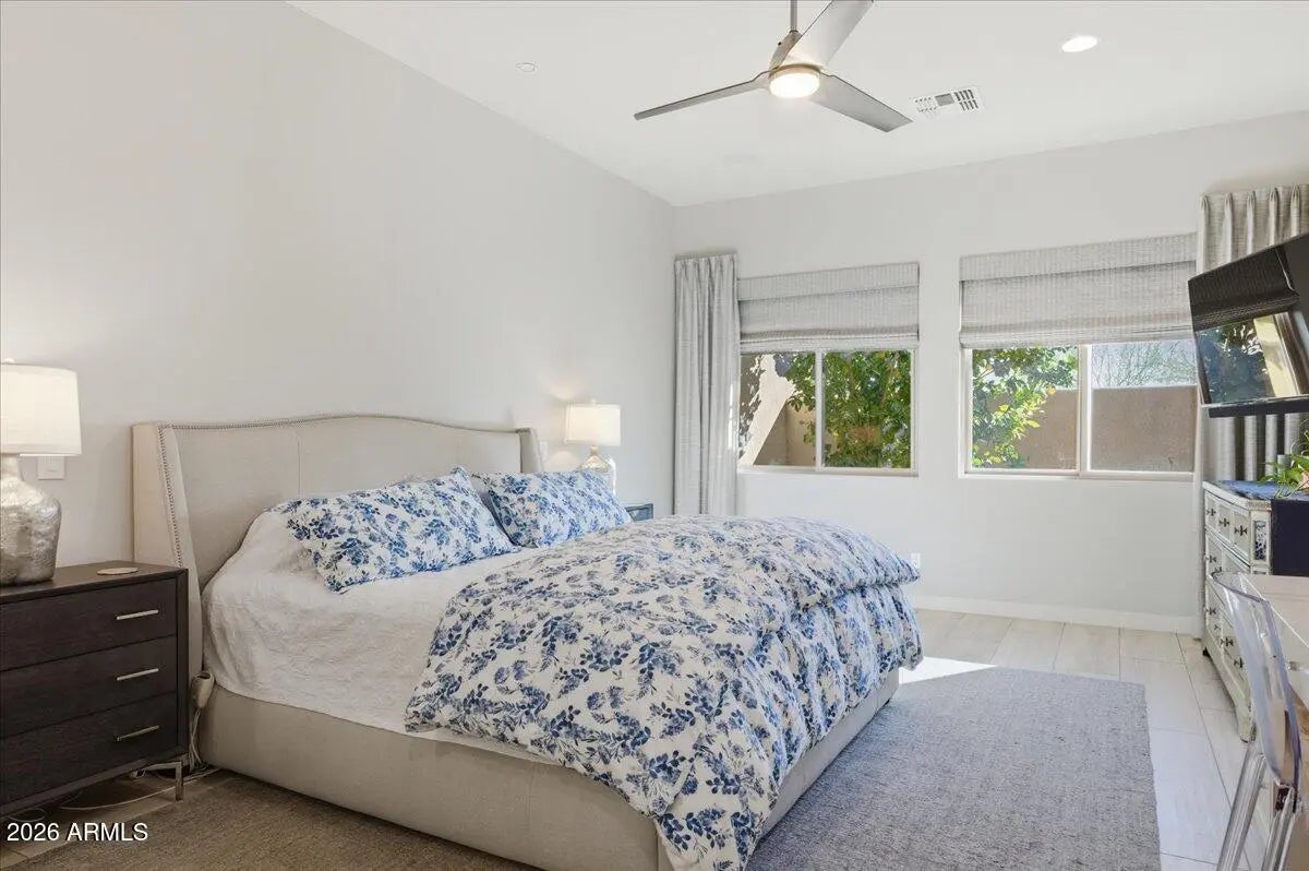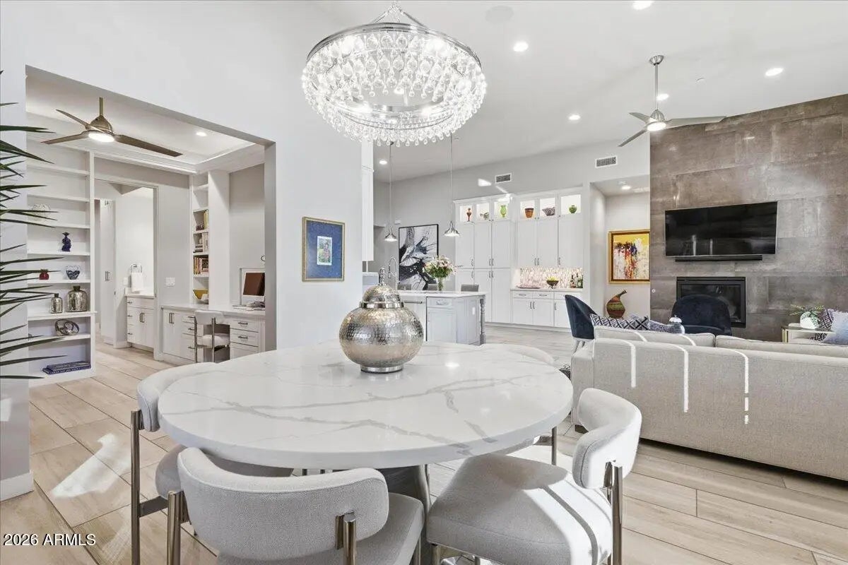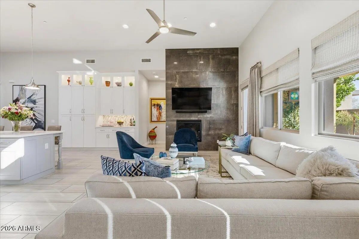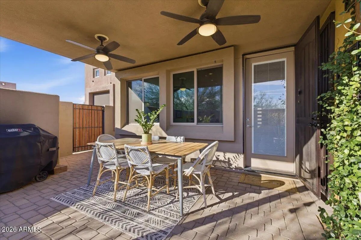 A RARE JEWELBOX! Gorgeous former Model Home, full of custom upgrades, located at the foot of the McDowell Mountains in 27-unit gated Graythorn. Bright open single-level floorplan centered around an expansive Great Room features 3 bedrooms + office/bonus room, 3.5 bathrooms & huge custom Butler's Pantry. Chef's Dream Kitchen provides a plethora of cabinets with glass display uppers, soft-close drawers, pull-out shelves, oversized quartz-covered island, gas cooking & stainless appliances. Enjoy the Living Room's fireplace & wall of windows while cooking or entertaining. The Primary Bedroom Suite boasts quartz counters atop a floating dual-sink vanity. Linen closet abuts subway-tiled shower. Custom closet to die for! Lovely outdoor patio. Two-car garage & charger. Nothing to do but move in! FEATURES LIST, VIDEO, VIRTUAL TOUR & FLOORPLAN ARE ATTACHED. Seller may include or sell many of the furnishings. All units' exteriors will be repainted neutral beginning in March 2026. The McDowell Mountain Ranch Aquatics & Fitness Center is within walking/biking distance, providing a pool and fitness center for year round use. The Arabian Library is right next door to the Center. Great location!