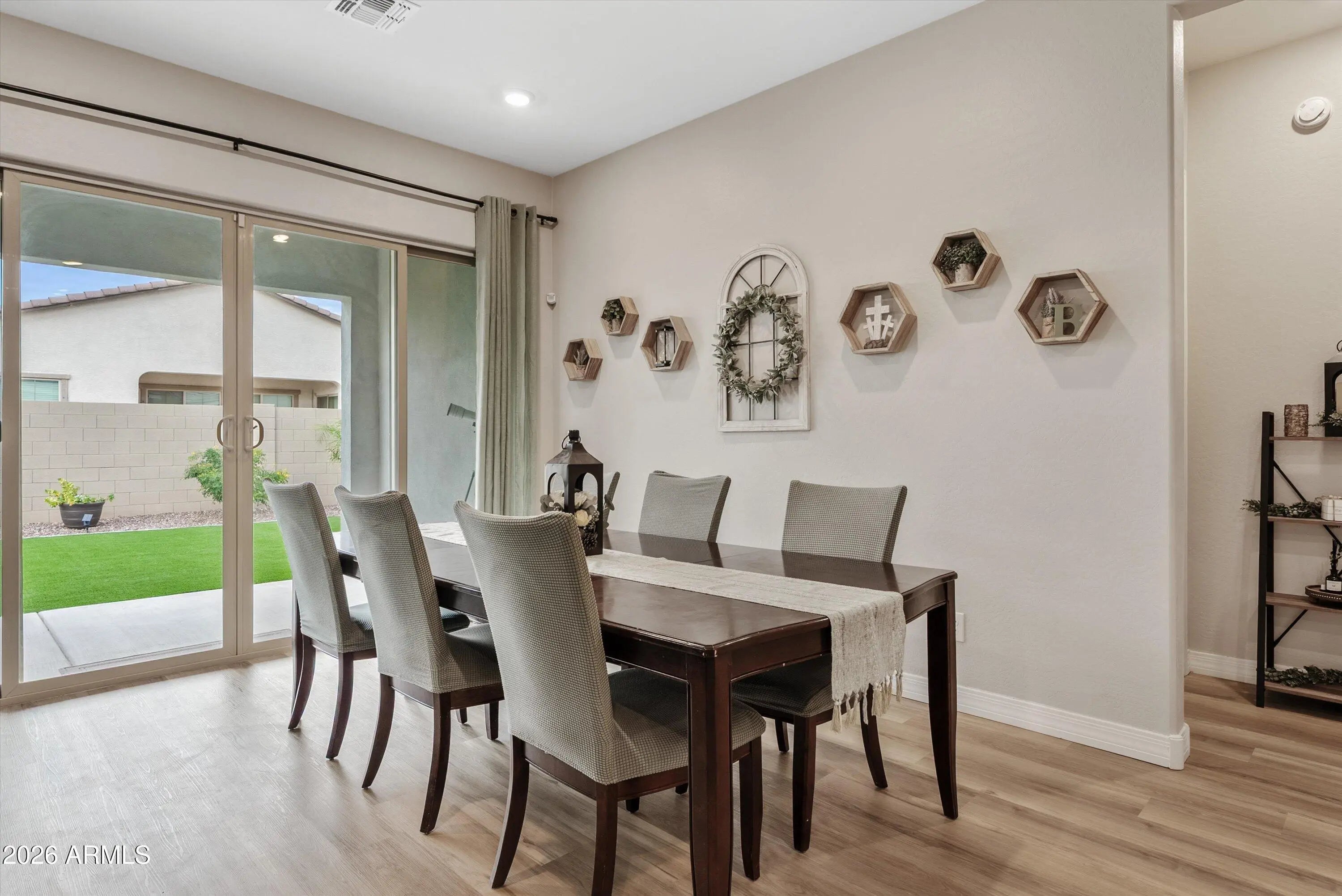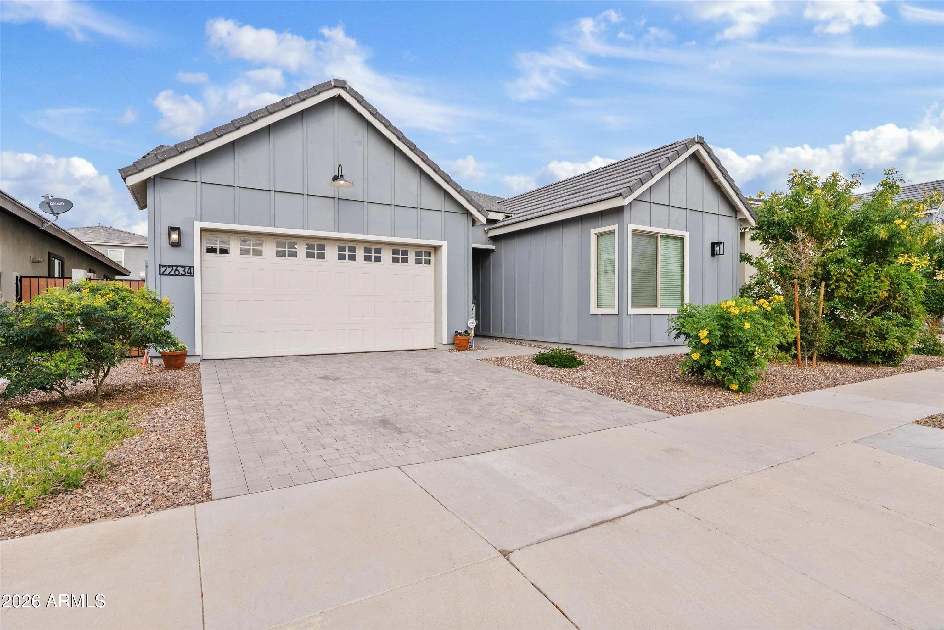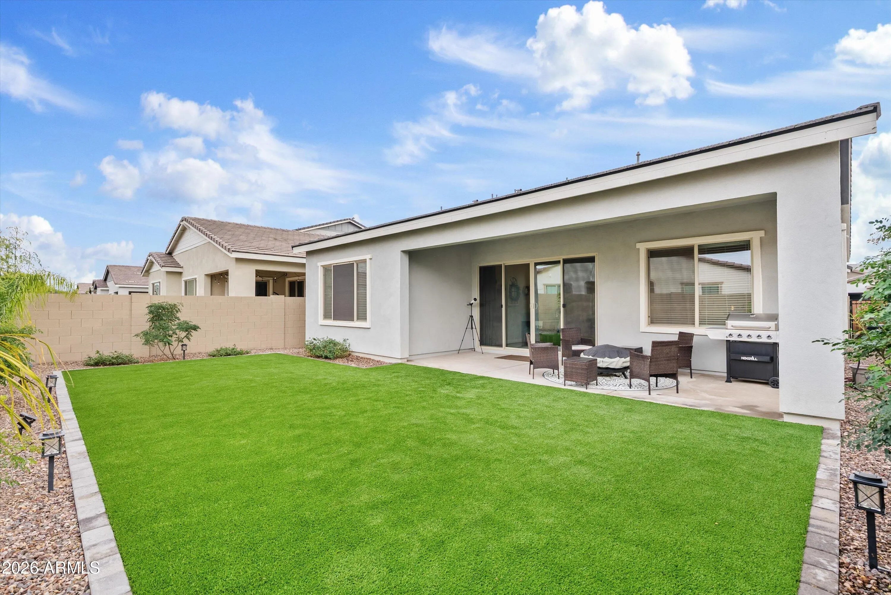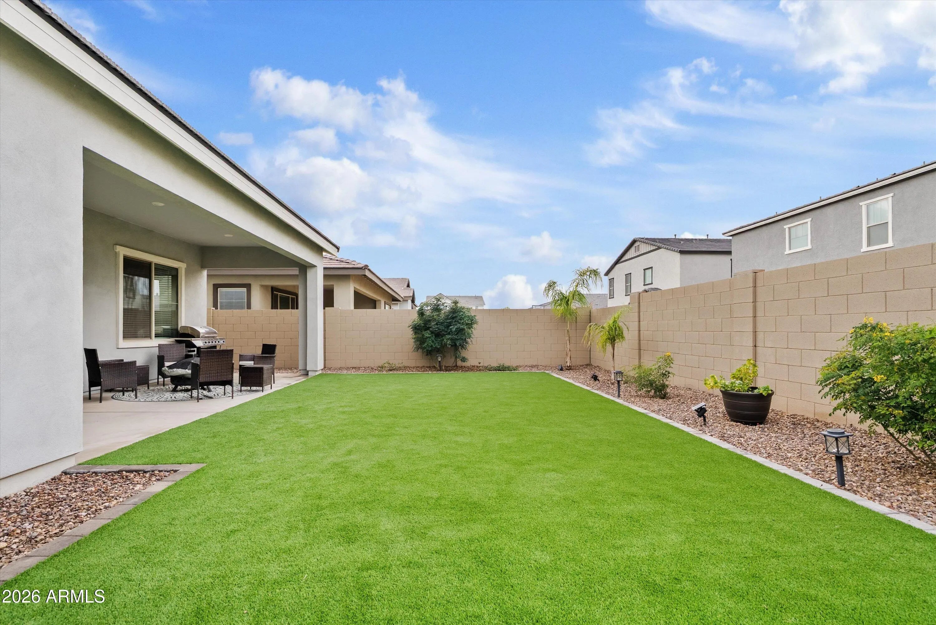If you love the idea of a new build but don't love the wait, or the bare dirt backyard, this beautifully upgraded home offers the best of both worlds. Built in 2023, this modern farmhouse-style home in the Madera community delivers that practically brand-new feel without the construction timeline. Offering 4 bedrooms plus an open den, 3 bathrooms, and 2,373 square feet, this single-level layout is thoughtfully designed for both everyday living and entertaining. The curb appeal immediately stands out with a paver driveway and charming farmhouse elevation. Inside, the home is open, bright, and welcoming, featuring quartz countertops, a gas range, stainless steel appliances, a walk-in pantry, and upgraded center-pull sliding glass doors that create seamless indoor-outdoor living. The primary suite is spacious and private, while the open den provides flexibility for a home office, playroom, or additional living space. Additional upgrades include inside laundry, built-in garage shelving, a tankless water heater, RO system, and water softener - details that add both comfort and efficiency. One of the standout features is the fully finished backyard - no waiting, no extra expense. With low-maintenance turf and a watering system on a timer, the outdoor space is ready to enjoy from day one, perfect for relaxing, entertaining, or letting kids and pets play. Beyond the home itself, the location truly shines. Madera is a newer master-planned community known for its welcoming, small-town feel, neighborhood parks, greenbelts, and walking paths. Located conveniently across Signal Butte Rd from everyday essentials like grocery shopping and restaurants makes errands and dining out effortless. It's also within walking distance to Frontier Family Park and the Queen Creek Recreation & Aquatic Center, offering year-round activities and amenities. Added peace of mind comes from having Queen Creek Fire Station 4 just down the street. You're also minutes from shopping, dining, and entertainment at Queen Creek Marketplace, local favorites like Schnepf Farms, and outdoor adventures at San Tan Mountain Regional Park, with miles of hiking and biking trails and stunning desert views. This home checks all the boxes: modern finishes, thoughtful upgrades, a completed backyard, and an ideal location in one of Queen Creek's most desirable communities. A rare opportunity to enjoy new-build living - without the wait.