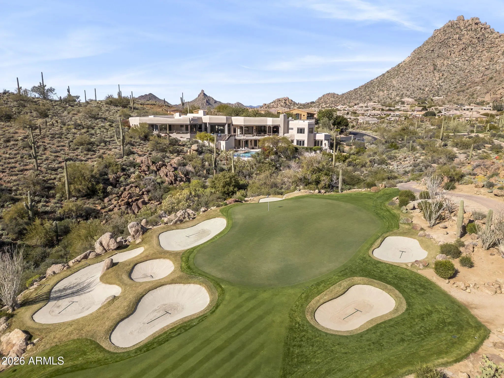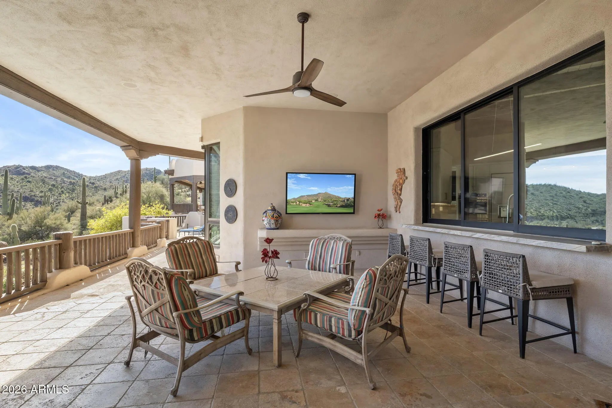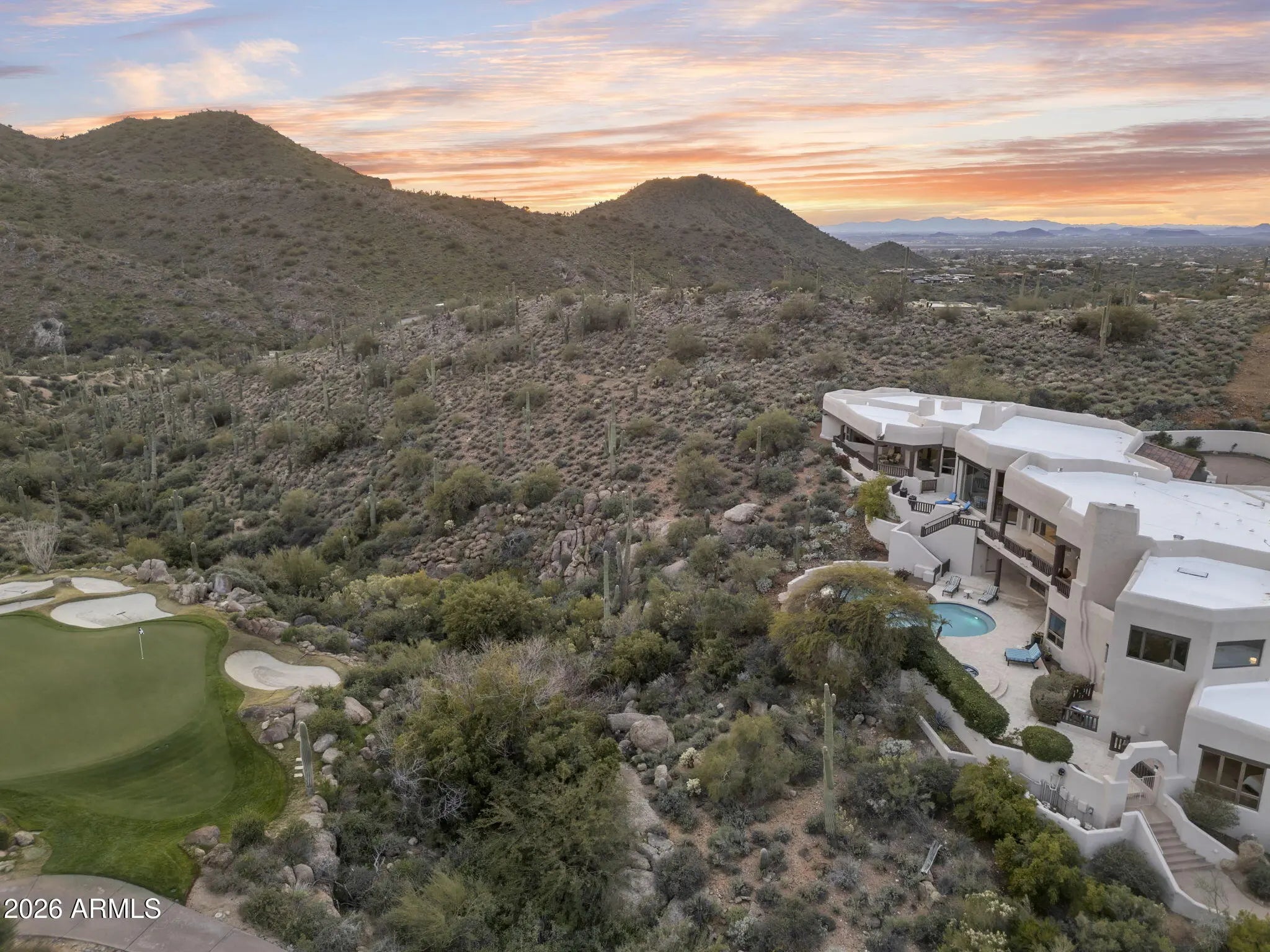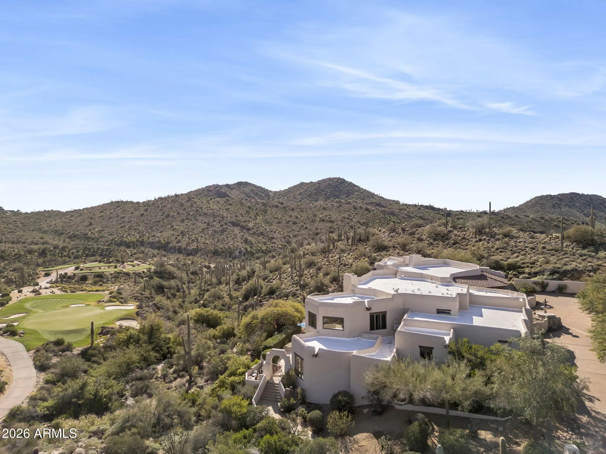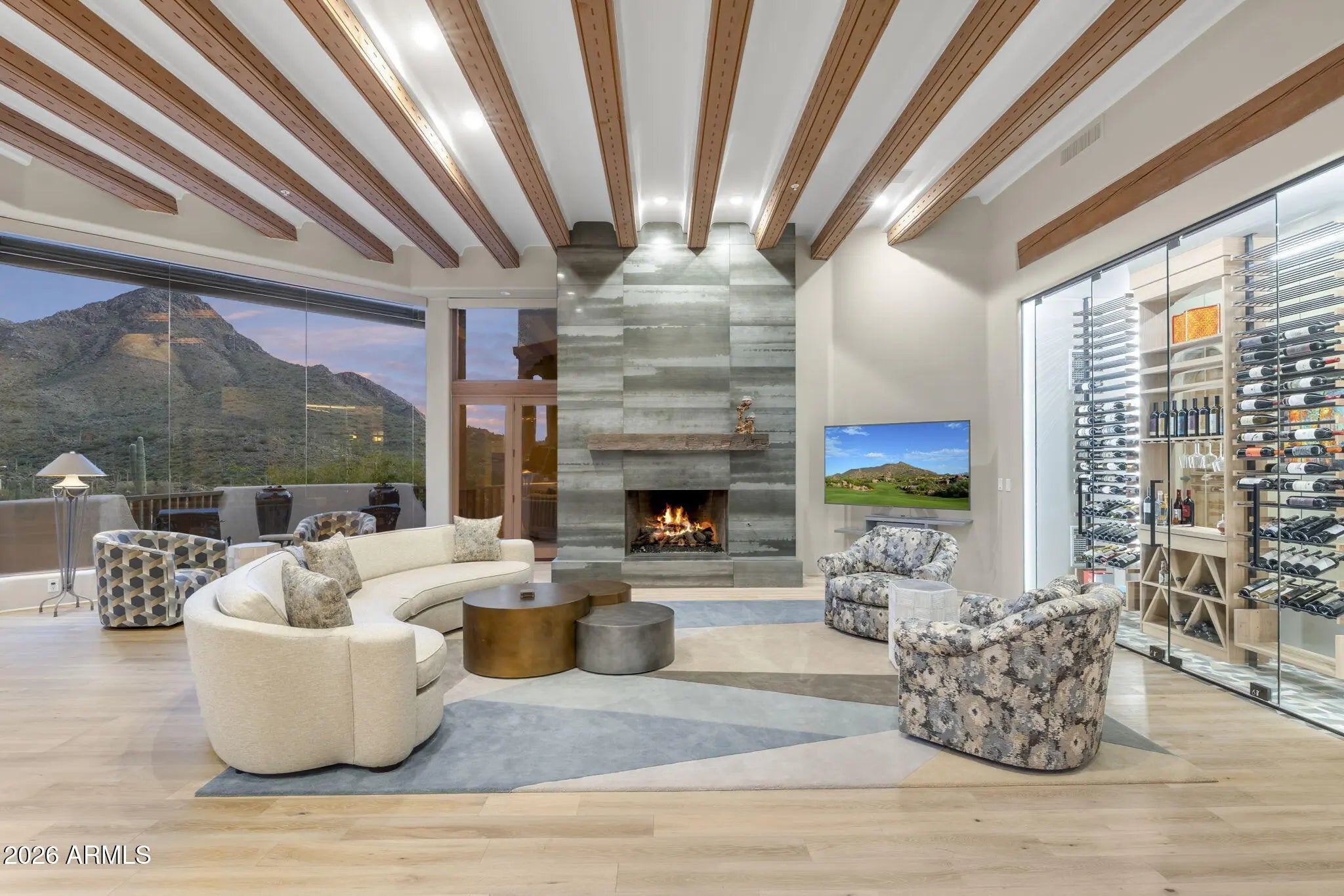 Commanding an extraordinary setting in the guard gated community of Glenn Moor in Troon Village, this estate is a rare convergence of architectural artistry, panoramic desert beauty, and refined luxury living. Perfectly positioned against the McDowell Mountain preserve and overlooking the Par 3 signature hole of Troon Country Club, the residence captures sweeping mountain silhouettes and golf course vistas that unfold from sunrise to sunset, creating a truly elevated living experience. Thoughtfully enhanced with significant updates, the home honors its Southwest-territorial roots while introducing a modern, sophisticated aesthetic. Recent improvements include a beautifully updated kitchen, a reimagined great room designed for grand yet comfortable entertaining, refreshed flooring throughout, exterior paint and wood sealing, and a fully remodeled lower-level with 2 bedrooms, a kitchenette and secondary family room for guests or multi-generational living. Architectural details define the home's character. Exposed wood beams, custom stone and plaster fireplaces, expansive walls of glass, and curated finishes create a warm, elevated atmosphere that blends seamlessly with the surrounding desert landscape. Generous living and entertaining spaces flow effortlessly, complemented by a striking wine display and thoughtfully designed gathering areas that invite both intimate evenings and large-scale entertaining. Designed to celebrate Arizona's coveted indoor-outdoor lifestyle, multiple covered patios, balconies, and view decks extend the living spaces into the natural surroundings. A resort-style pool terrace is perfectly positioned to enjoy serene privacy, dramatic mountain backdrops, and unforgettable sunsets, offering an ideal setting for entertaining or quiet relaxation. Every outdoor space has been oriented to maximize views, privacy, and connection to the landscape. Set within one of North Scottsdale's most sought after luxury enclaves, the property offers a rare sense of seclusion while remaining moments from golf, world-class hiking and biking trails, upscale dining, and shopping. This location balances luxury, recreation, and tranquility in equal measure.