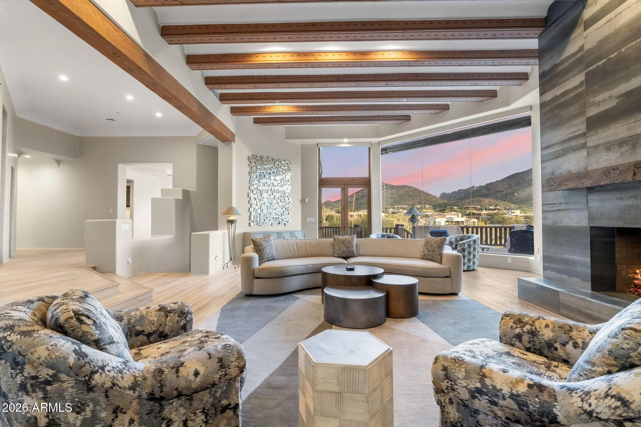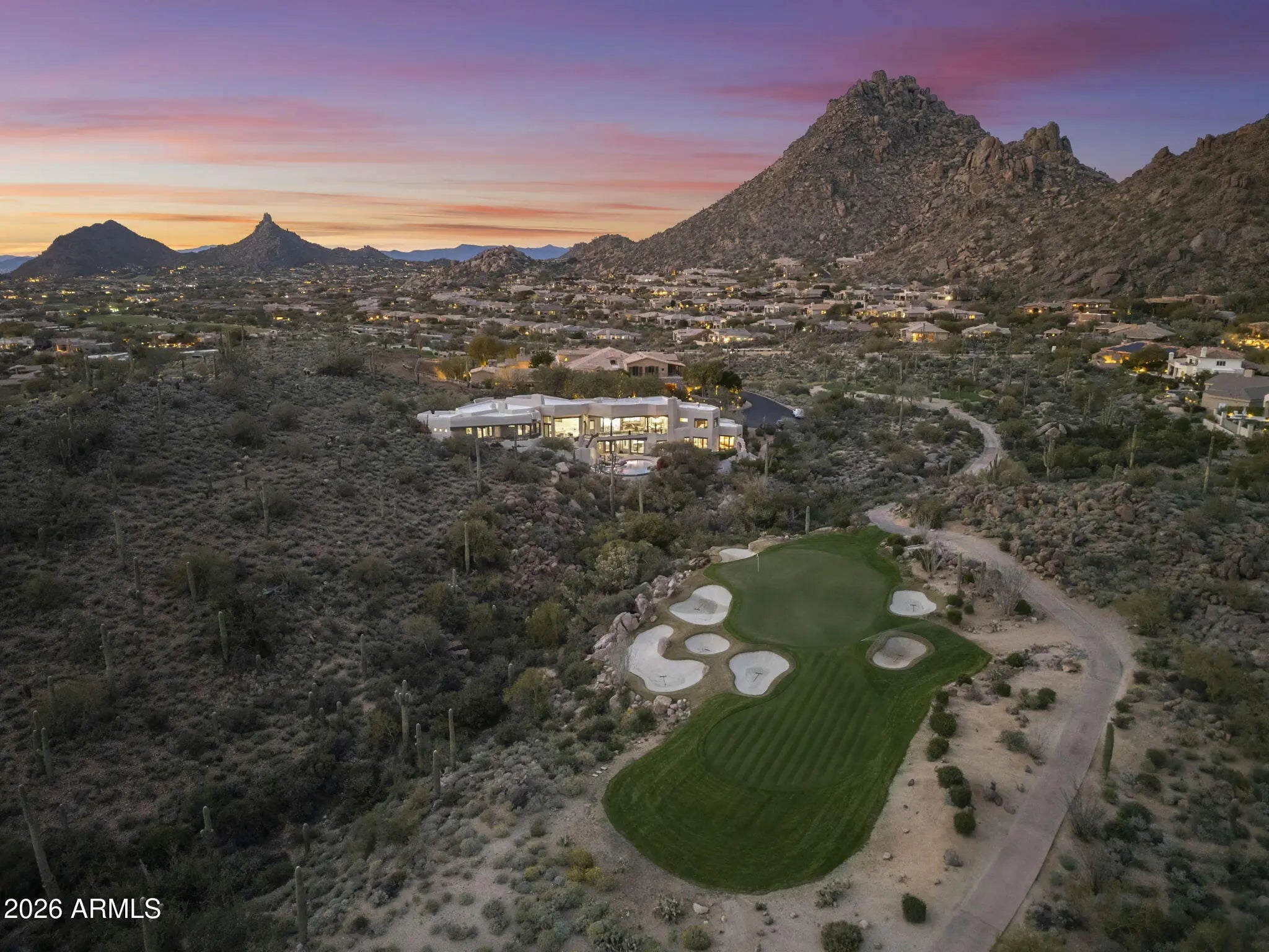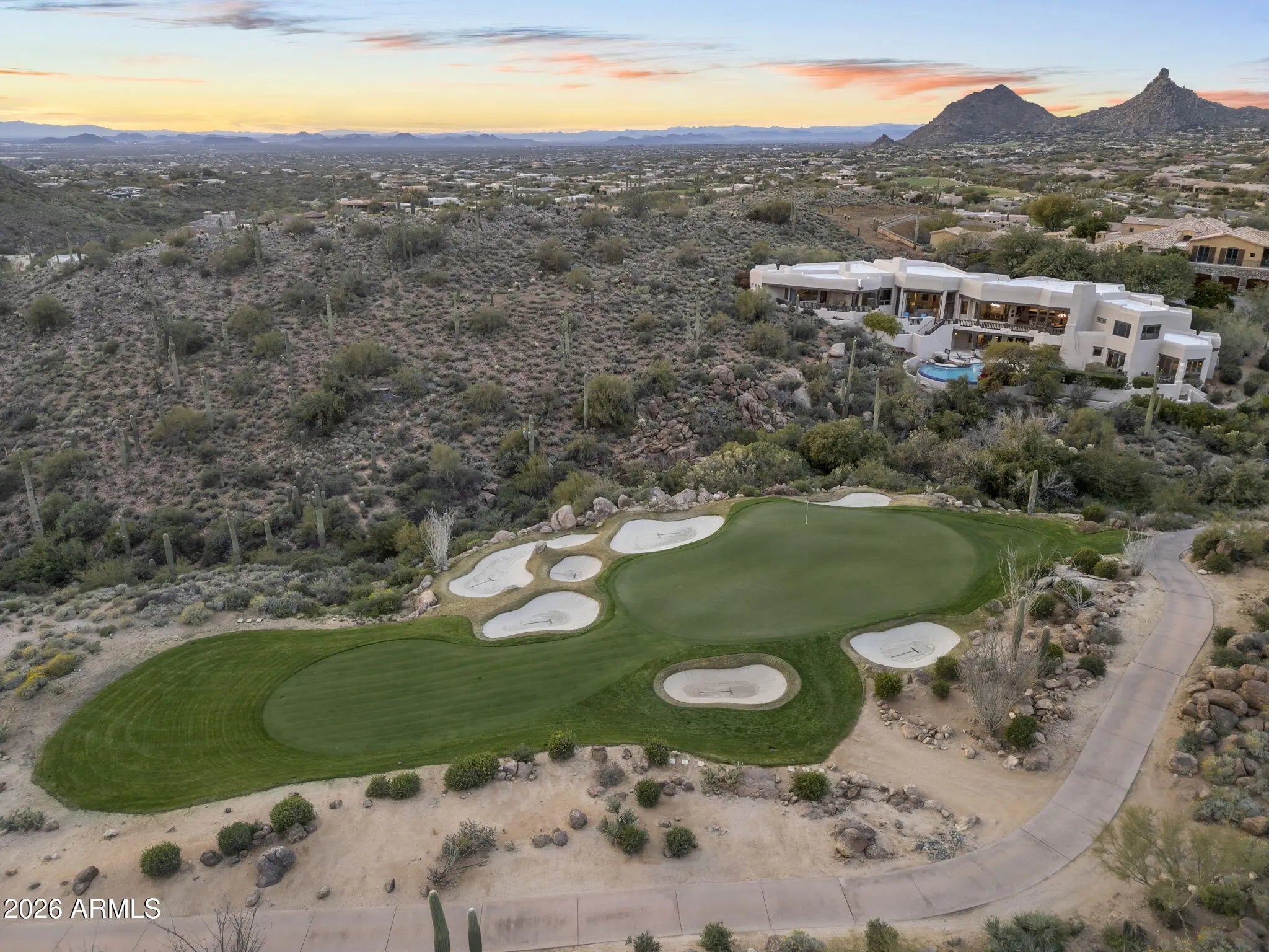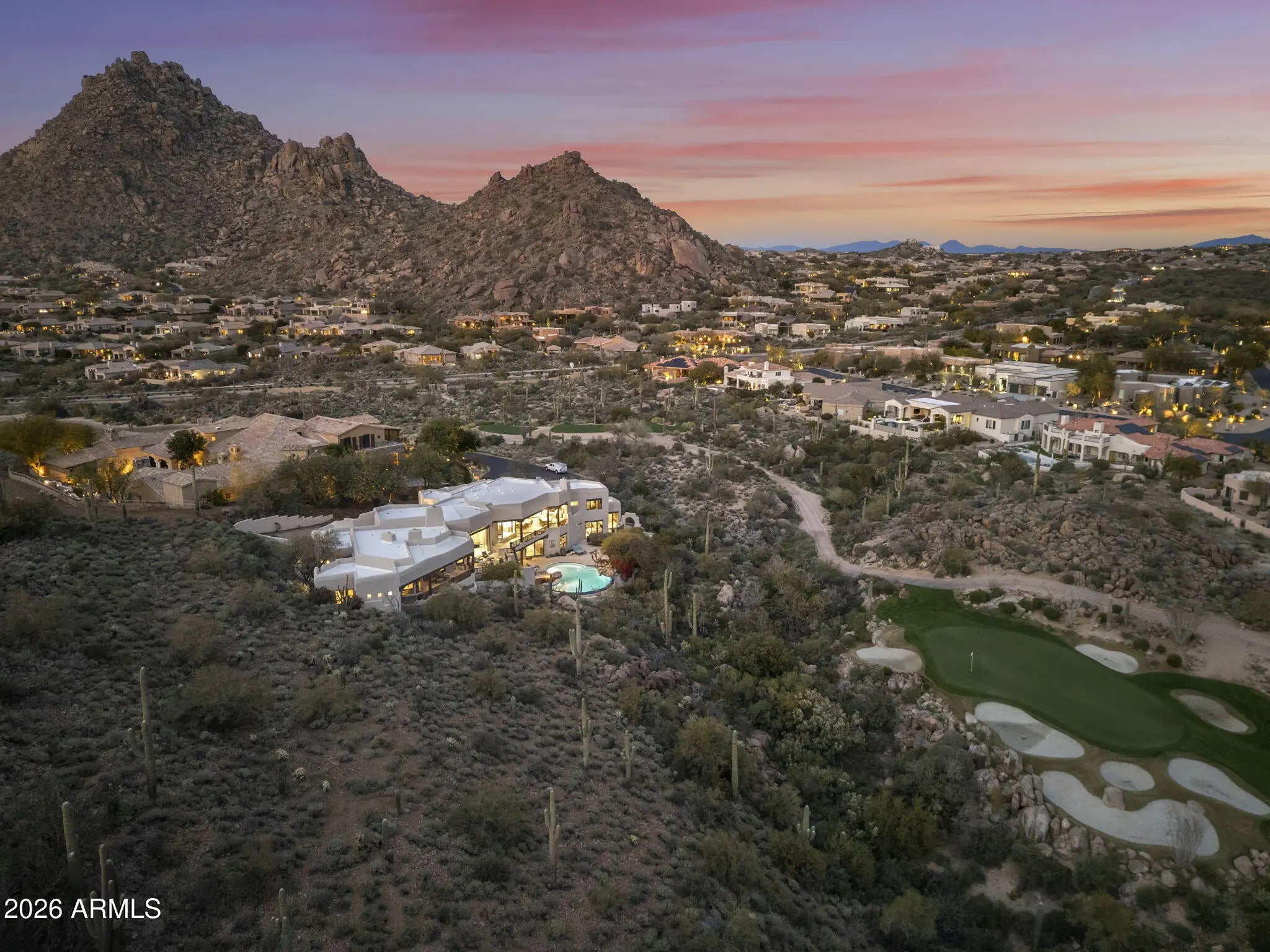 Commanding an extraordinary setting in the guard gated community of Glenn Moor in Troon Village, this estate is a rare convergence of architectural artistry, panoramic desert beauty, and refined luxury living. Perfectly positioned against the McDowell Mountain preserve and overlooking the Par 3 signature hole of Troon Country Club, the residence captures sweeping mountain silhouettes and golf course vistas that unfold from sunrise to sunset, creating a truly elevated living experience. Thoughtfully enhanced with significant updates, the home honors its Southwest-territorial roots while introducing a modern, sophisticated aesthetic. Recent improvements include a beautifully updated kitchen, a reimagined great room designed for grand yet comfortable entertaining, refreshed flooring throughout, exterior paint and wood sealing, and a fully remodeled lower-level with 2 bedrooms, a kitchenette and secondary family room for guests or multi-generational living. Architectural details define the home's character. Exposed wood beams, custom stone and plaster fireplaces, expansive walls of glass, and curated finishes create a warm, elevated atmosphere that blends seamlessly with the surrounding desert landscape. Generous living and entertaining spaces flow effortlessly, complemented by a striking wine display and thoughtfully designed gathering areas that invite both intimate evenings and large-scale entertaining. Designed to celebrate Arizona's coveted indoor-outdoor lifestyle, multiple covered patios, balconies, and view decks extend the living spaces into the natural surroundings. A resort-style pool terrace is perfectly positioned to enjoy serene privacy, dramatic mountain backdrops, and unforgettable sunsets, offering an ideal setting for entertaining or quiet relaxation. Every outdoor space has been oriented to maximize views, privacy, and connection to the landscape. Set within one of North Scottsdale's most sought after luxury enclaves, the property offers a rare sense of seclusion while remaining moments from golf, world-class hiking and biking trails, upscale dining, and shopping. This location balances luxury, recreation, and tranquility in equal measure.