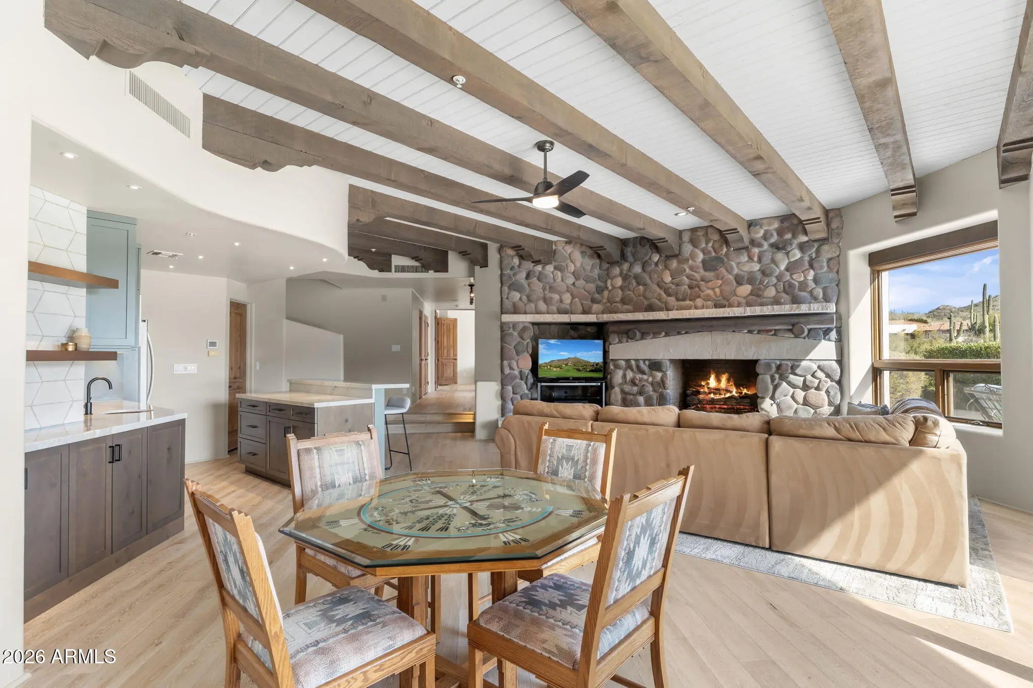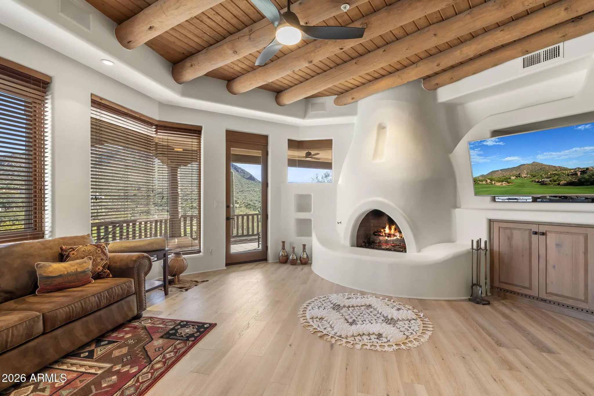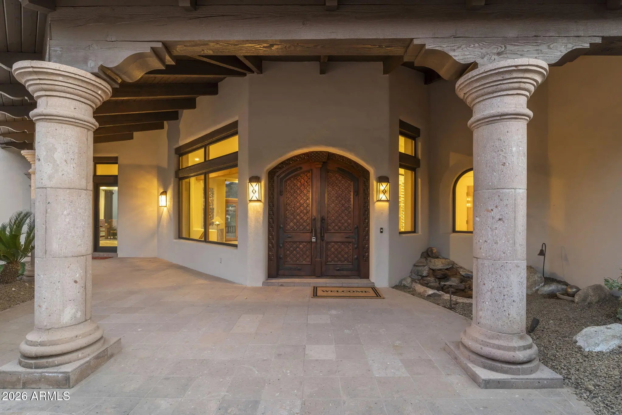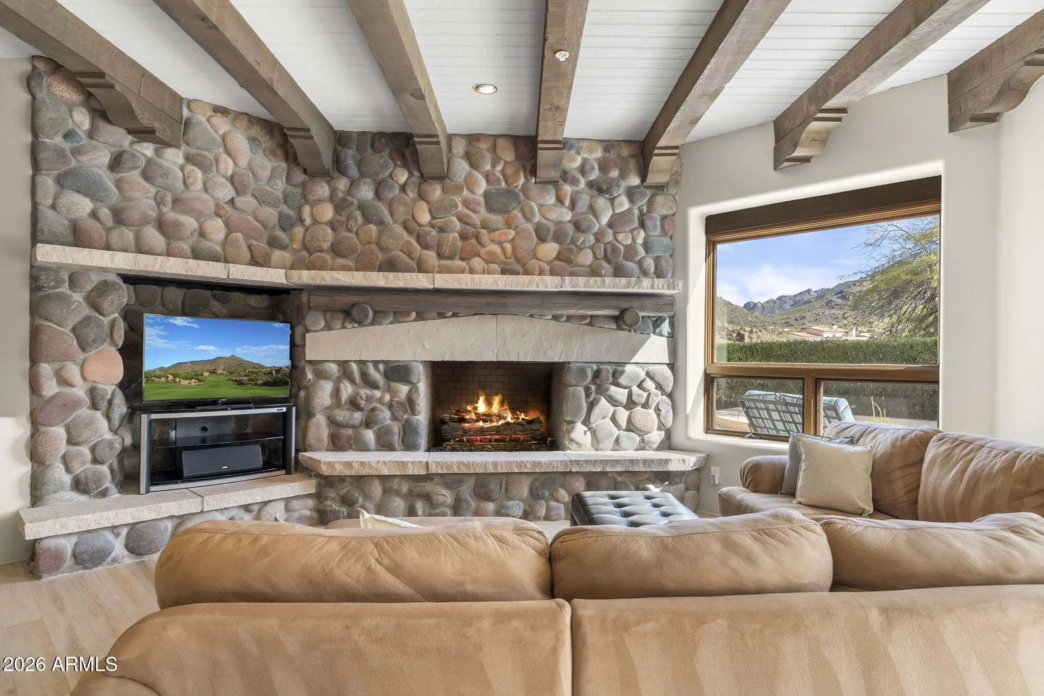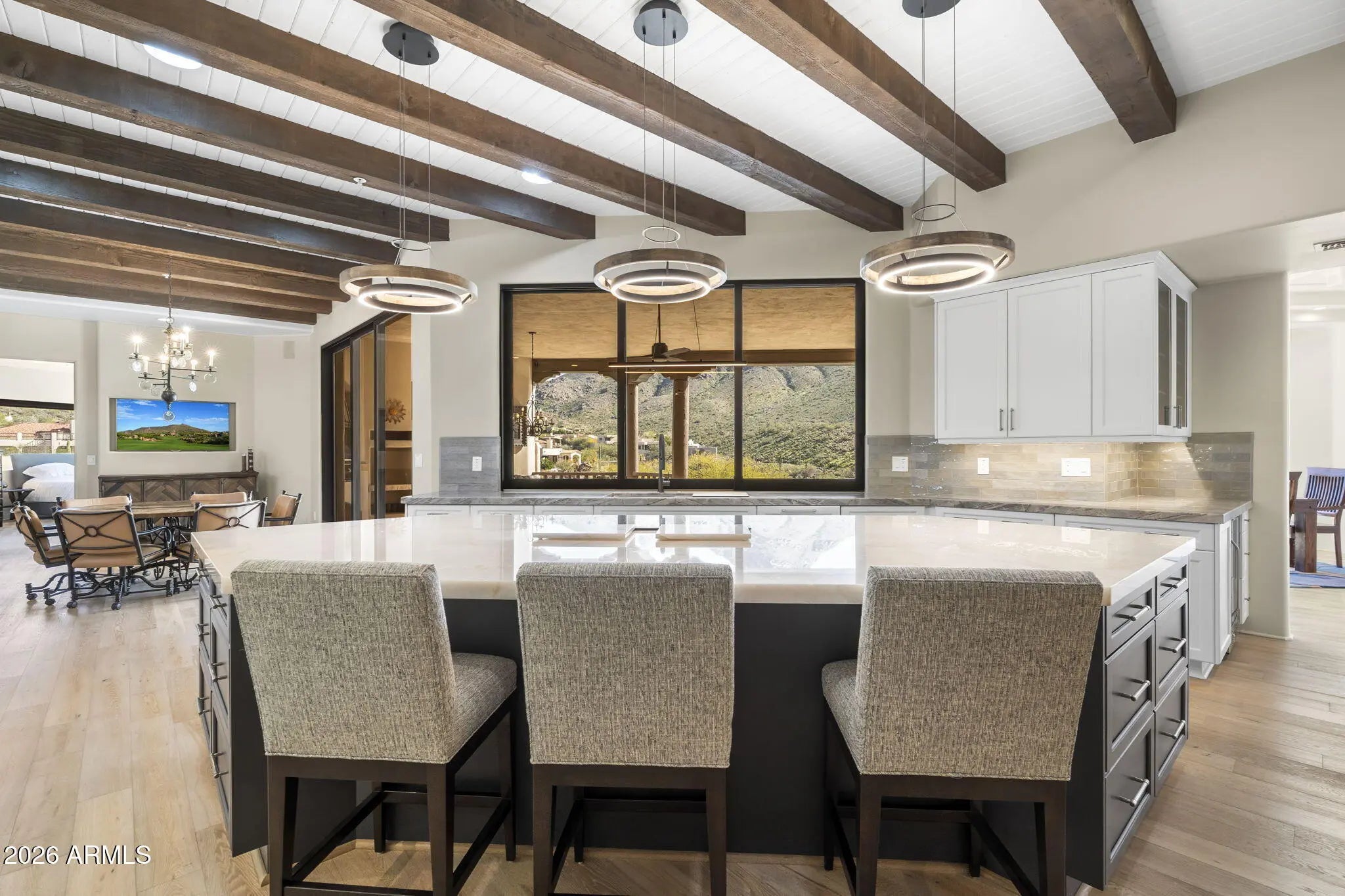 Commanding an extraordinary setting in the guard gated community of Glenn Moor in Troon Village, this estate is a rare convergence of architectural artistry, panoramic desert beauty, and refined luxury living. Perfectly positioned against the McDowell Mountain preserve and overlooking the Par 3 signature hole of Troon Country Club, the residence captures sweeping mountain silhouettes and golf course vistas that unfold from sunrise to sunset, creating a truly elevated living experience. Thoughtfully enhanced with significant updates, the home honors its Southwest-territorial roots while introducing a modern, sophisticated aesthetic. Recent improvements include a beautifully updated kitchen, a reimagined great room designed for grand yet comfortable entertaining, refreshed flooring throughout, exterior paint and wood sealing, and a fully remodeled lower-level with 2 bedrooms, a kitchenette and secondary family room for guests or multi-generational living. Architectural details define the home's character. Exposed wood beams, custom stone and plaster fireplaces, expansive walls of glass, and curated finishes create a warm, elevated atmosphere that blends seamlessly with the surrounding desert landscape. Generous living and entertaining spaces flow effortlessly, complemented by a striking wine display and thoughtfully designed gathering areas that invite both intimate evenings and large-scale entertaining. Designed to celebrate Arizona's coveted indoor-outdoor lifestyle, multiple covered patios, balconies, and view decks extend the living spaces into the natural surroundings. A resort-style pool terrace is perfectly positioned to enjoy serene privacy, dramatic mountain backdrops, and unforgettable sunsets, offering an ideal setting for entertaining or quiet relaxation. Every outdoor space has been oriented to maximize views, privacy, and connection to the landscape. Set within one of North Scottsdale's most sought after luxury enclaves, the property offers a rare sense of seclusion while remaining moments from golf, world-class hiking and biking trails, upscale dining, and shopping. This location balances luxury, recreation, and tranquility in equal measure.