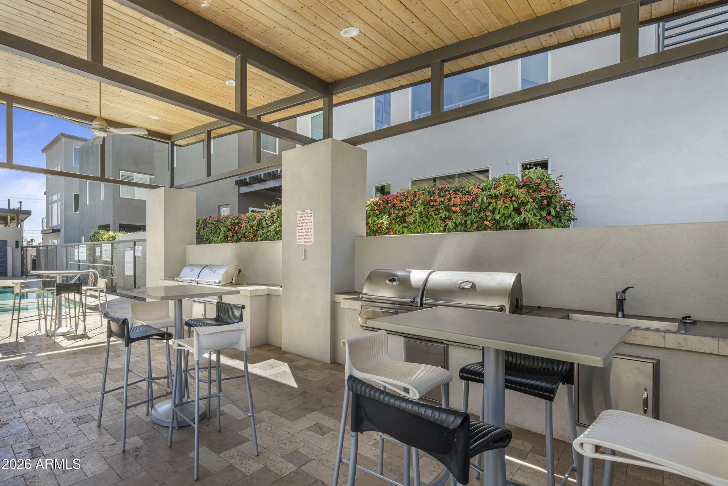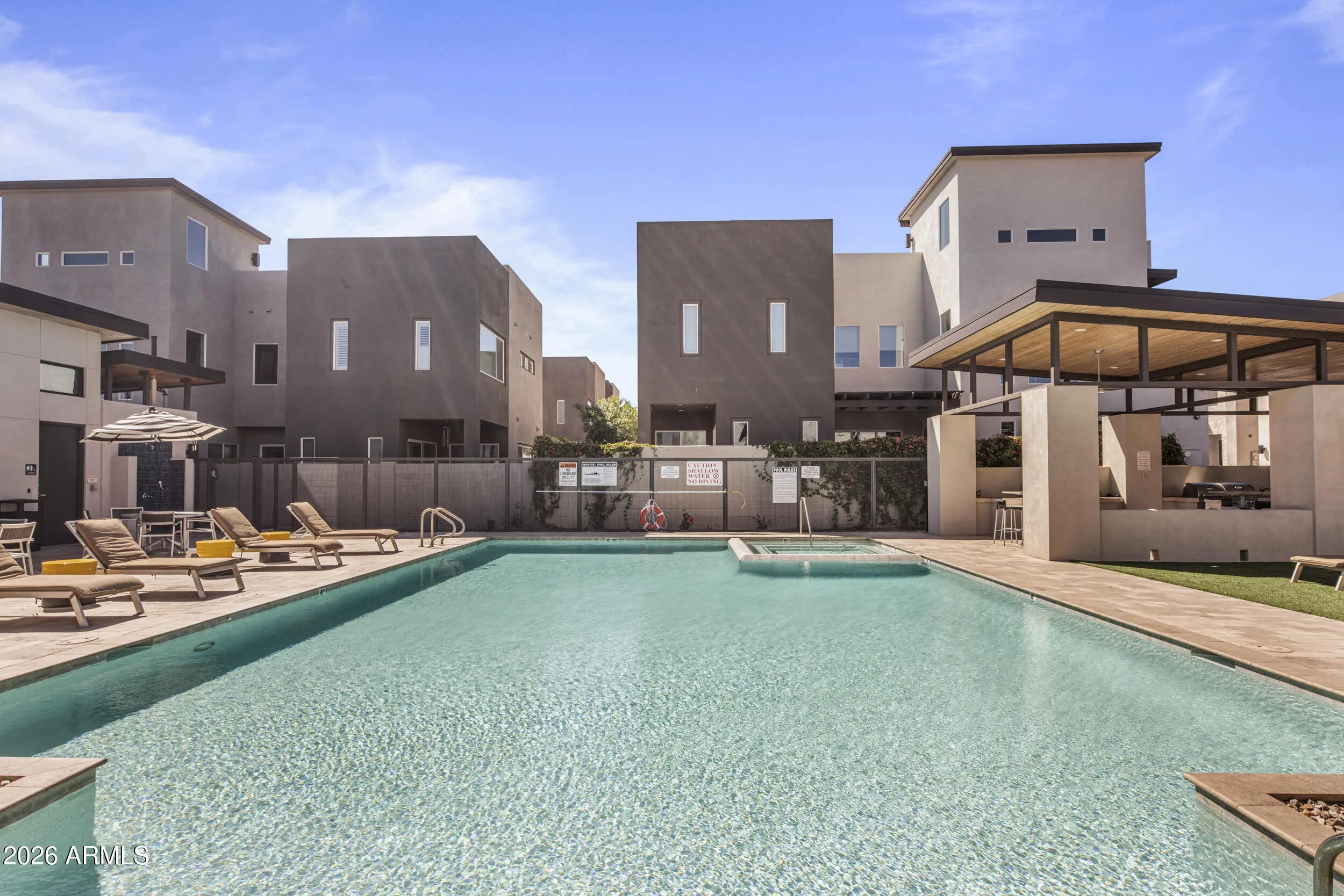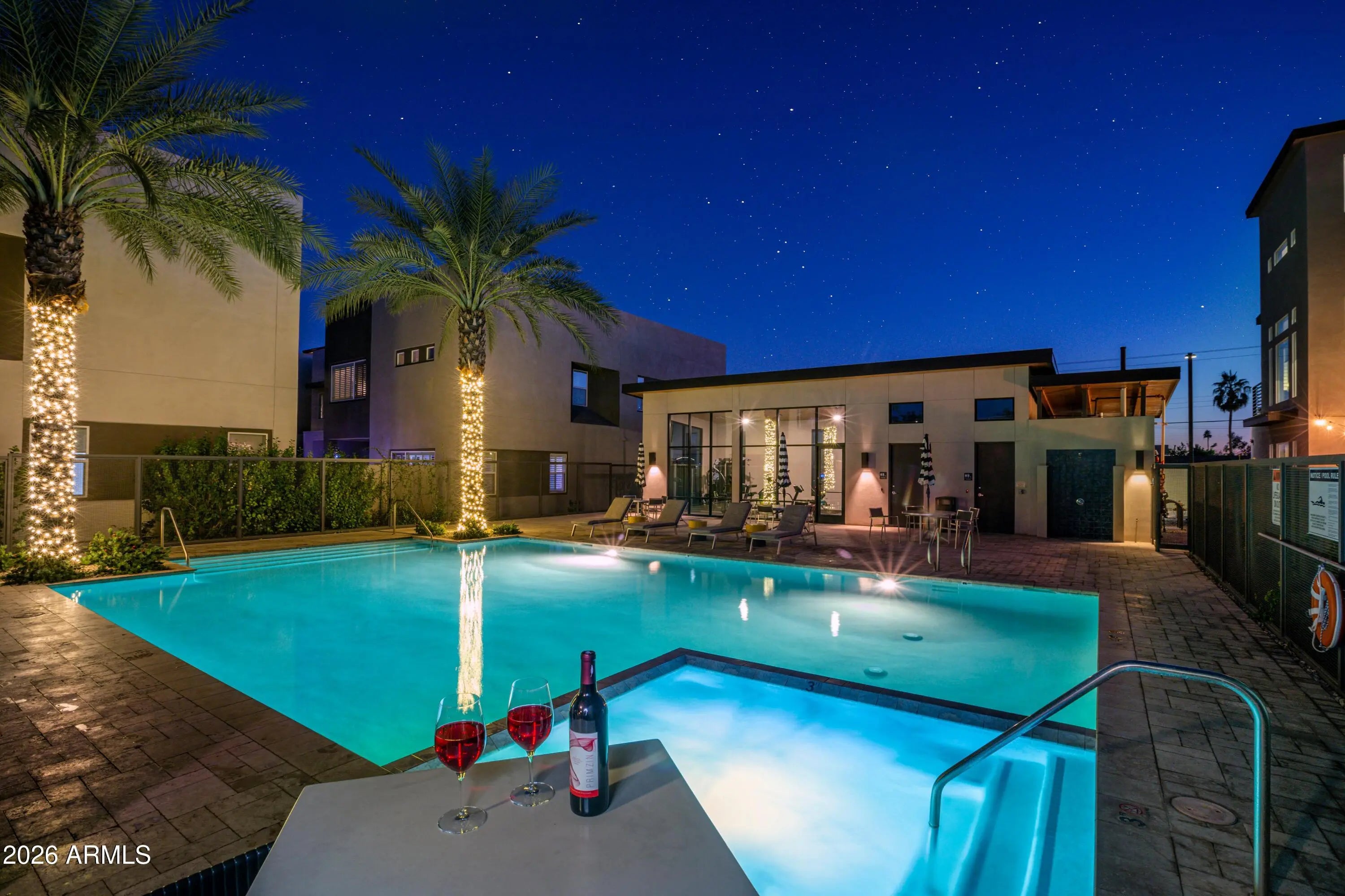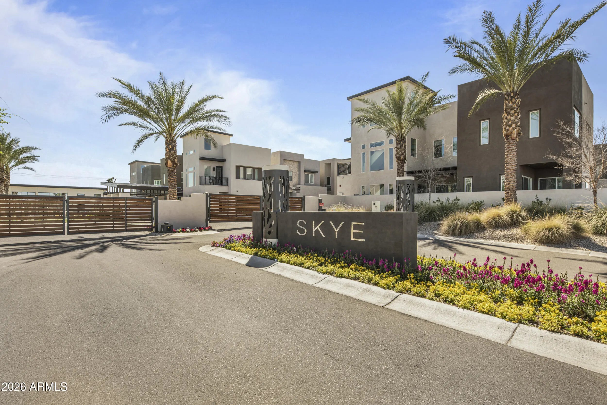 Discover Scottsdale luxury living in this stunning turn key single family detached home located in the gated community of Skye On McDowell.This light filled end unit features: luxury hardwood floors, a custom bar with 2 wine fridges, gourmet kitchen with gas cooktop, expansive island, & spacious walk-in pantry; Open floor plan; loft area with office, luxury cabinetry, & 2 Thermador beverage fridges; custom plantation shutters & upgraded additional cabinetry throughout; Freshly painted exterior & roof recoated in 2024; Community amenities such as pool, spa, fitness center, & outdoor kitchen; Perfect for relaxation, the home features 2 covered patios & a balcony with multiple sliders leading out to manicured landscaping with artificial turf & limestone pavers creating indoor/outdoor living.