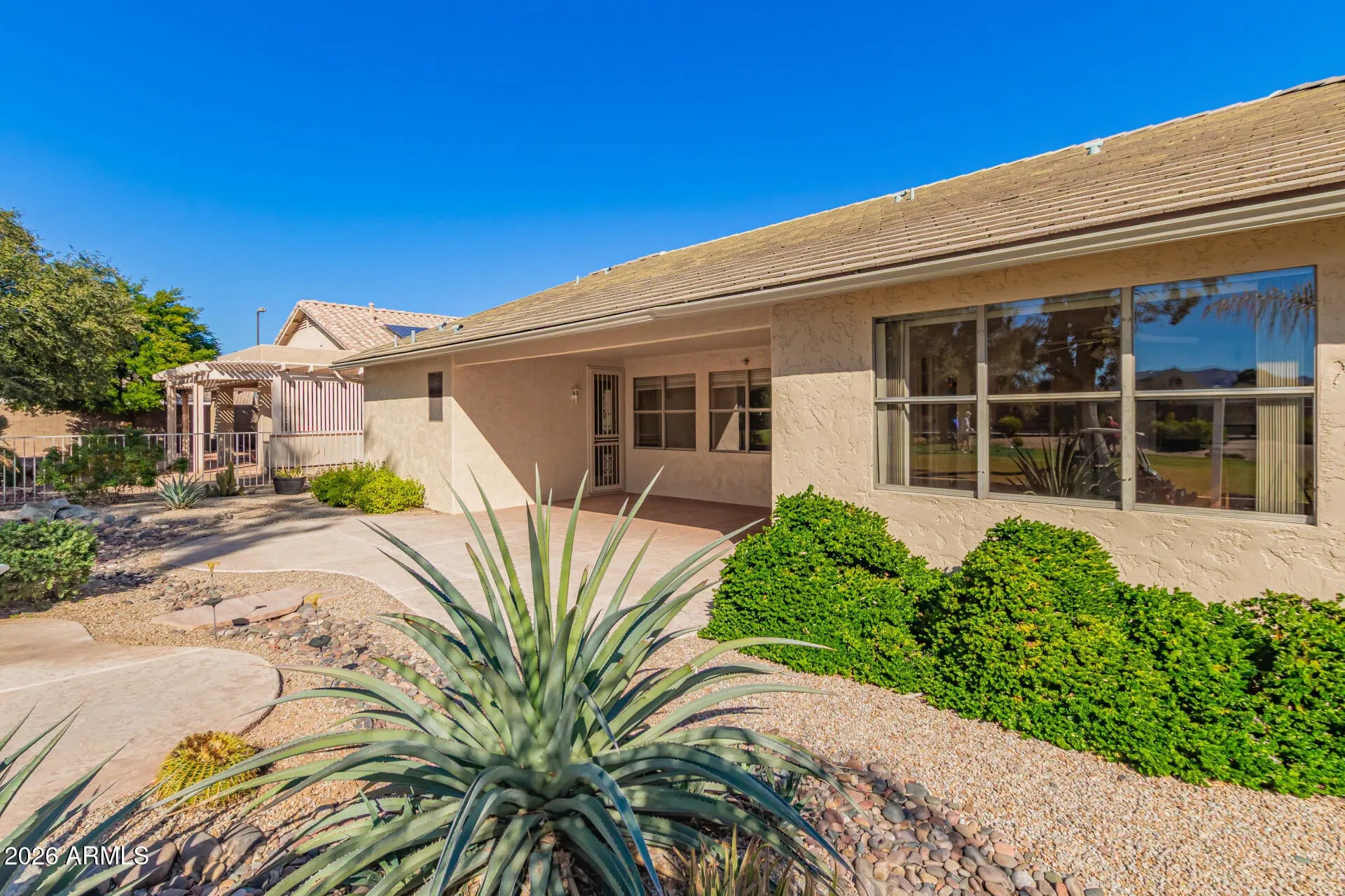 Golf course living with mountain views! This beautifully updated home is located on the tee of the 16th hole in the desirable Arizona Traditions community. Offering 1,911 sq ft, the home features 2 bedrooms plus a den with built-in cabinetry, 2.5 bathrooms and an extended depth garage. Recent upgrades include a new roof in 2018, new interior and exterior paint in 2025, new carpet, and a newer 14 SEER HVAC system installed in 2023. Enjoy a well-designed layout with abundant natural light and scenic views. Walking distance to the clubhouse, fitness center, activity center, pools, pickle ball and tennis courts. Resort-style living at its best!