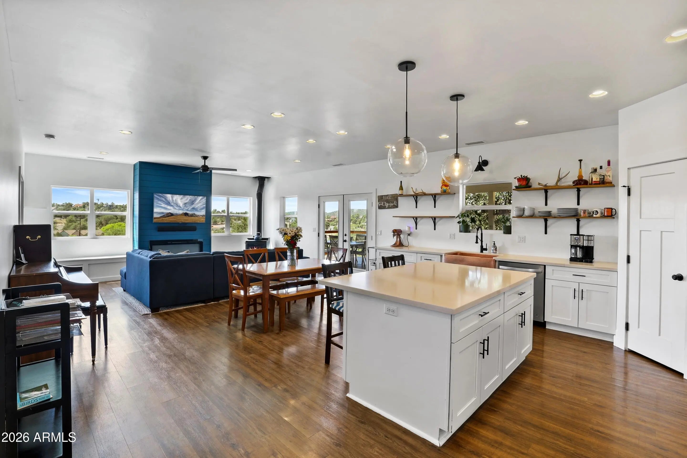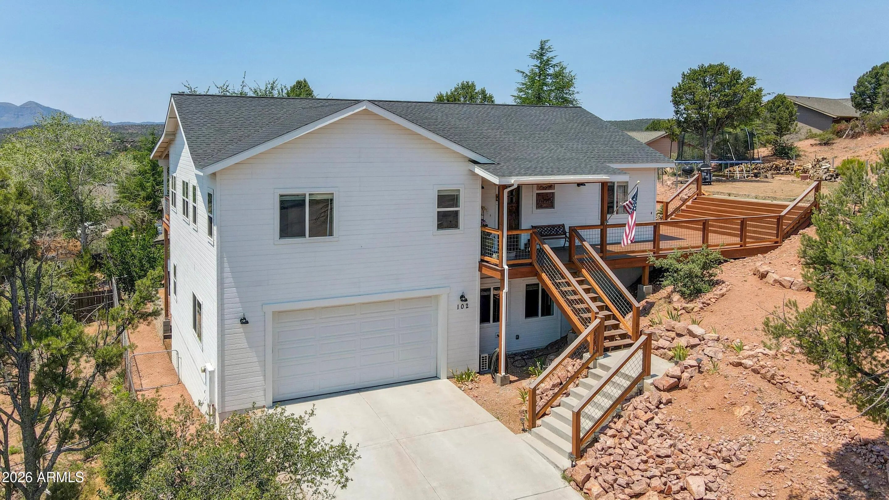 Perched on a private hilltop in a quiet cul-de-sac, this 2017 residence offers panoramic views and a thoughtfully designed split floor plan with no HOA. Three bedrooms are located upstairs, while a private bedroom suite downstairs provides added flexibility. The open great room connects seamlessly to a newly remodeled wraparound deck, creating an elevated indoor-outdoor experience. Enhancements include central heat and air, ceiling fans throughout, and a wood stove fireplace added in 2023. The kitchen features Whirlpool appliances, a copper sink, island, and walk-in pantry. A fully fenced yard, 2-car garage, and workshop complete this centrally located Payson home near parks, trails, dining, and medical care.