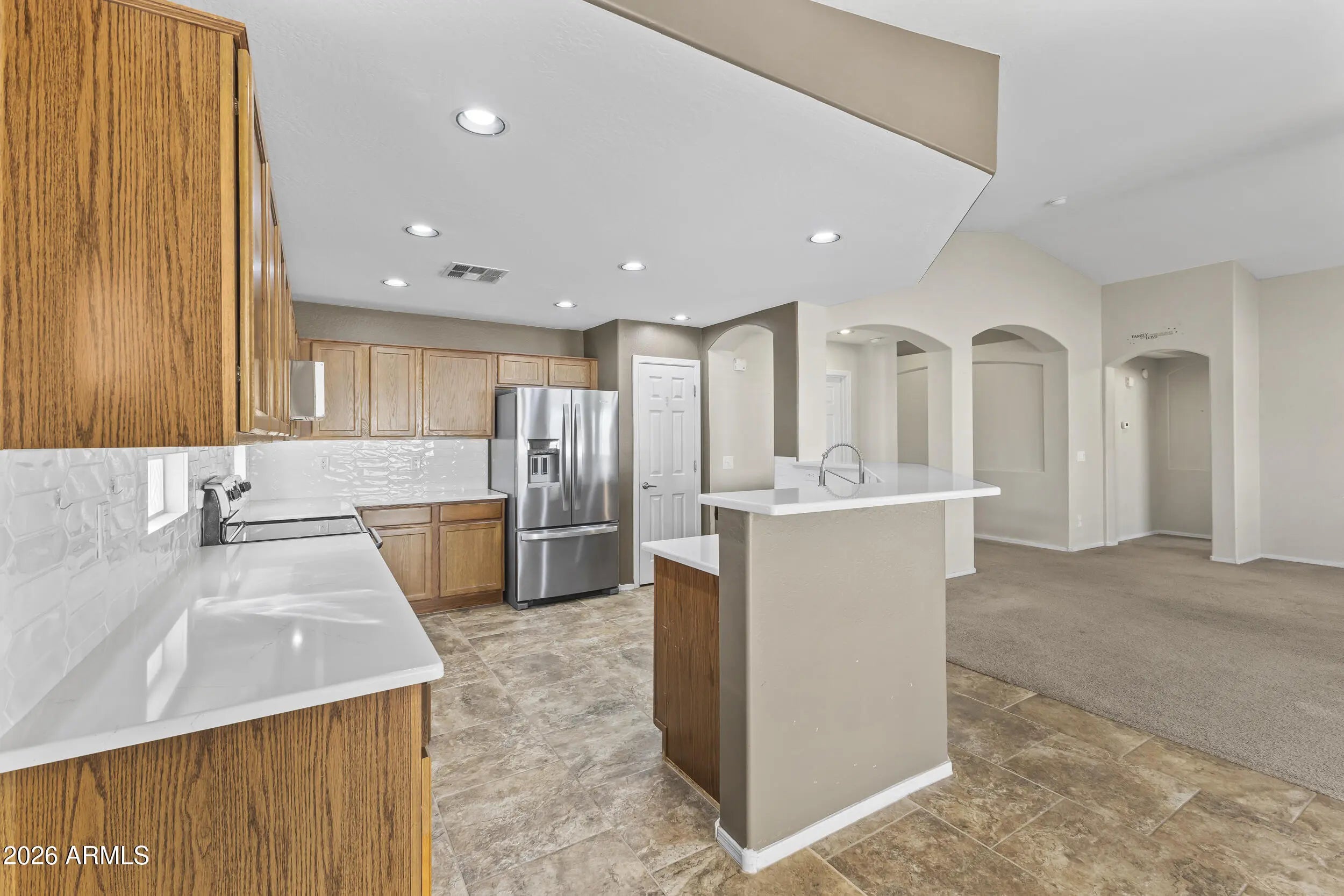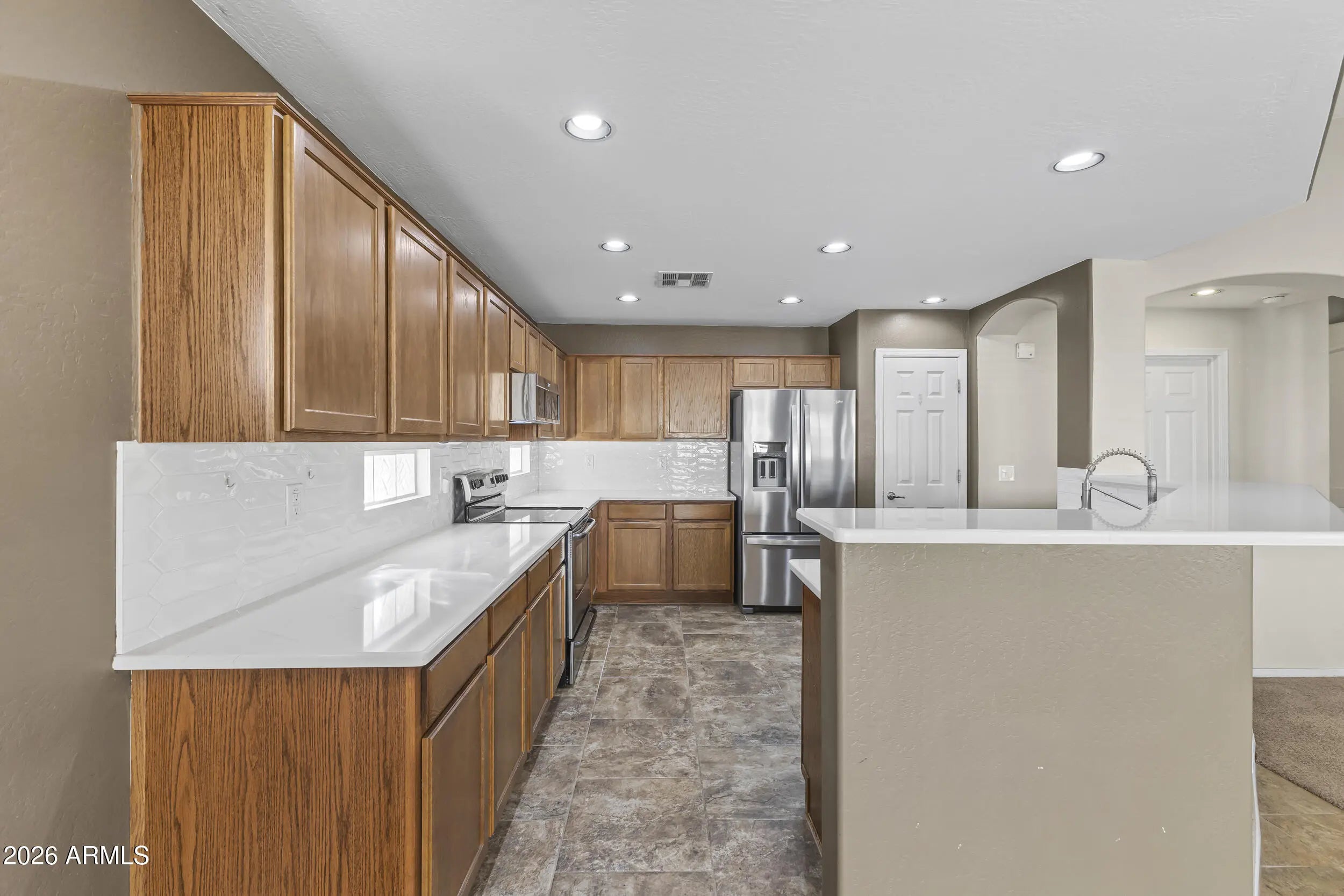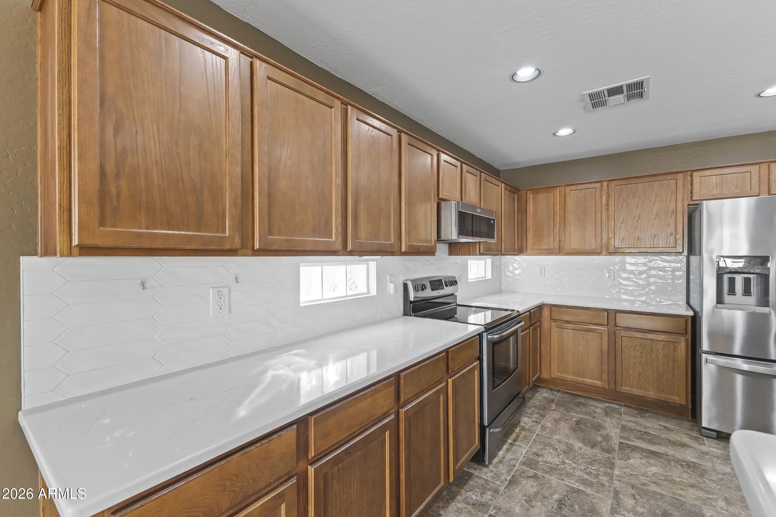 Welcome to this move-in ready 3-bedroom, 2-bath single-story home situated on a spacious cul-de-sac lot in Surprise. Offering 1,806 sq ft of well-designed living space, this popular split floor plan features vaulted ceilings and an open great room that seamlessly connects the living, dining, and kitchen areas. A welcoming foyer and wide hallway create a strong first impression, guiding you naturally into the heart of the home. The kitchen has been refreshed with new quartz countertops and a modern backsplash and is equipped with stainless steel appliances, including a French door refrigerator installed in 2025 and a low-profile microwave hood combo added in 2023. Private primary bedroom features an en-suite bath and walk-in closet and is thoughtfully separated from the secondary bedrooms. A major investment was made in 2025 to replace all windows and the patio door, providing improved energy efficiency, comfort, and long-term value. Additional highlights include a soft water loop and water heater replaced in 2021. Step outside to a large low-maintenance turf yard ideal for year-round outdoor enjoyment. RV gate with extended side yard offers plenty of room for outdoor living, extra storage, or future customization. Thoughtfully maintained and designed for comfort and functionality, this home offers space, flexibility, and a convenient layout. Ideally located near Surprise City Center, this home is within walking distance to the award-winning, A-rated Freedom Traditional Academy and Valley Vista High School. Enjoy close proximity to the Surprise Aquatic Center, Surprise Library, and Surprise Stadium, offering year-round recreation, events, and community amenities.