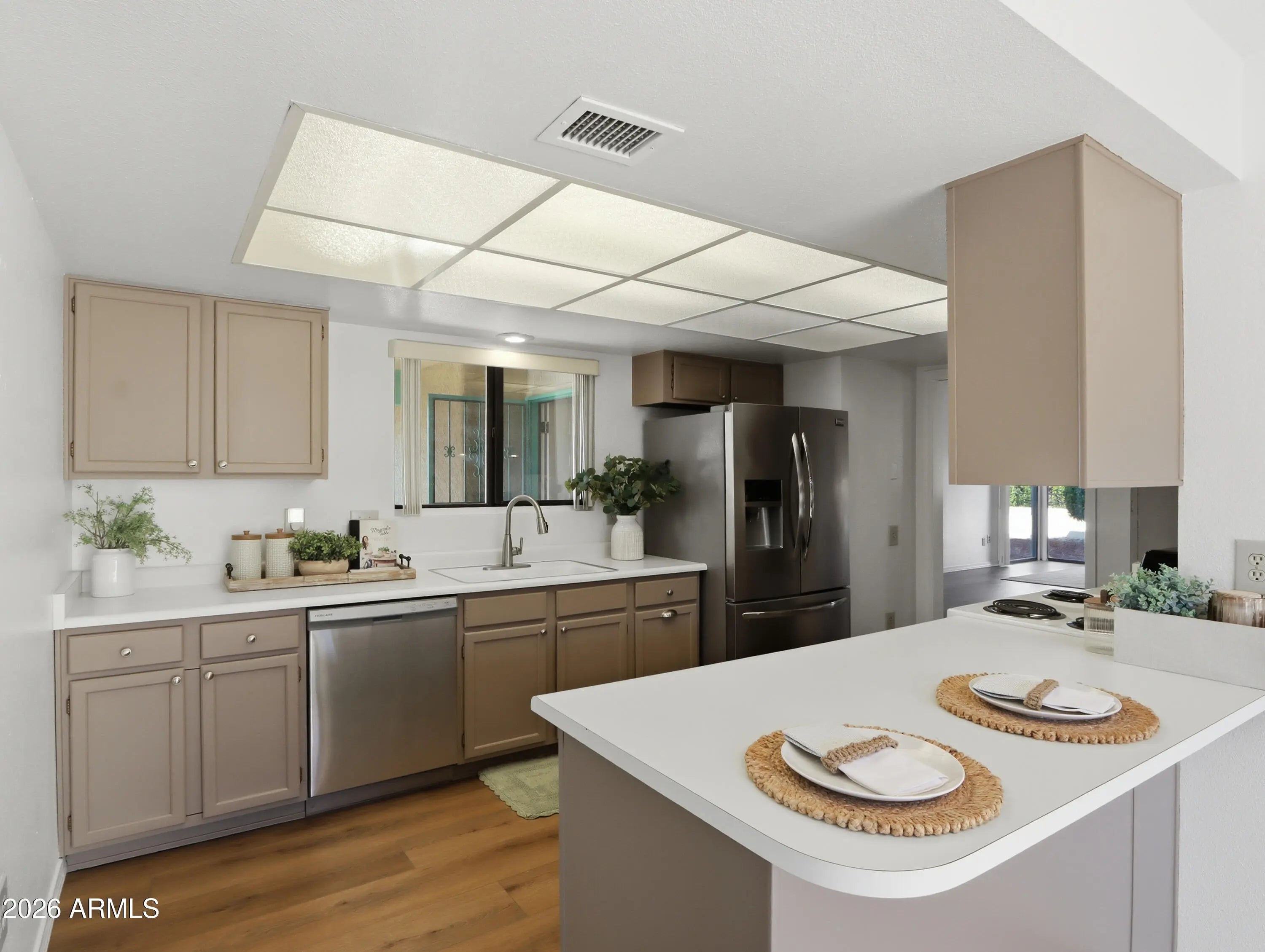 No HOA! Move-in ready and beautifully refreshed, this 1,465 sqft corner LARGE lot offers comfort and affordability. Step inside to discover new beachwood flooring, oversized baseboards, fresh interior paint, updated light fixtures, ceiling fans, and modern hardware throughout. The thoughtfully designed dual primary suite layout provides privacy and flexibility, with each suite featuring a walk-in closet and a beautifully updated bathroom complete with new vanities, hardware, and toilets. Enjoy peace of mind with a newer HVAC system and water heater. The home also boasts two inviting patio spaces--an enclosed patio off the dining/kitchen area and an open patio off the main living space--perfect for morning coffee, entertaining, or relaxing among the fruit trees. Additional highlights include a freshly painted 2-car garage with ample storage. Conveniently located near shopping, dining, medical facilities, golf courses, and recreation centers, this home checks all the boxes for easy, active living.
