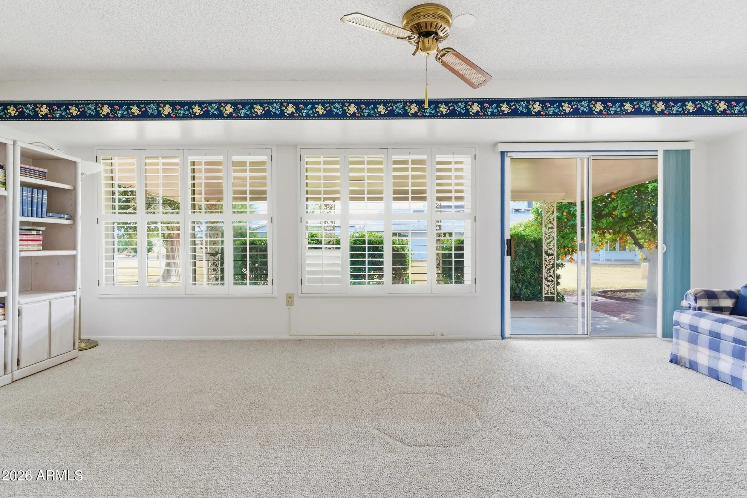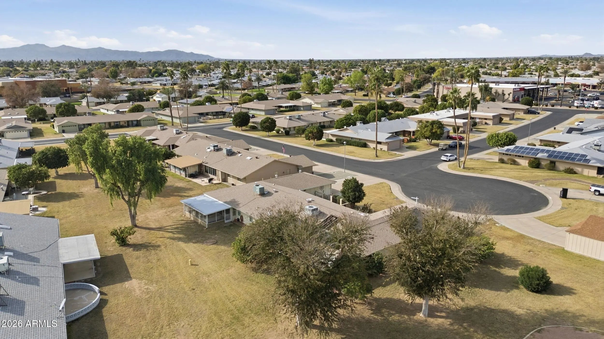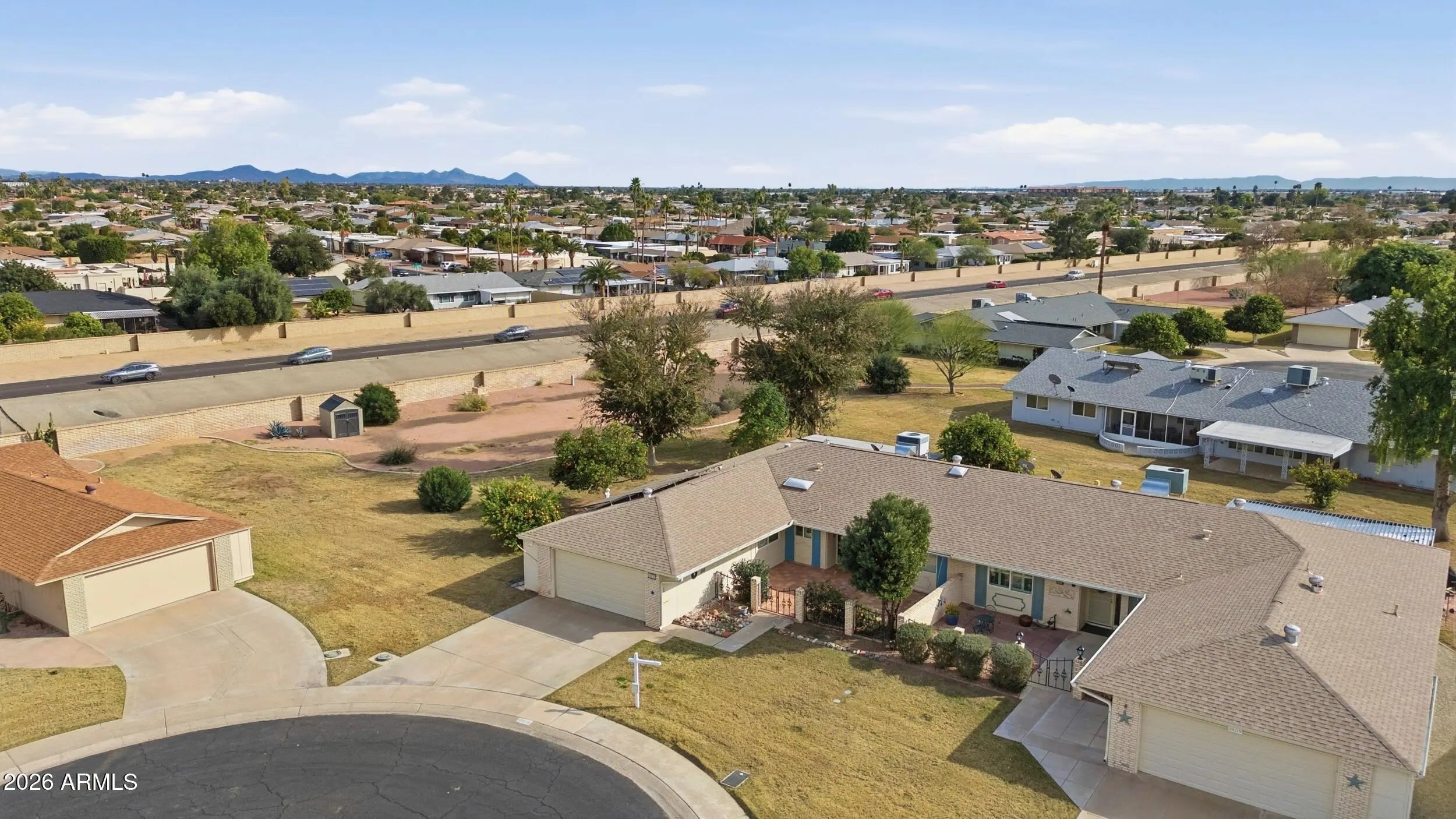 FANTASTIC OPPORTUNITY to purchase this LOVINGLY CARED-FOR HOME in a PREMIUM LOCATION at the end of a QUIET CUL-DE-SAC and next to a LARGE GREEN BELT*Near the EXTENSIVE and FUN AMENITIES that Sun City has to offer, but retains PEACE and PRIVACY*You will ENJOY the EAT IN KITCHEN and the formal dining that can be a FLEX AREA*The EXPANSIVE GREAT ROOM leads into an ARIZONA ROOM and PORCH*OWNER'S BEDROOM has UPDATED FLOORING and GUEST BEDROOM doubles as HOME OFFICE with MURPHY BED*You have the WARMTH of NATURAL LIGHT*ABUNDANT STORAGE throughout, includes EXTENSIVE CABINETRY at the OVERSIZED INSIDE LAUNDRY*The EXPANDED TWO-CAR garage has many CABINETS and SHELVES*SHUTTERS*You will LOVE the ENERGY EFFICIENCY of OWNED SOLAR PANELS*COME BY and see why YOU WILL WANT TO CALL THIS PLACE ''HOME''