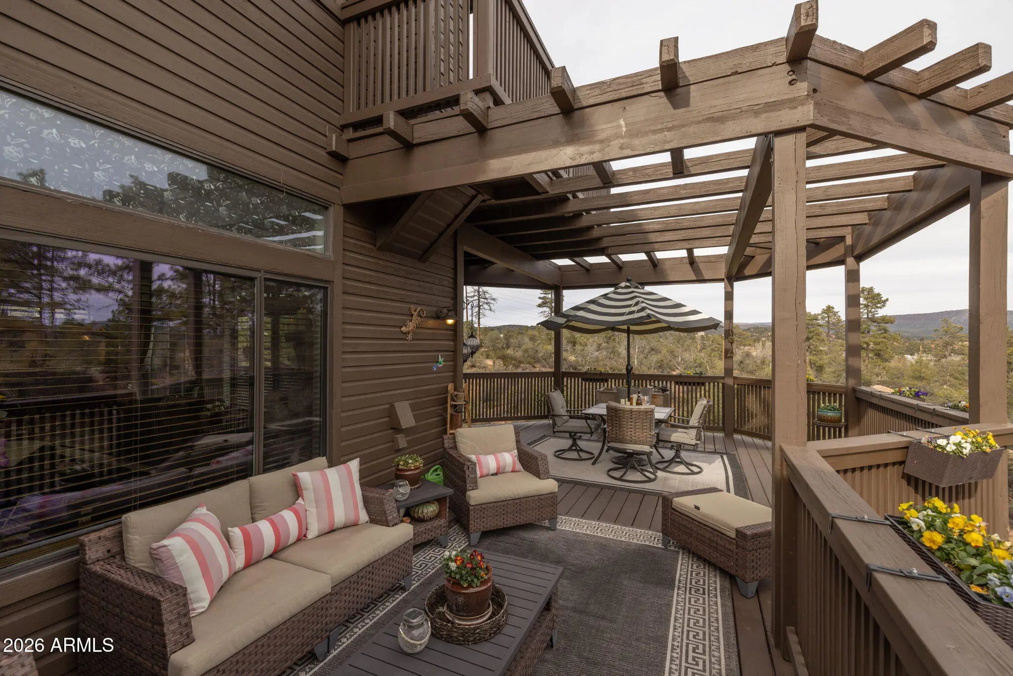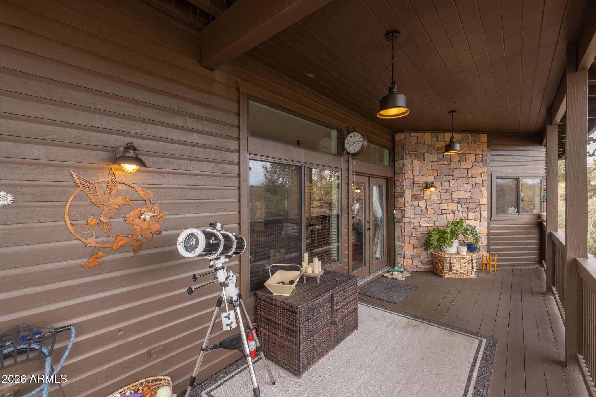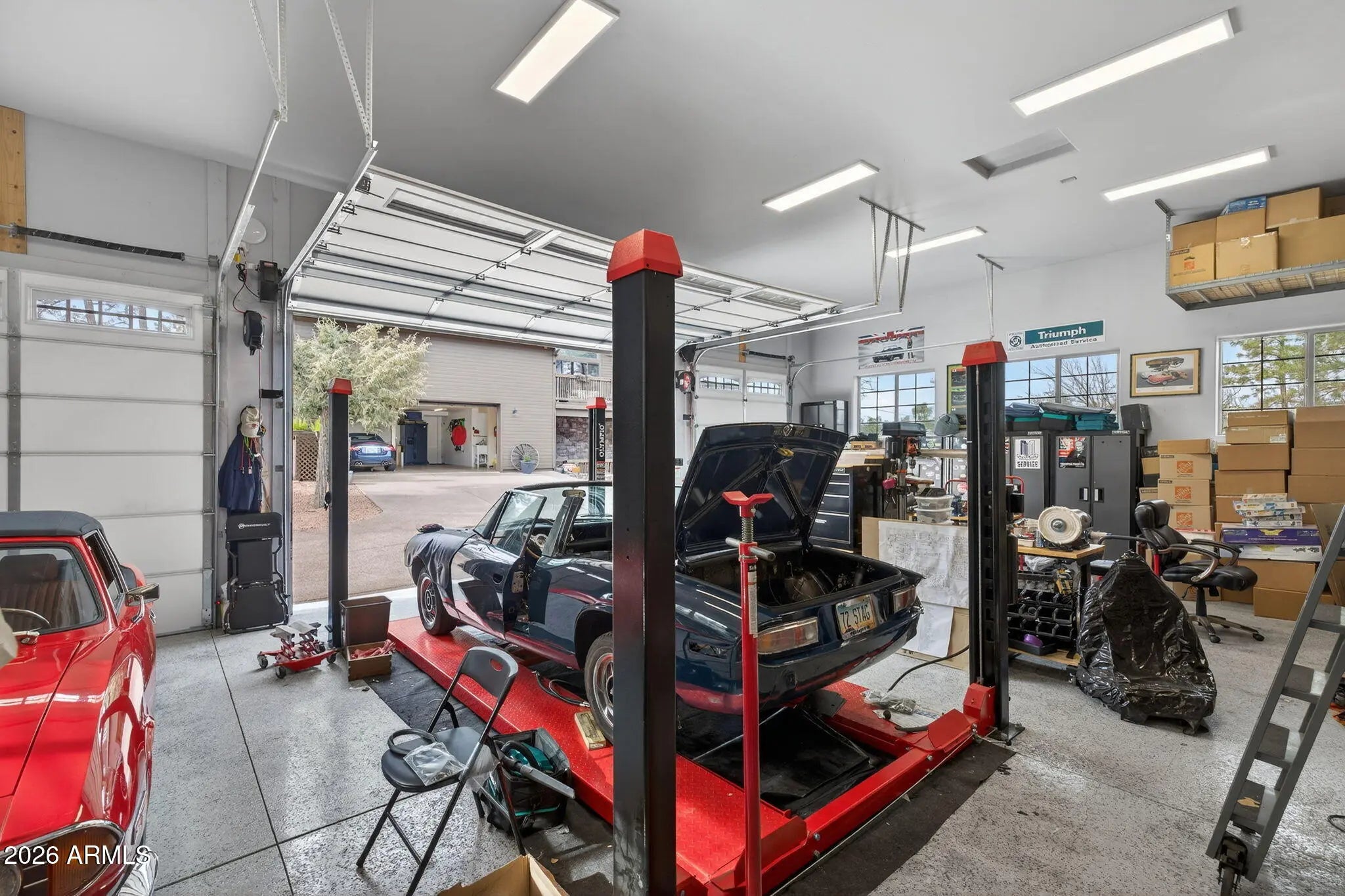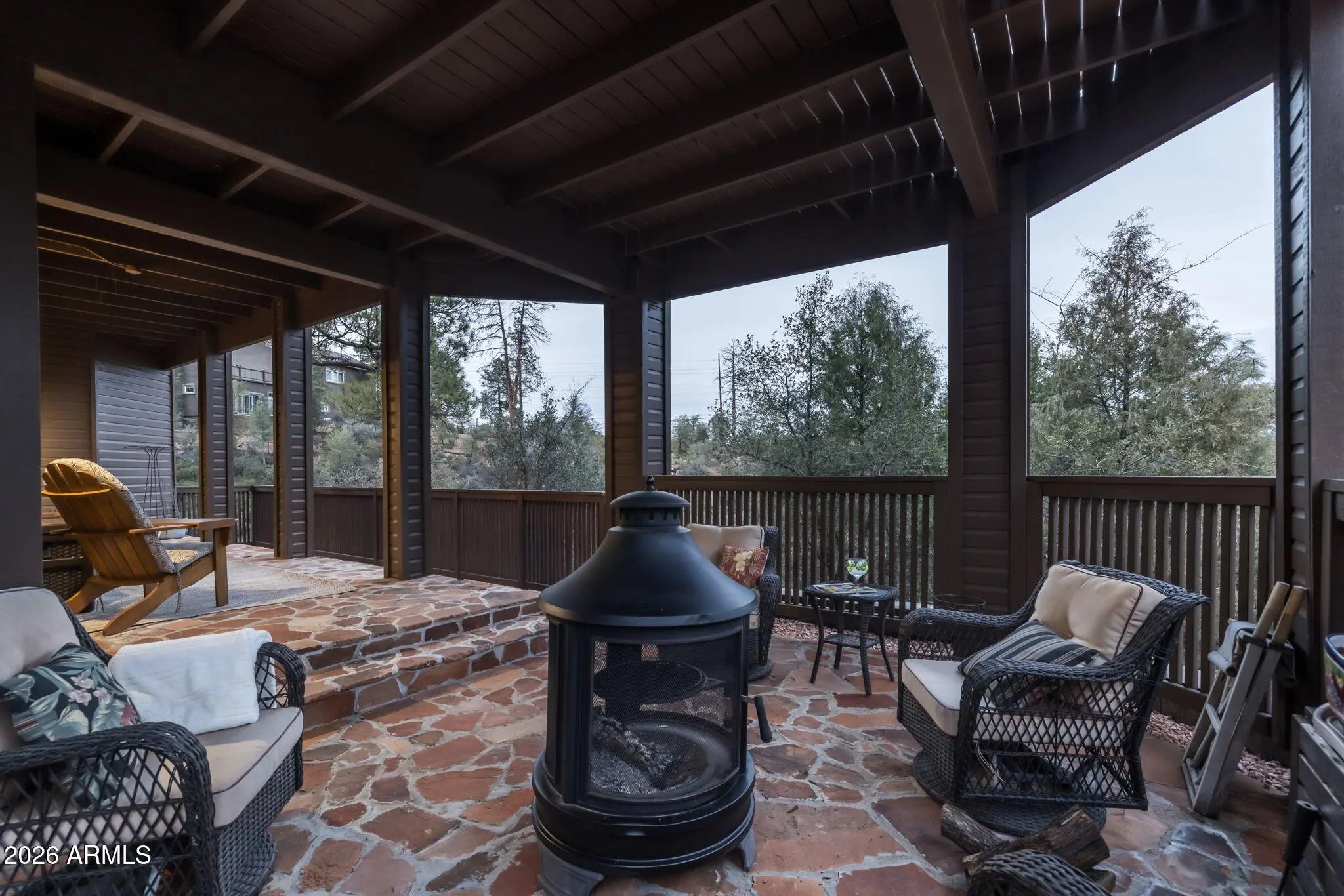 Beautifully appointed home with Mogollon Rim views and over 3600 livable square feet in the heart of Arizona, just 1.5 hours from Scottsdale, Arizona. 4 Bedrooms, 3 Baths, great room, den, downstairs family room, spacious laundry room, plenty of outdoor living that is covered and uncovered, private den/workshop/home gym/hobby room/tv room over the garage with plenty of natural light, attached 2-car garage and a separate 1200 sq ft 4 car garage with 1 lift, wall to ceiling storage with a sliding library ladder on 1.63+/- private usable land. The warm and welcoming foyer entry opens to the expansive great room with Brazilian pecan wooden floors and 4'' baseboards throughout and the perfect focal point is a stack stone wood burning stove for warmth and ambiance for those chilly days, plenty of wall space for furniture, plenty of windows and access to the charming private balcony to enjoy your morning sunrises. The stunning primary bathroom has a large walk-in shower, tile flooring, separate free-standing tub, double vanity and a walk-in closet. There are stairs that lead you down to the 2-car garage access and continue to the lower level with a sizeable family/tv/workout room which has plenty of natural light, access to the covered patio, a full bath and 2 bedrooms. There is plenty of storage and tasteful finishings. The 2-car garage offers plenty of storage, water softener, water circulation pump and a fire suppression system. There is a bonus room above the garage that makes for an office, exercise room, playroom or a hobby room. Plenty of light, windows and laminate wood flooring. The 4-car garage has 1 9000 LB lift, finished flooring shelving and 2 240 Volts in the ceiling and 1 hook in the wall. There are so many additional features, new roof, resurfaced the upper driveway, new screens, additional stone walls around the home for curb appeal, home has been painted inside and out, new lighting fixtures and landscaping. (there is a location in the home that an elevator can be added)